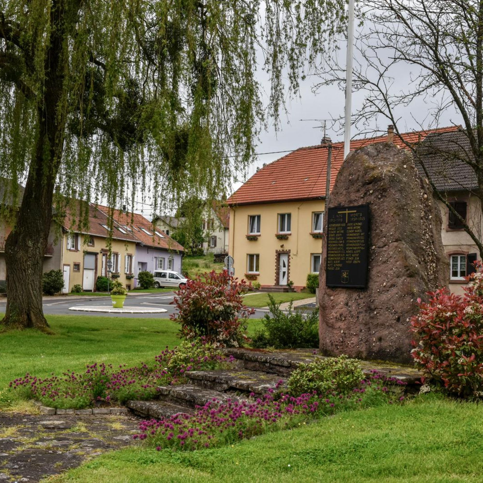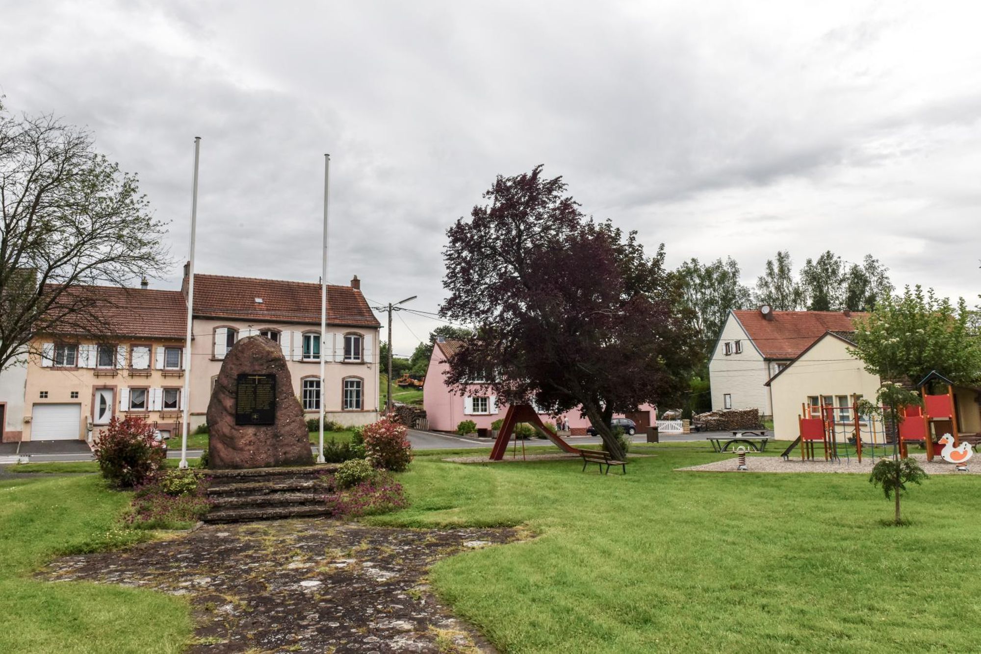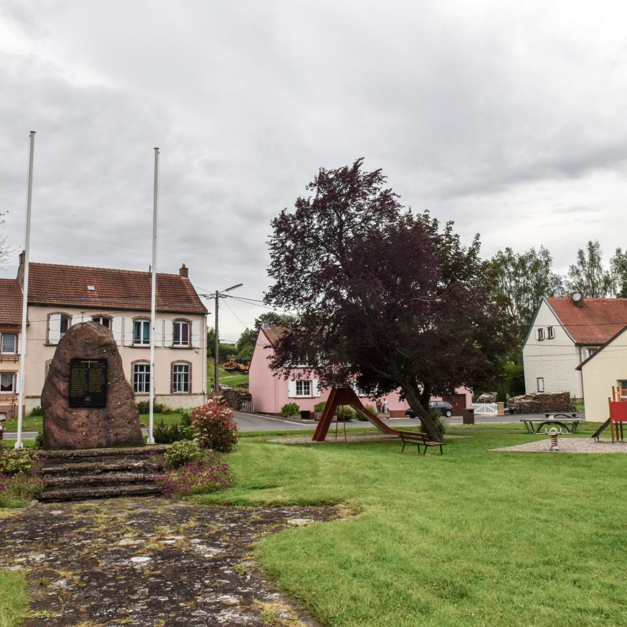 Dans un parc ouvert à côté d'une aire de jeu pour enfants. Entre la rue du Stade et la rue des Écoles.