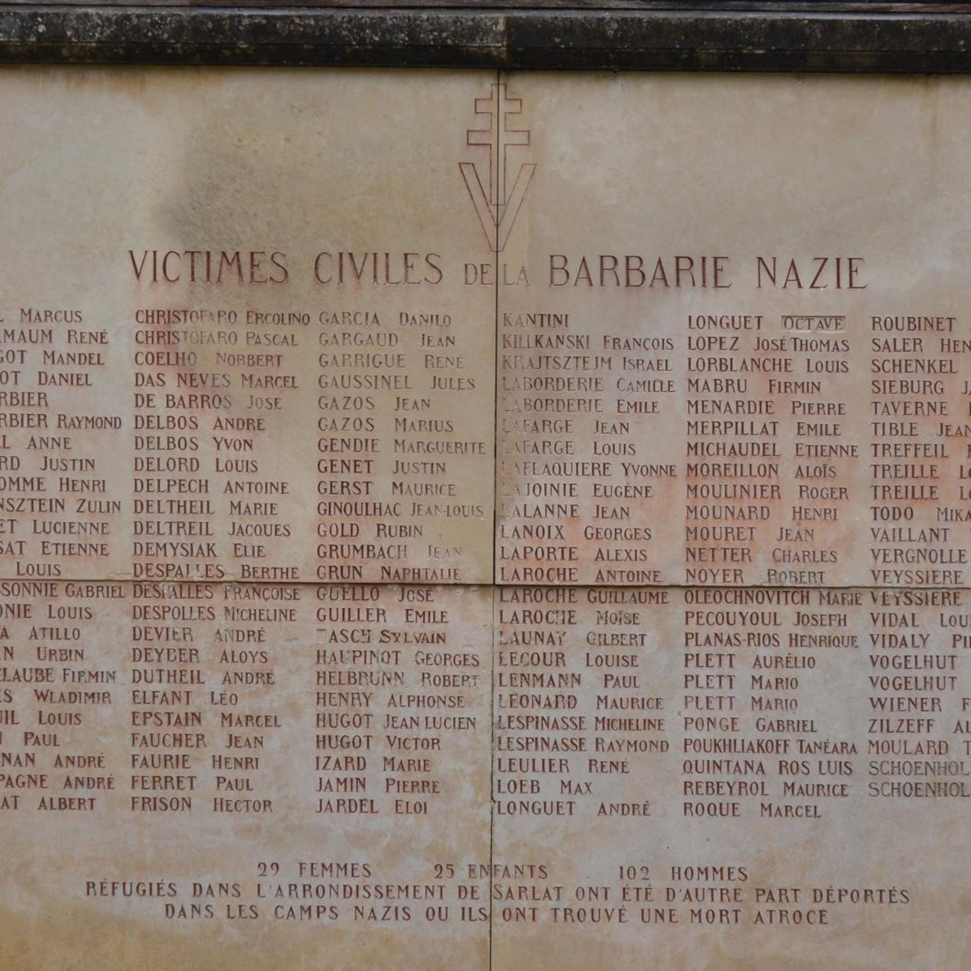 "29 femmes, 25 enfants, 102 hommes réfugiés dans l'arrondissement de Sarlat ont été d'autre part déportés dans les camps nazis où ils ont trouvé une mort atroce"