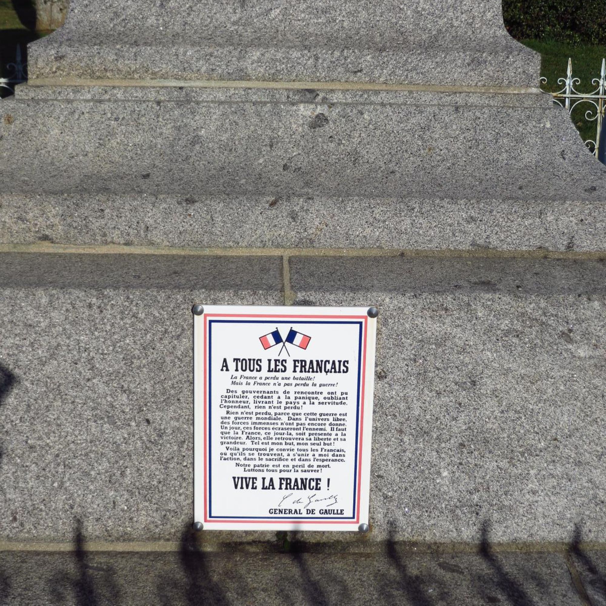 Une plaque émaillée reproduisant l'affiche "A tous les Français" ayant suivi l'appel du 18 juin 1940 a été ajoutée sur le socle du monument