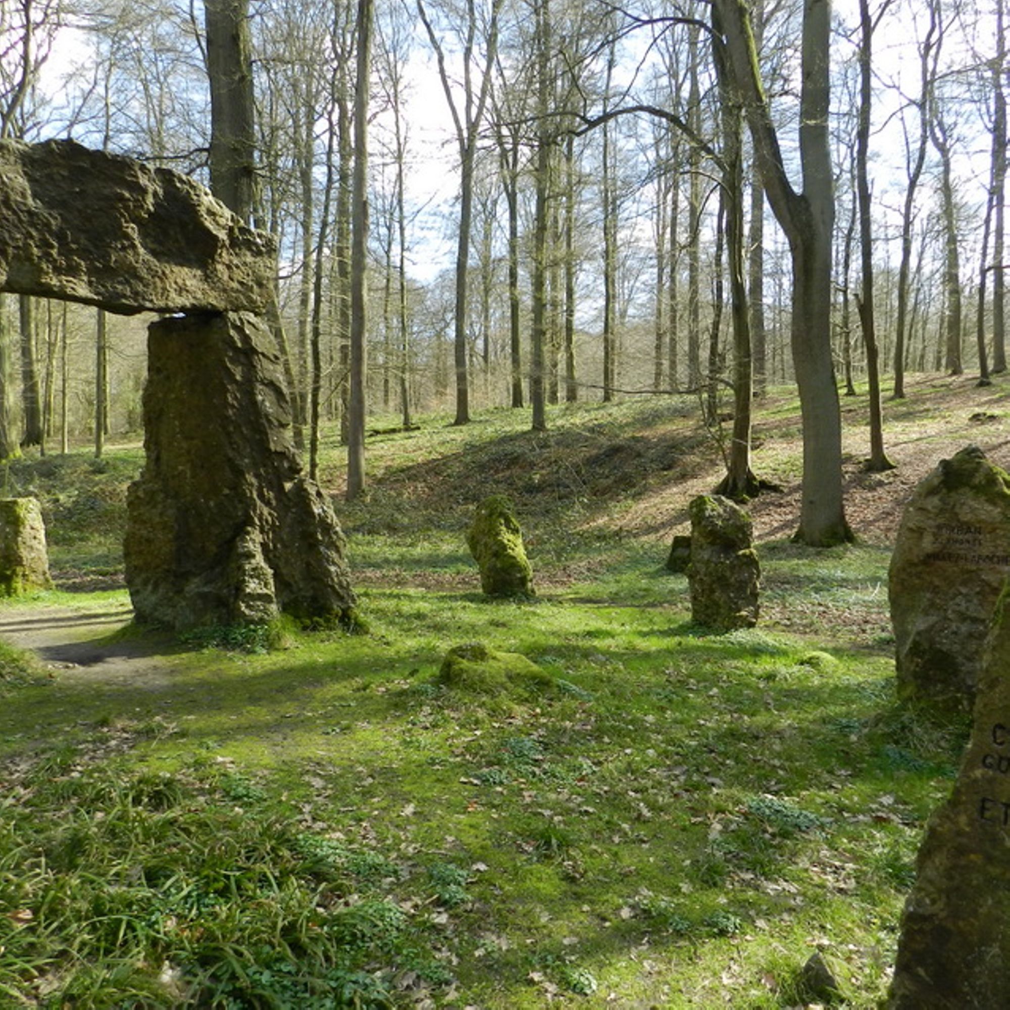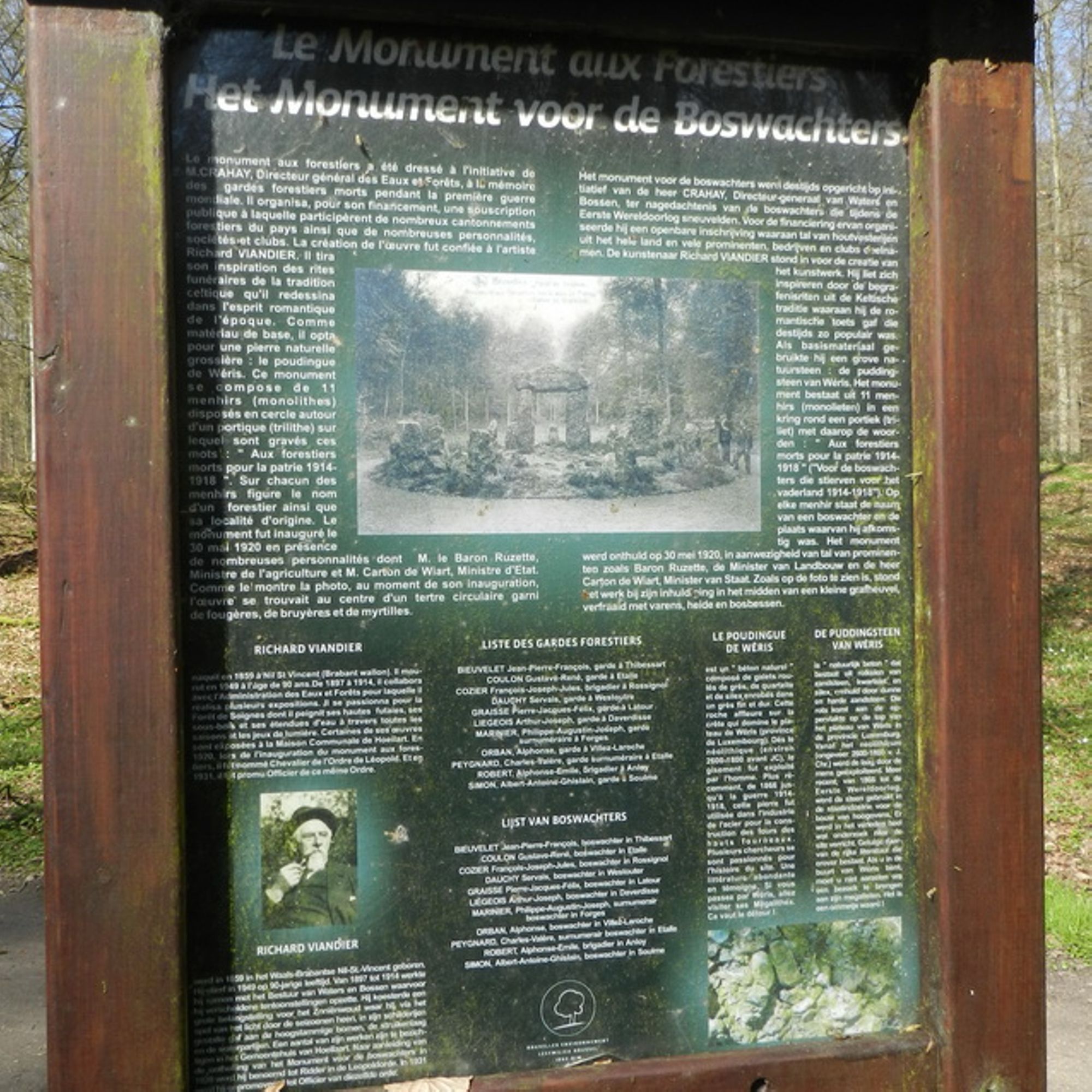 « Dans le sentier du Grasdelle (près du croisement de la drève du Haras et de la drève des Bonniers), les promeneurs intrigués découvriront un cromlech, cercle formé de 11 petits menhirs. À la lecture des inscriptions, ils apprendront que ce monument fut érigé en 1920, à la mémoire de 11 gardes forestiers tués lors de la Première Guerre Mondiale. Bien qu'aucun de ces forestiers n'ait servi en Soignes, cette œuvre de l'artiste hoeilaartois Richard Viandier fut placée ici en hommage à la beauté majestueuse de la forêt. »