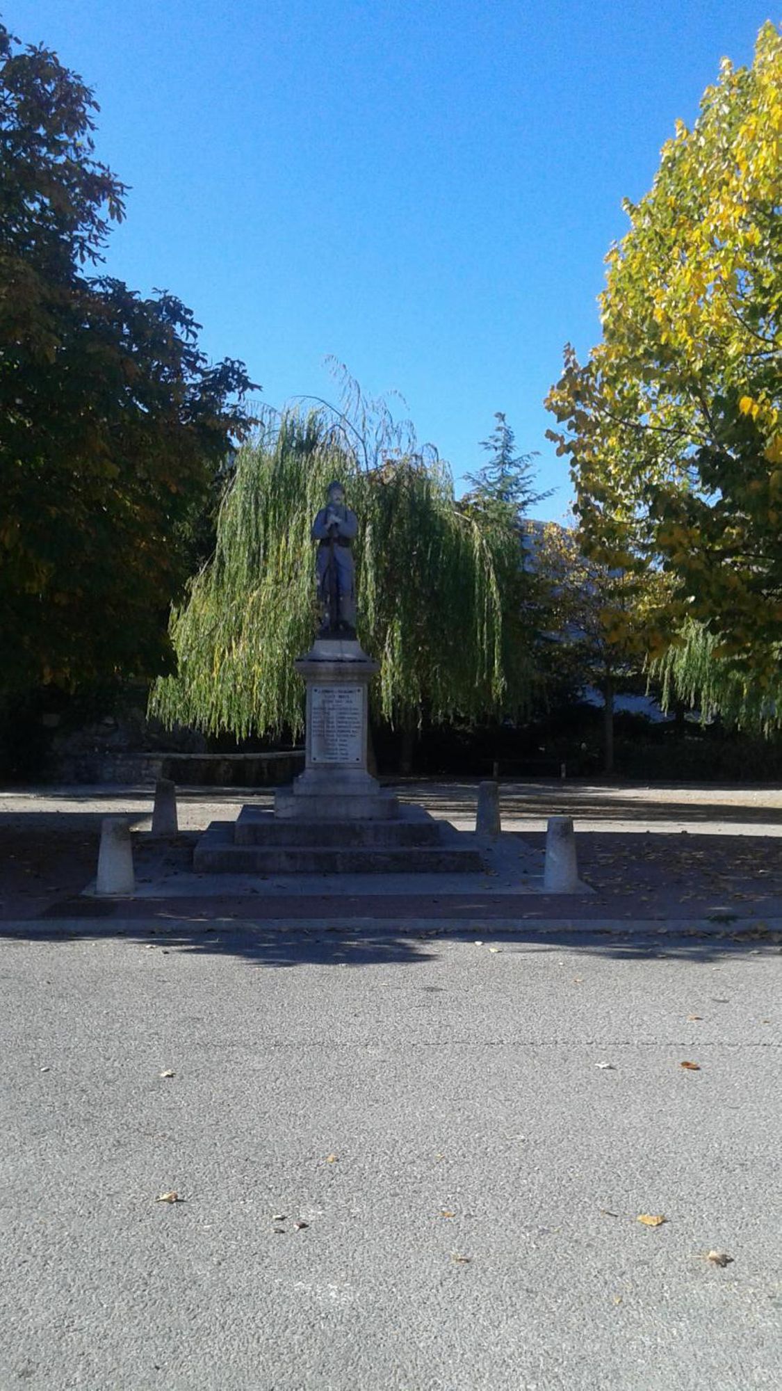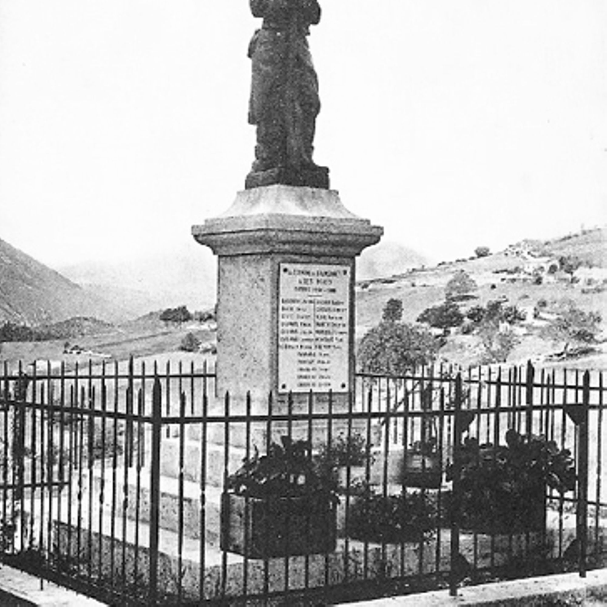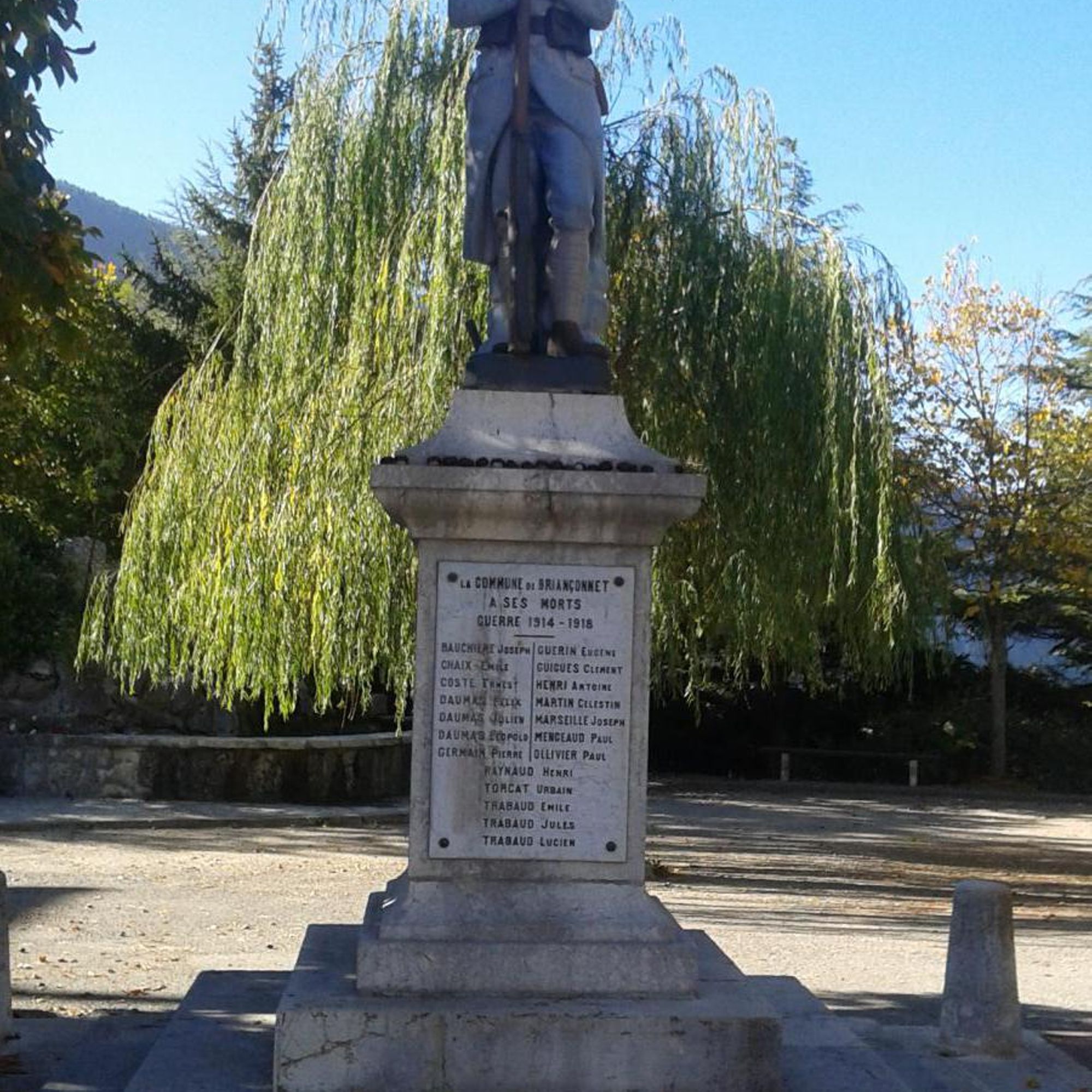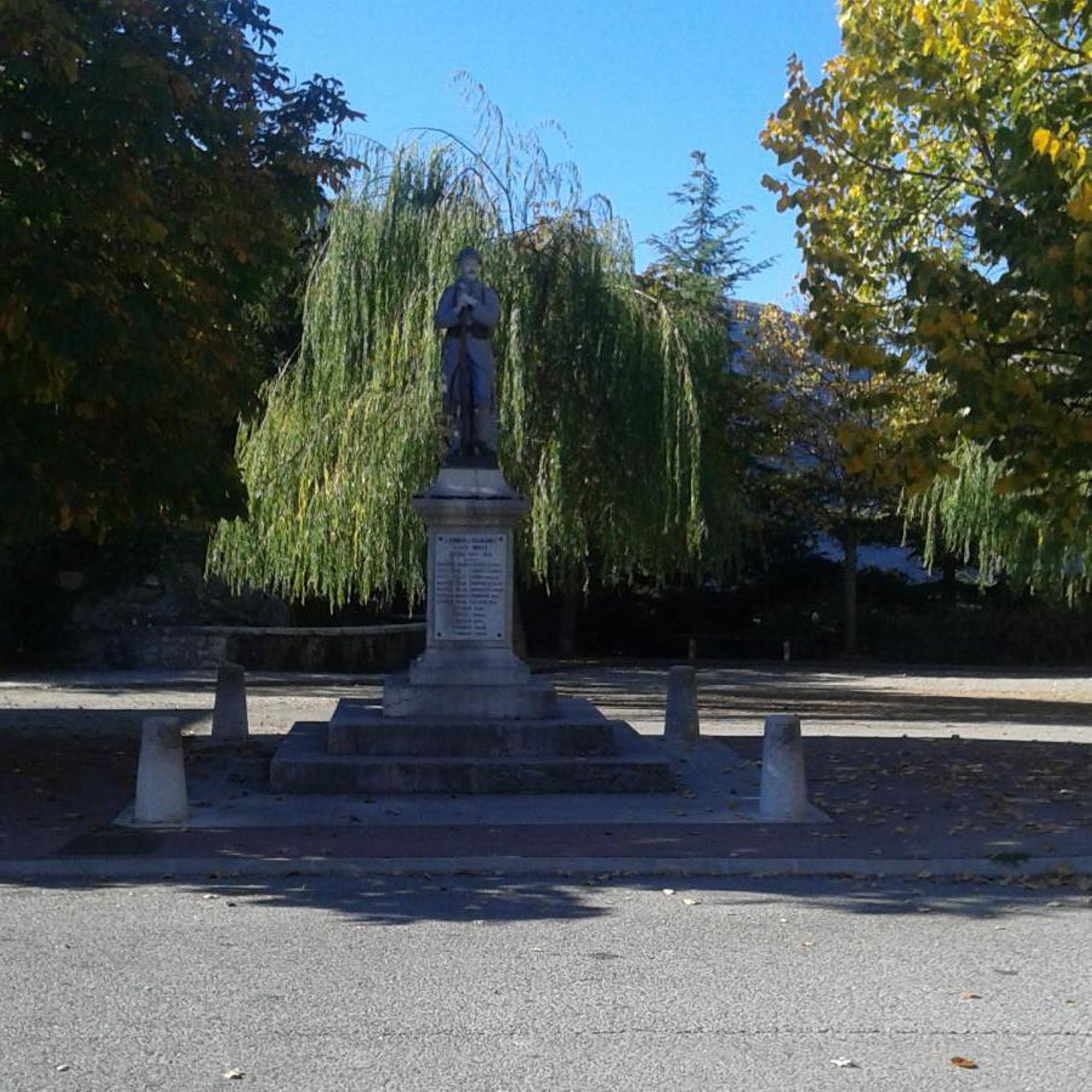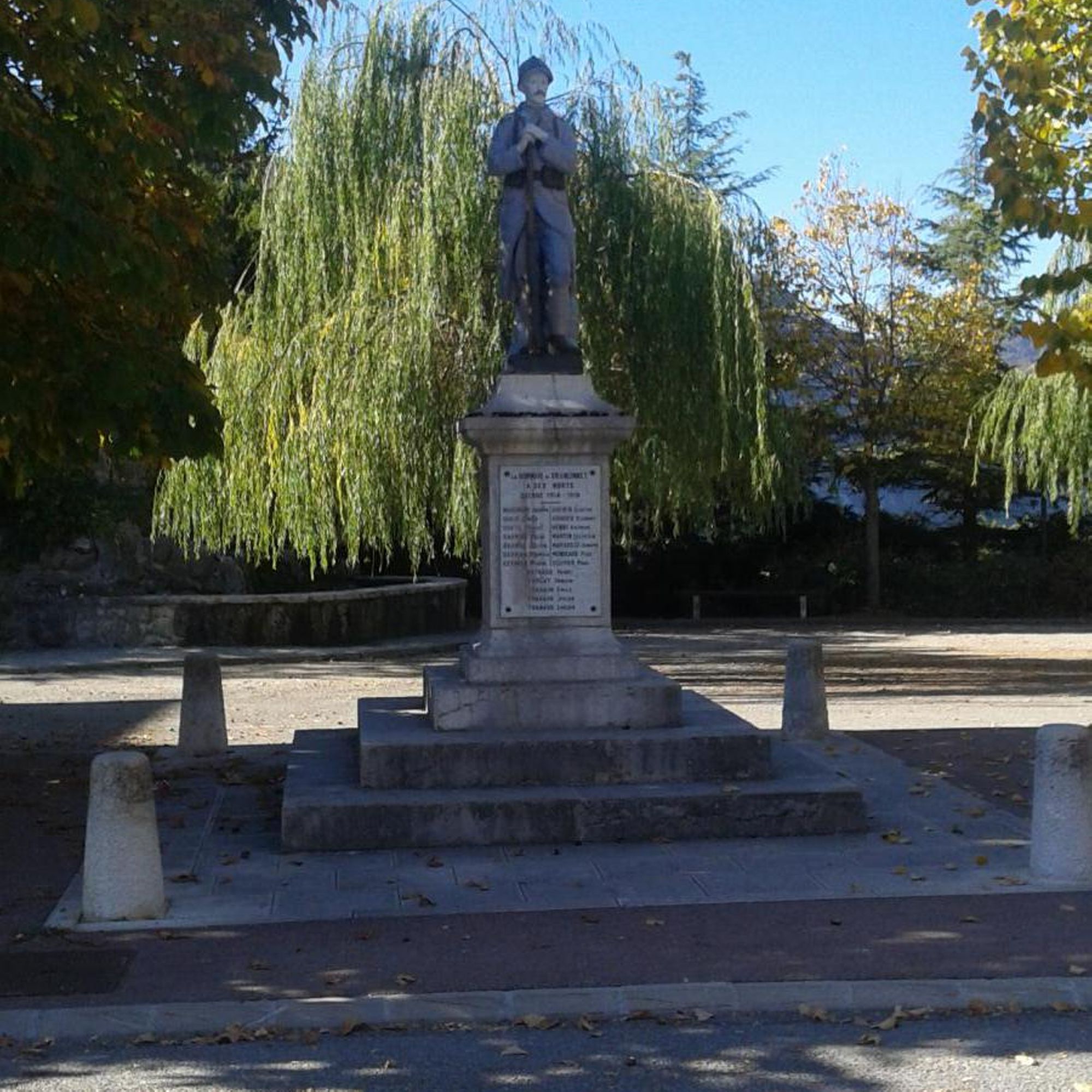 - Piédestal en pierre sur socle de trois marches, plaque de marbre, le tout surmonté d'une statue en fonte de fer représentant un soldat en faction "Le Poilu"