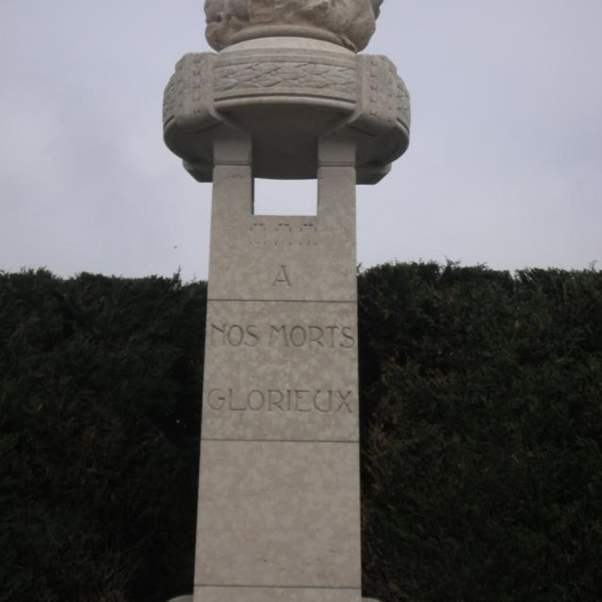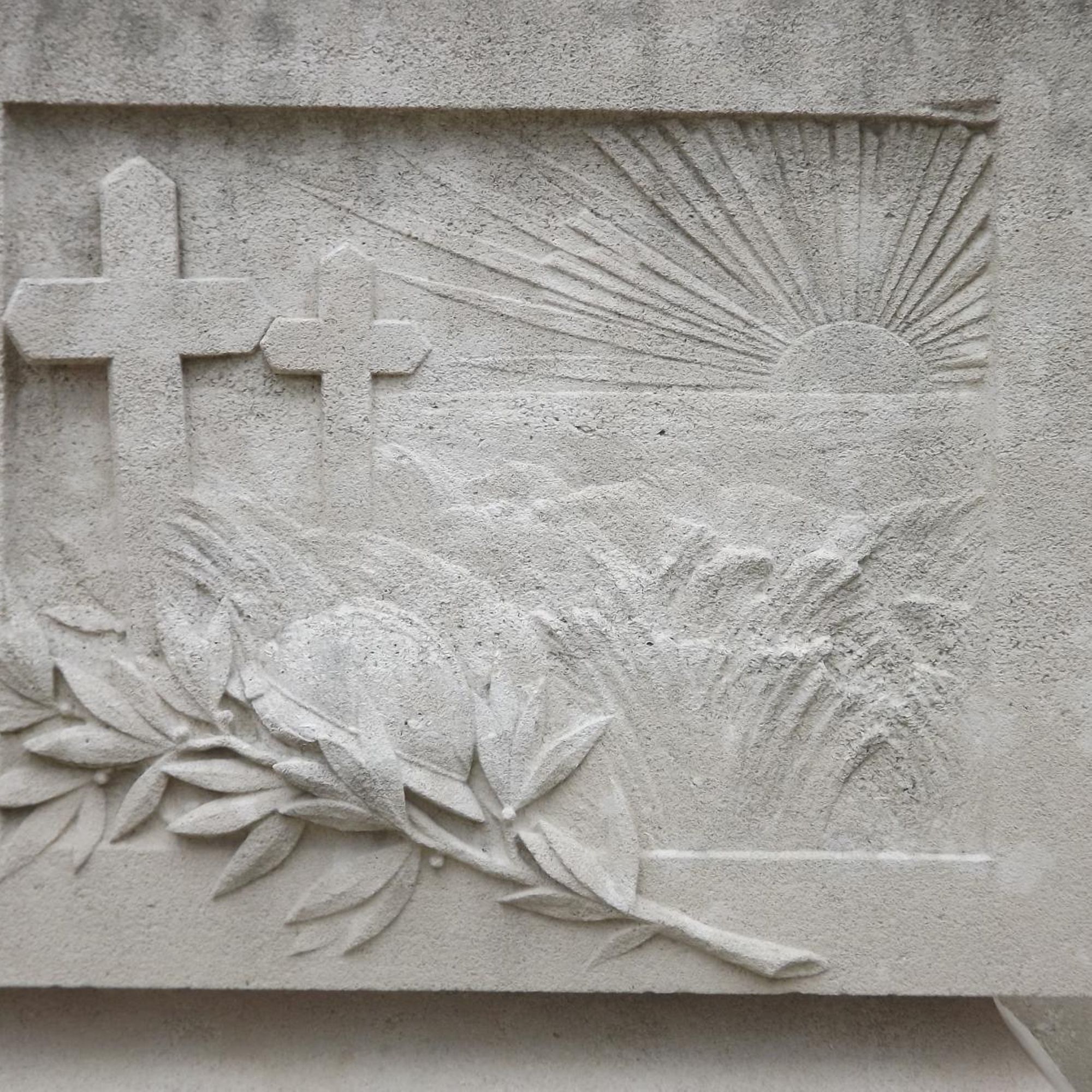 Il est constitué d’un bas-relief sur lequel :- au 1er plan figurent des palmes, un symbole chrétien mais laïcisé ici qui rappelle le sacrifice consenti par ces soldats à la patrie.Sur ces palmes est posé un casque de poilu, le casque Adrian qui, depuis 1915 équipe les Poilus ( bien plus efficace que le képi ou le calot ! ).
