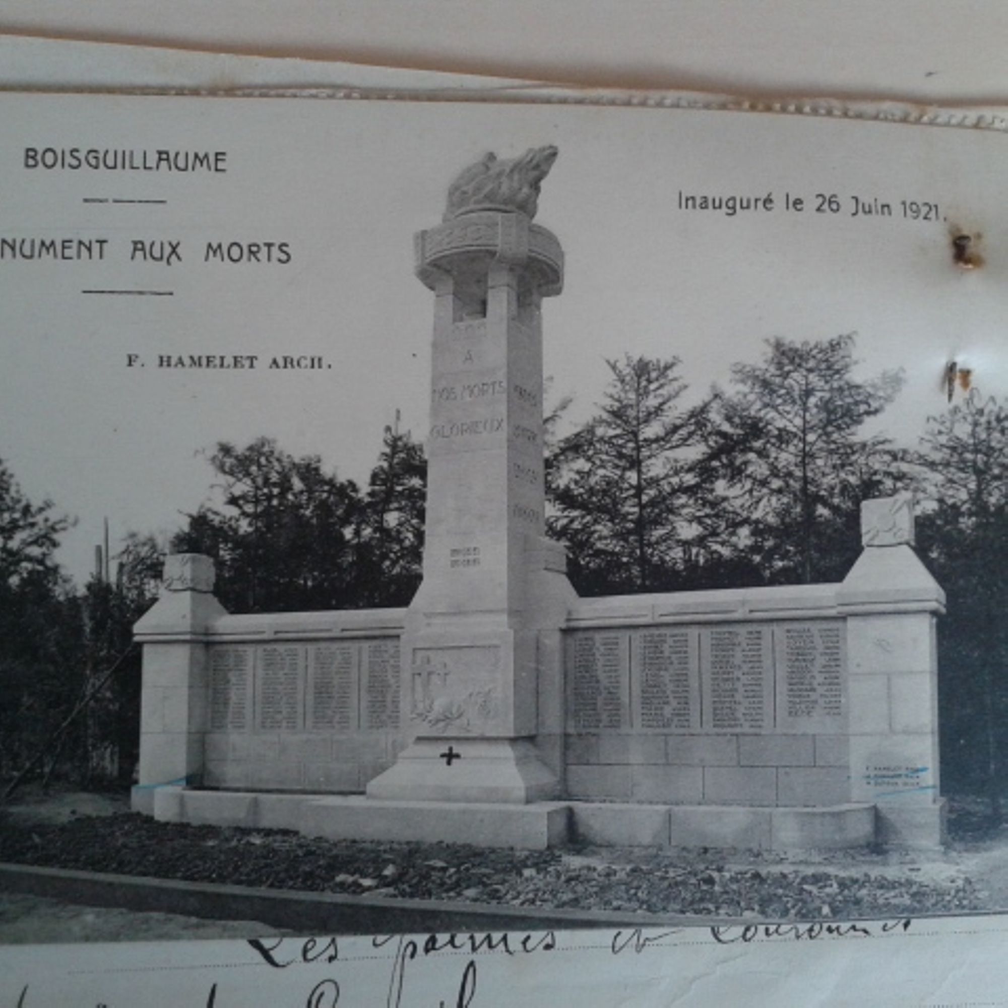 Celui-ci répondit en envoyant une carte postale représentant le monument aux morts de Bois-Guillaume et sur laquelle il avait dessiné une croix. Il indiquait de cette façon l’endroit qui lui semblait le mieux approprié pour placer les palmes en bronze réclamées par un comité de la commune. L'architecte justifiait ainsi son choix : éviter que « ces emblèmes de bien mauvais goût » soient trop apparents !