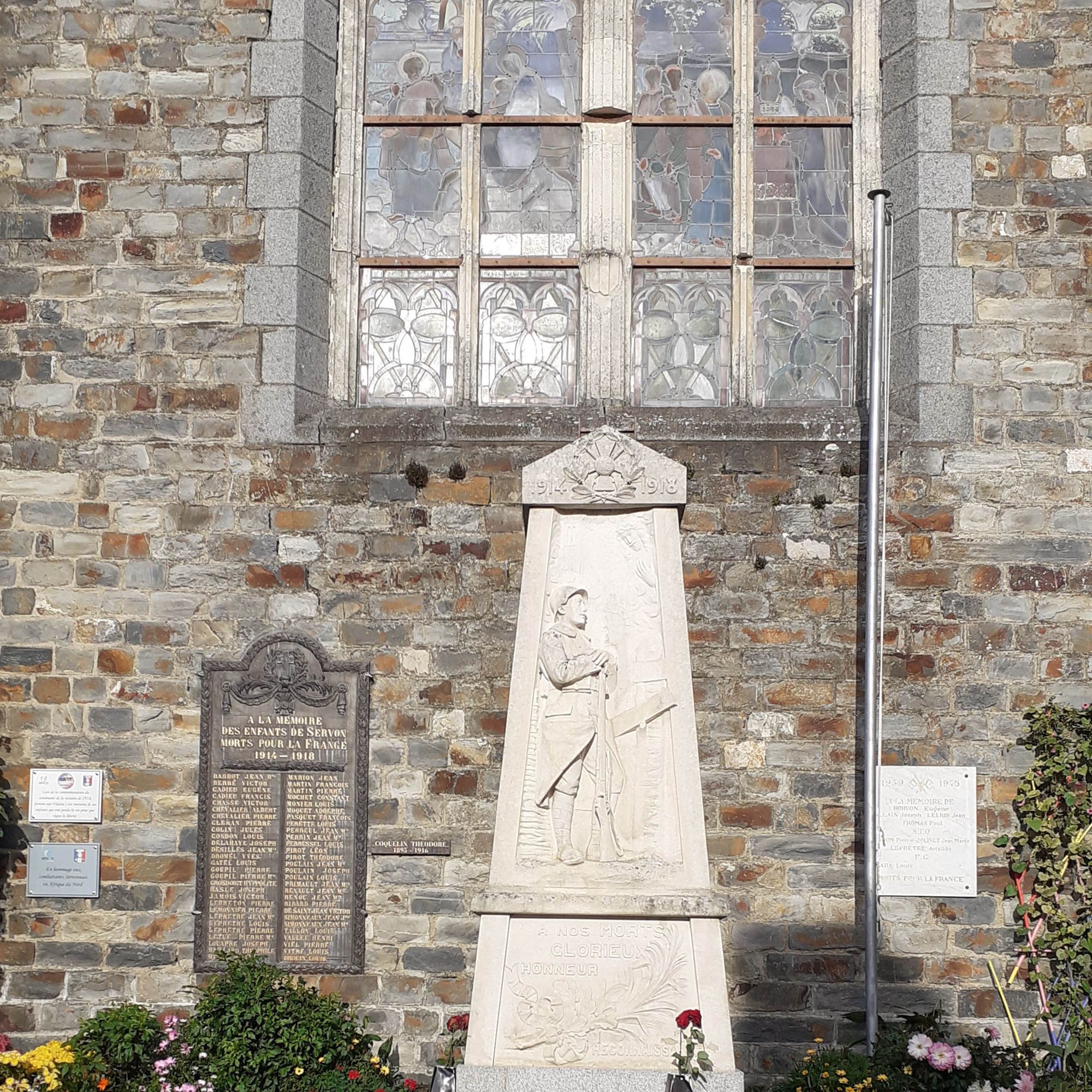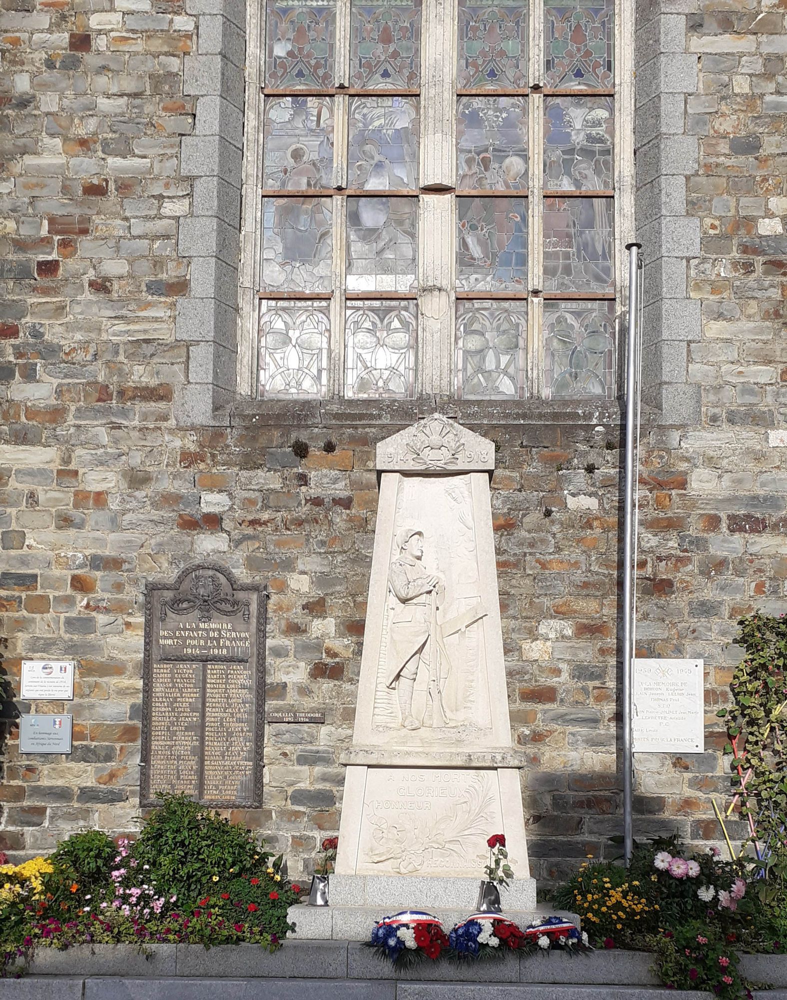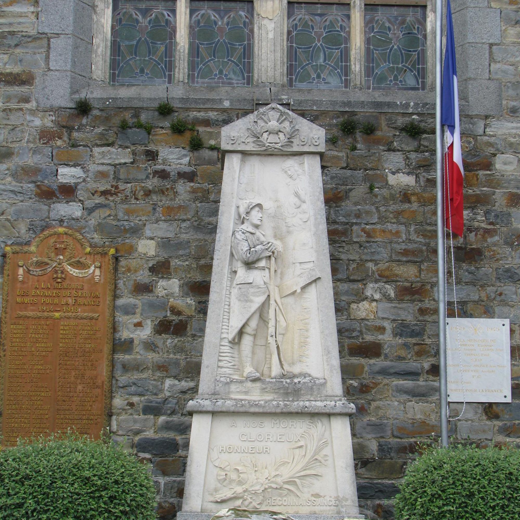 Obélisque sur socle avec poilu en bas-relief surmonté par le Christ et une représentatin de l'église de Servon sur Vilaine