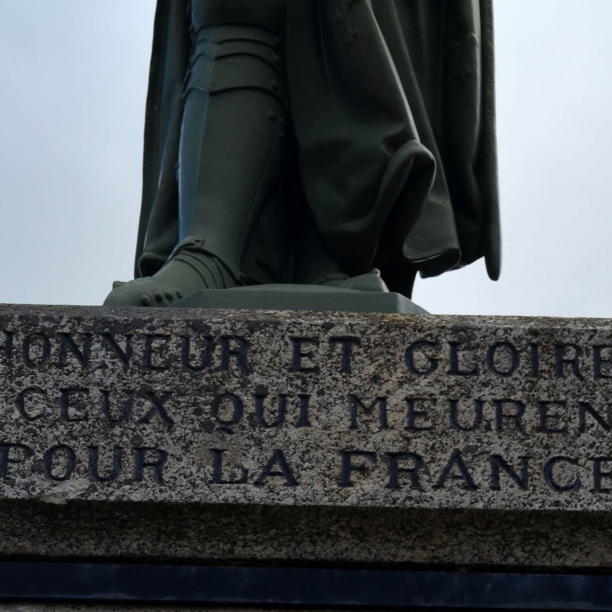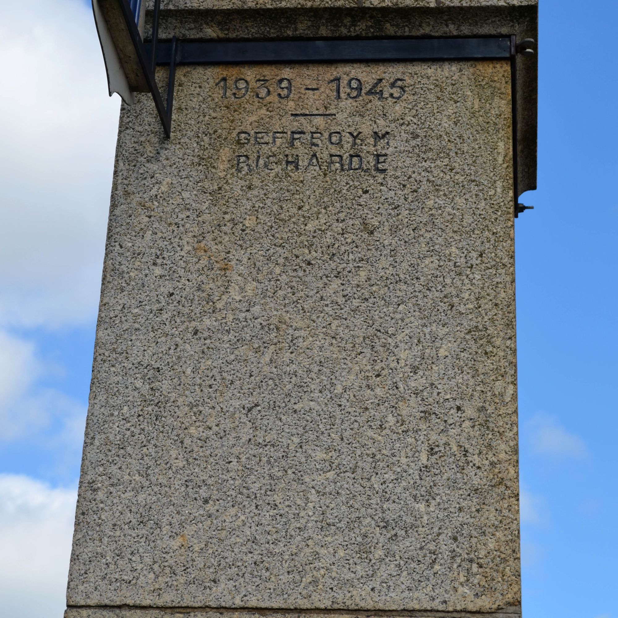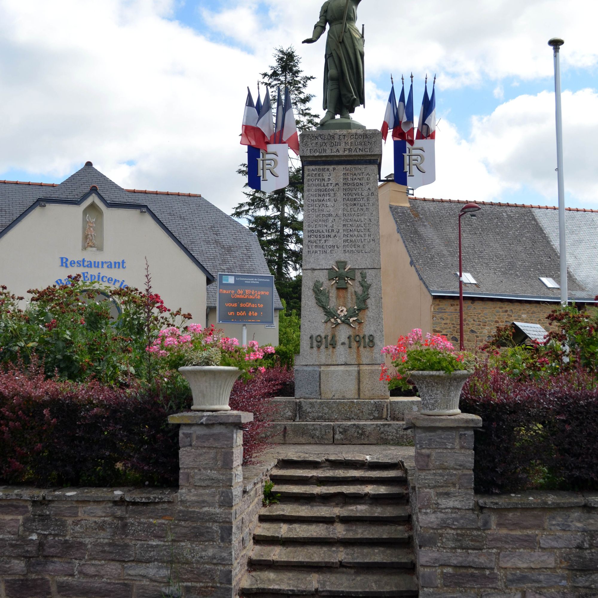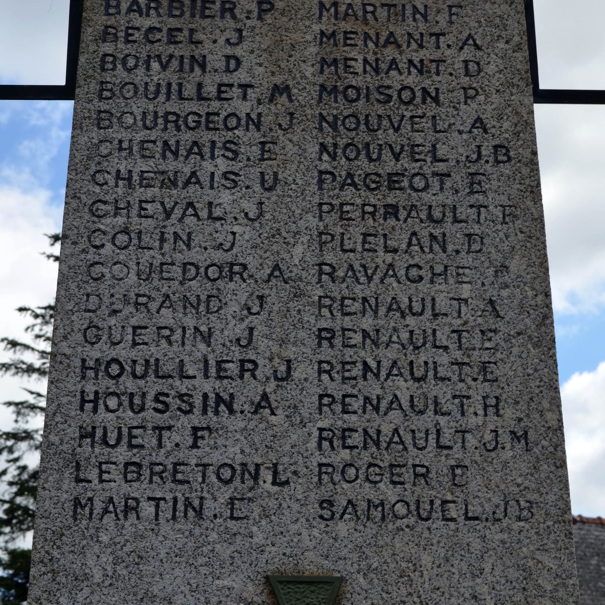 Monument aux morts édifié après la première guerre mondiale, constitué d'une colonne massive de forme carrée posée sur un emmarchement (une marche) et surmontée d'une statue de Jeanne d'Arc (fondue selon un modèle de série emprunté aux statues de Frémiet). La sainte de la patrie, canonisée en 1920 par l'Eglise, est debout et tient à la main son étendard aujourd'hui rouillé mais jadis articulé, semble t-il.