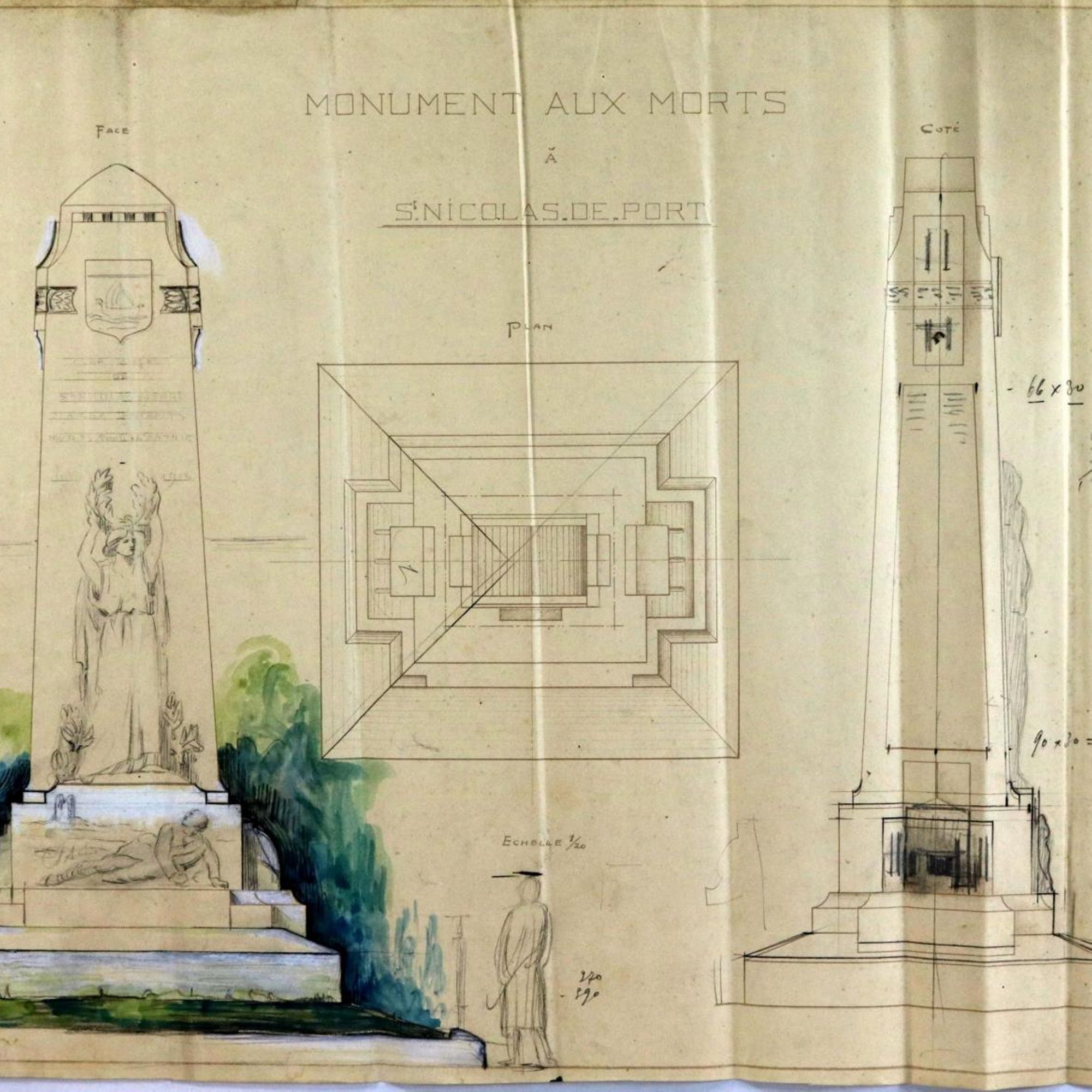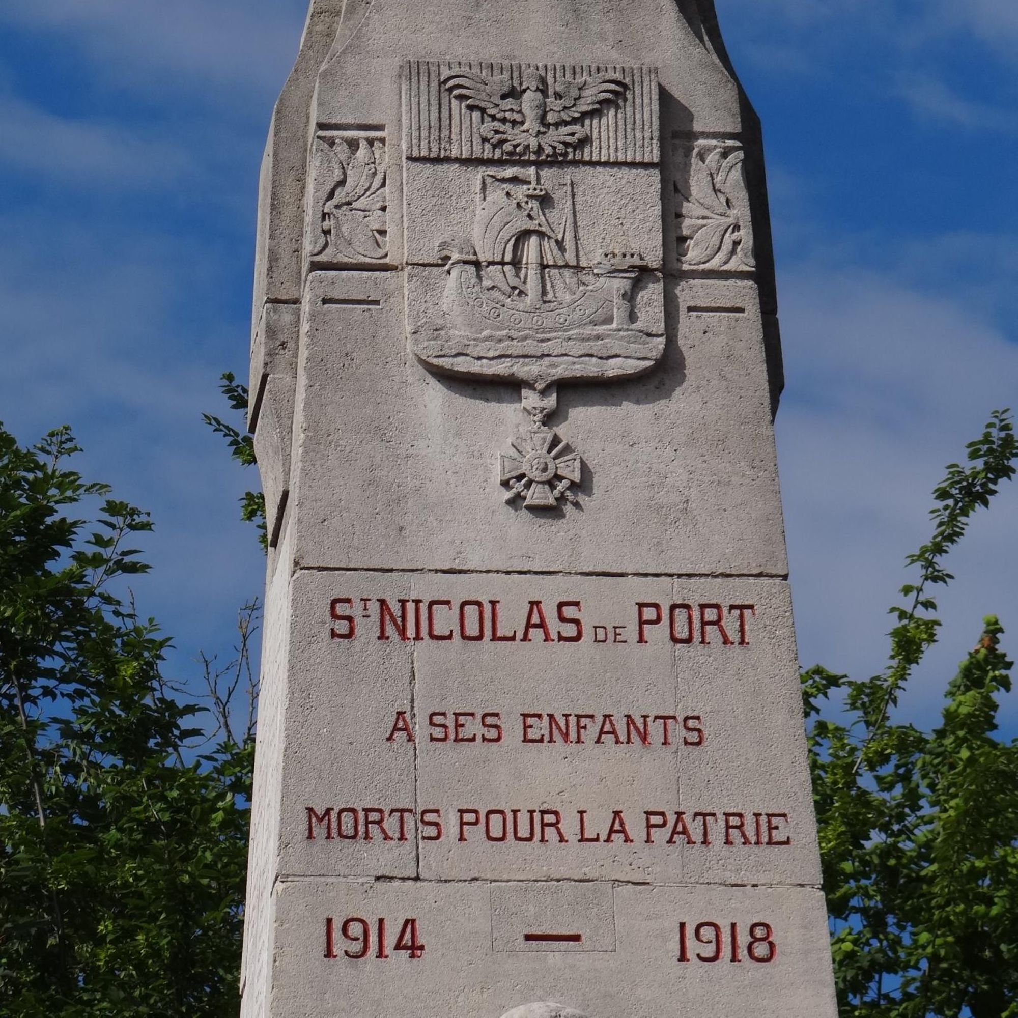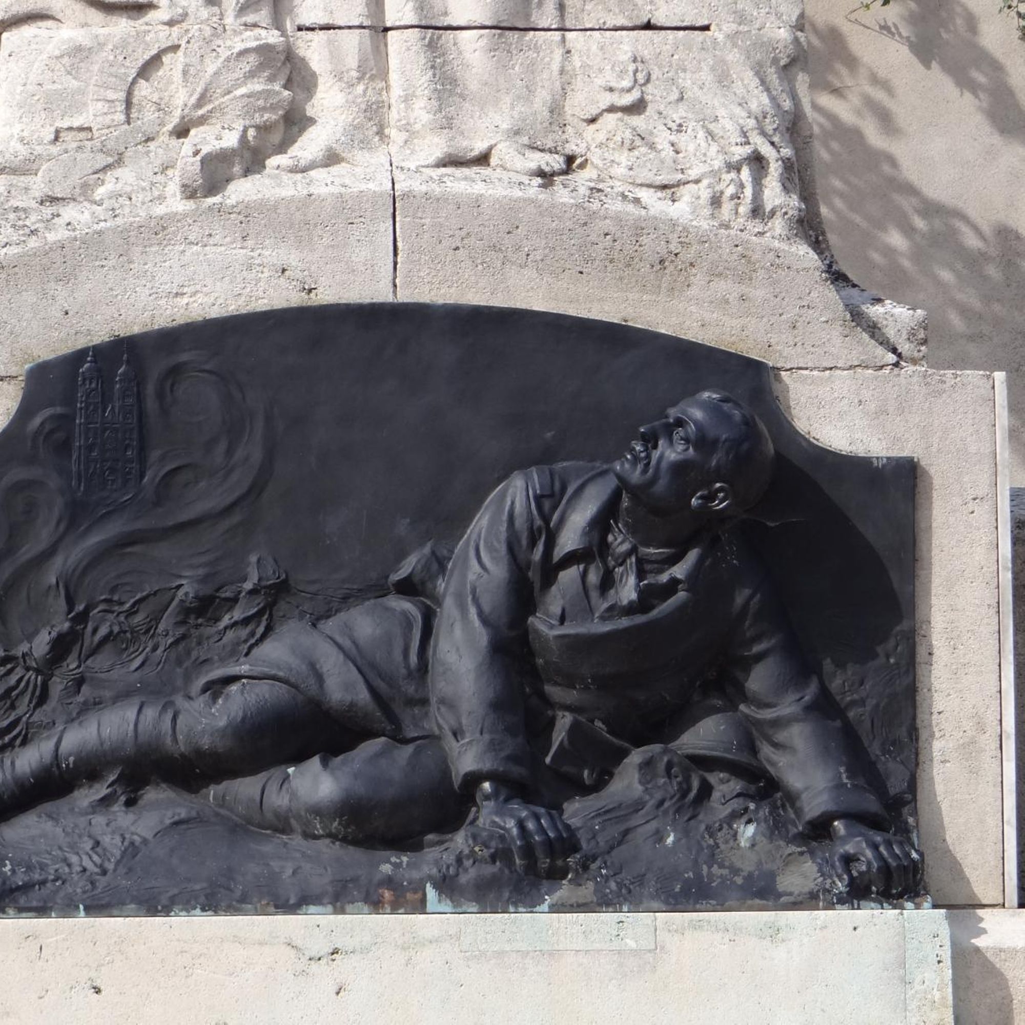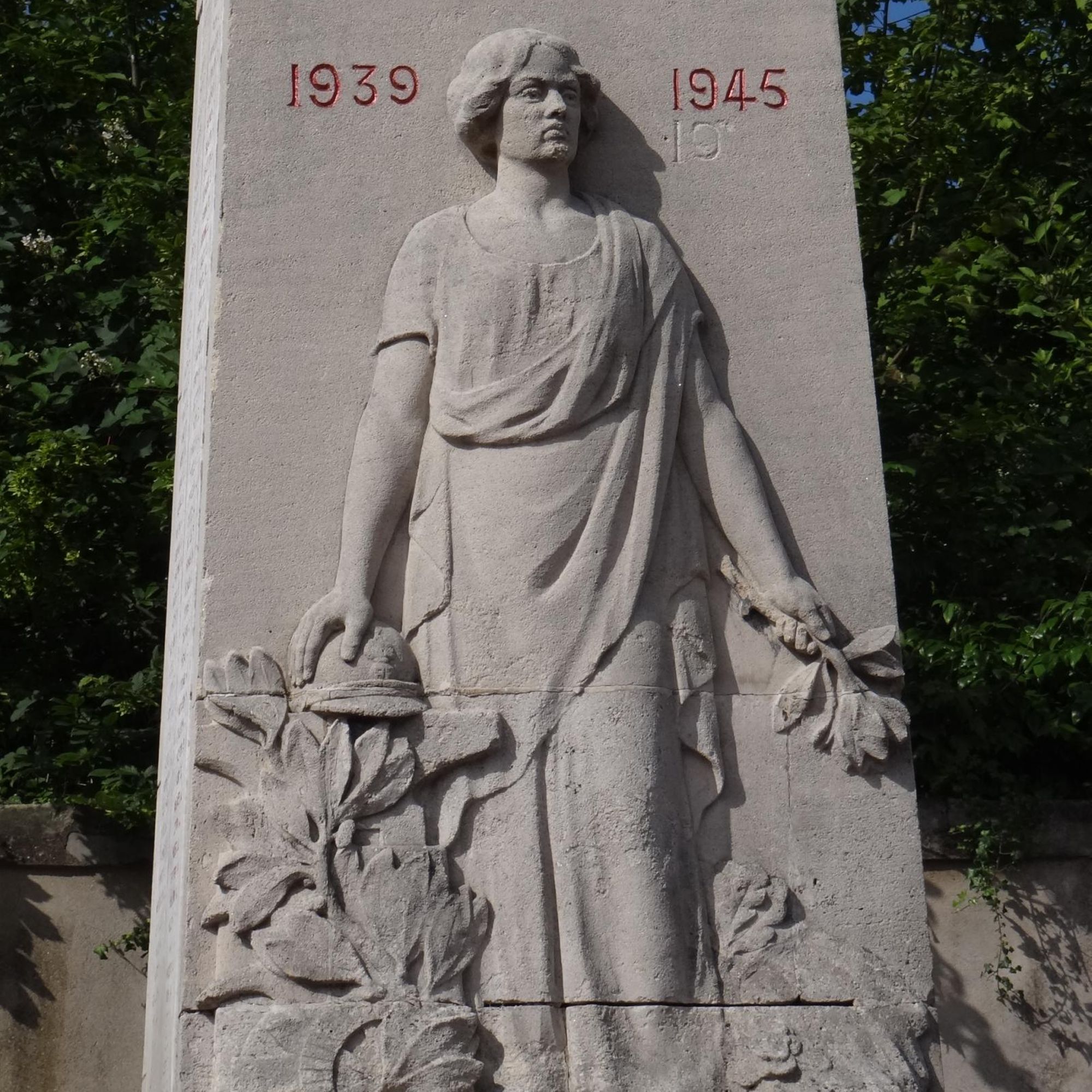 - Obélisque sur socle avec une statue féminine posant sa main sur un casque et de l'autre tenant des lauriers et, en dessous, un bas relief représentant un poilu désarmé, épuisé ou blessé ou mourant, regardant, impuissant, les flammes dévorer la basilique.
