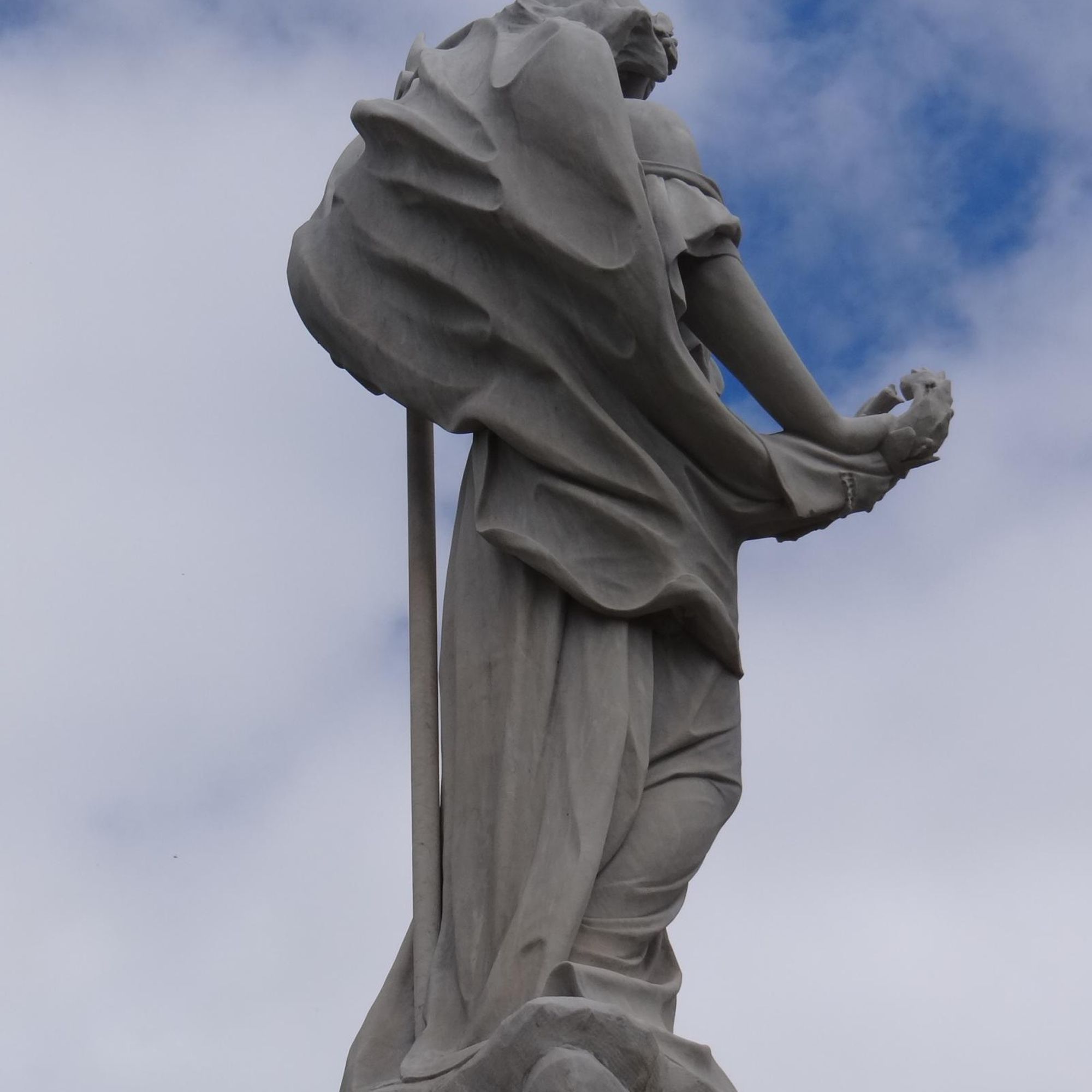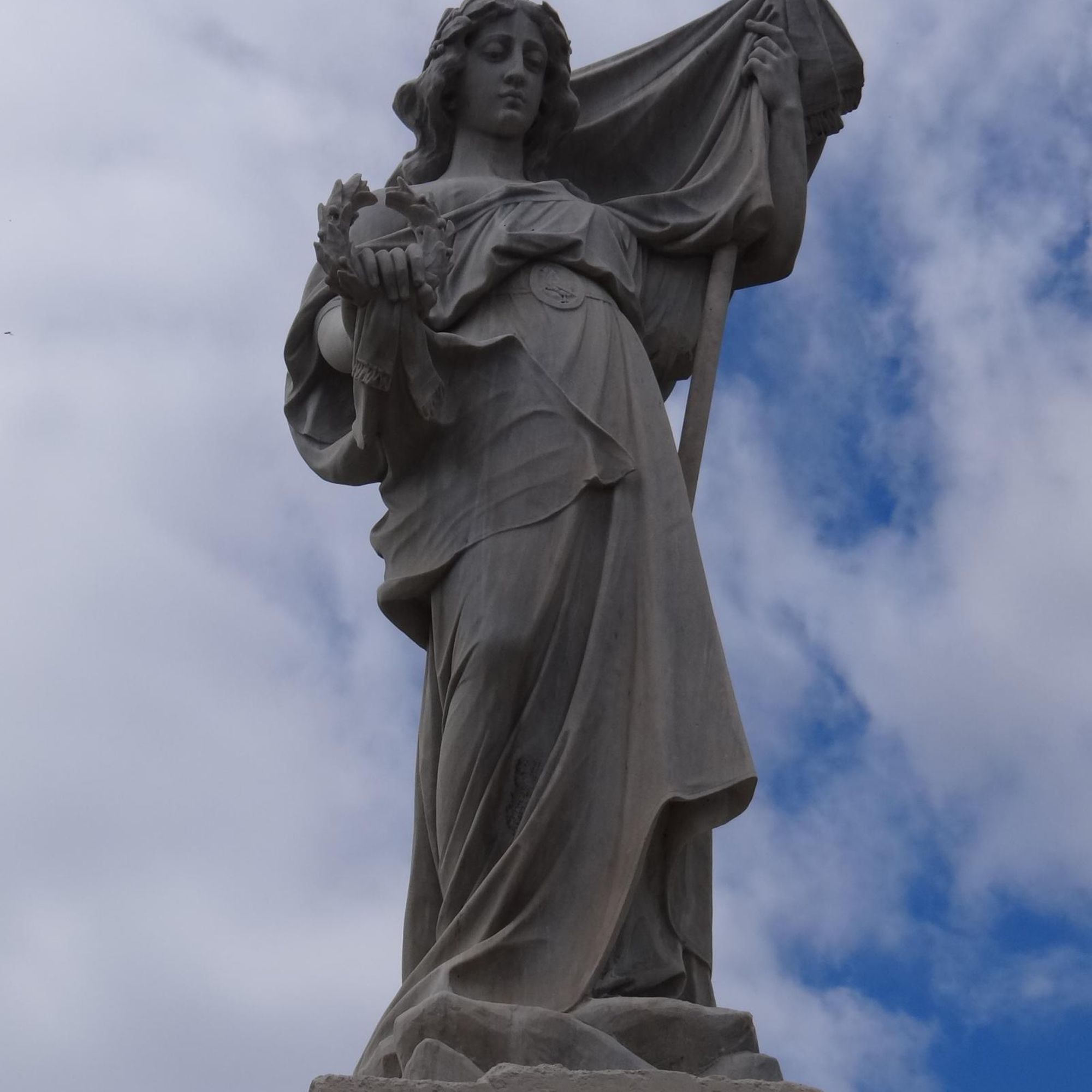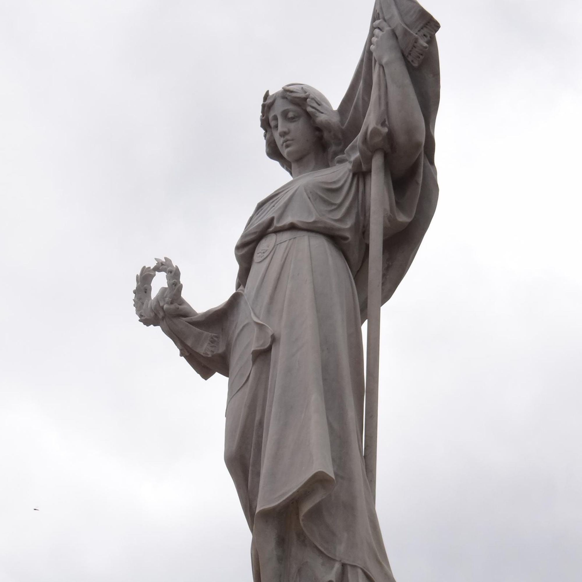 Piédestal quadrangulaire surpportant une statue de femme à la tête ceinte de lauriers, tenant le drapeau de sa main gauche et une couronne de feuilles de sa main droite.