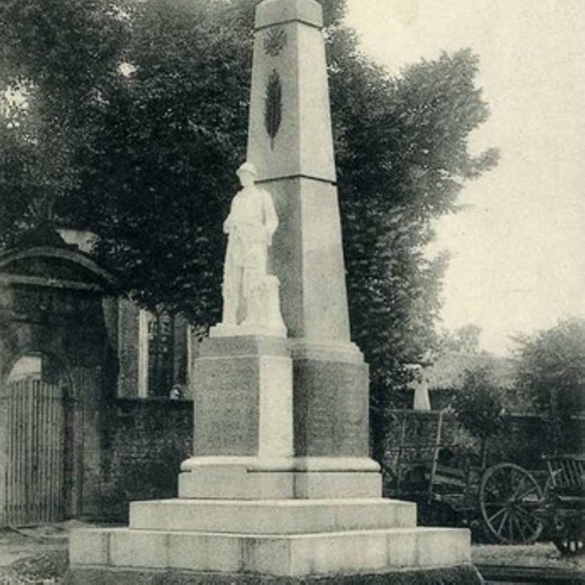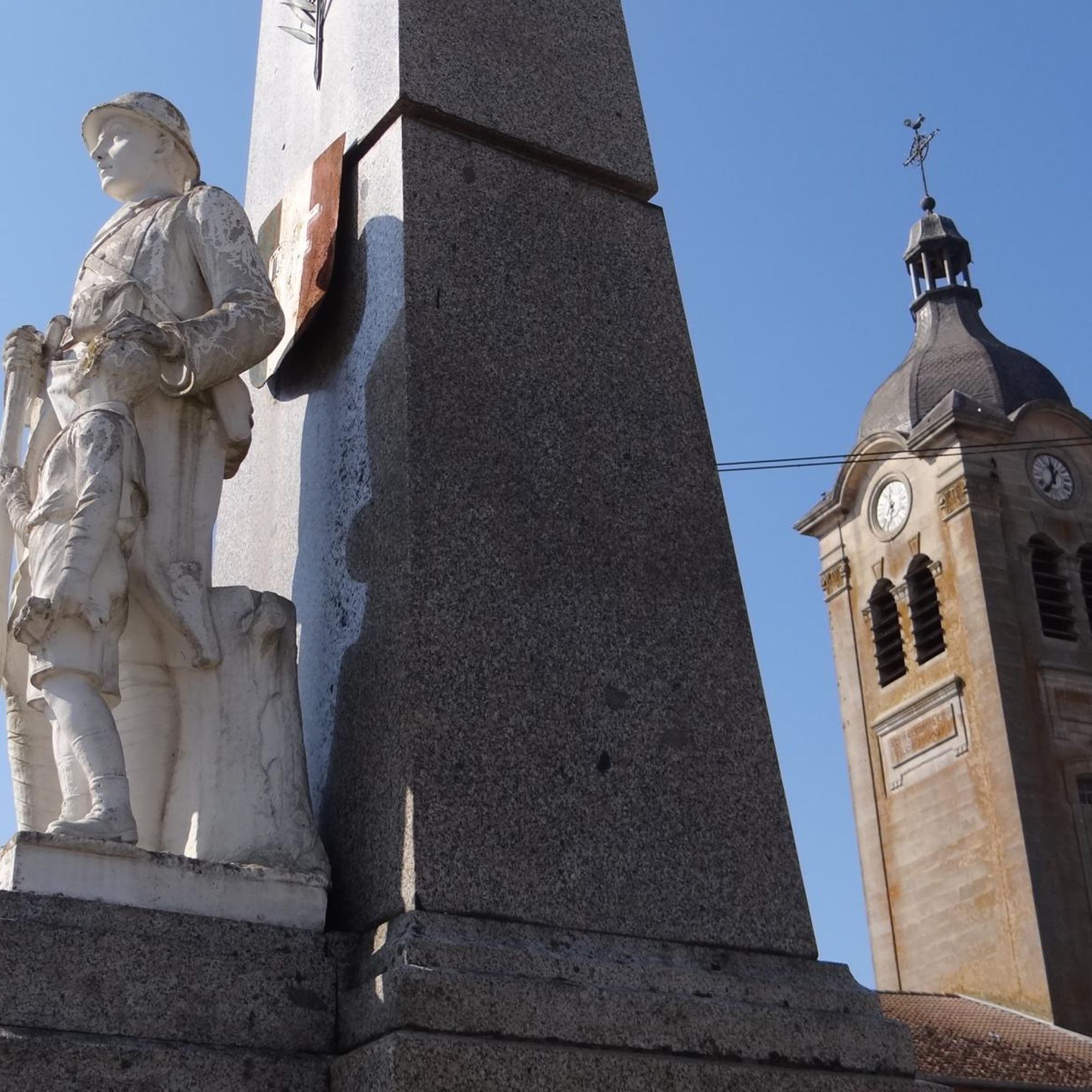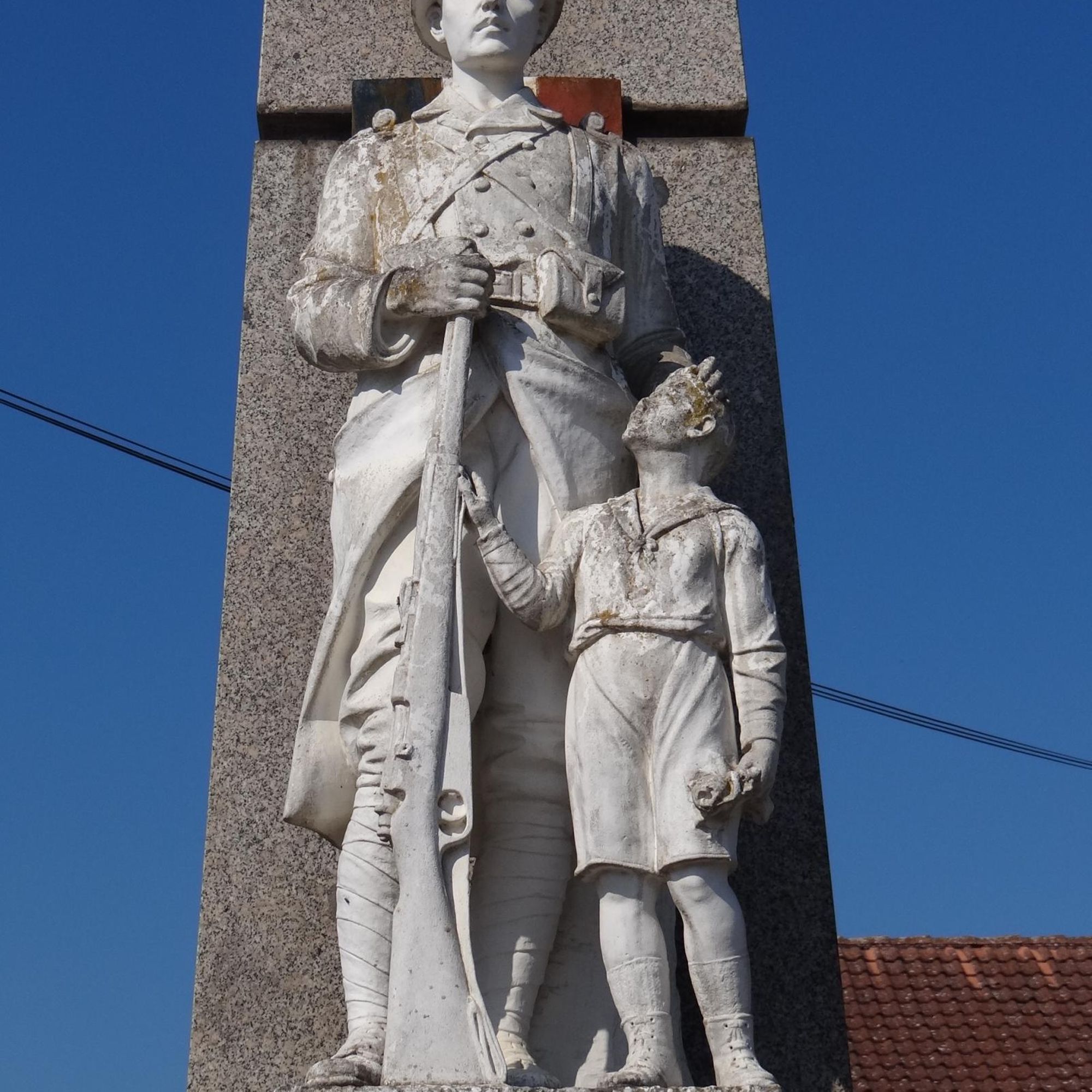 Oblésique sur socle. Devant l'obélisque, une statue d'un poilu au repos, mais attentif, regardant droit devant lui, tenant de sa main droite son fusil dont la crosse repose au sol, et protégeant de sa main droite un enfant venu apporter des fleurs.