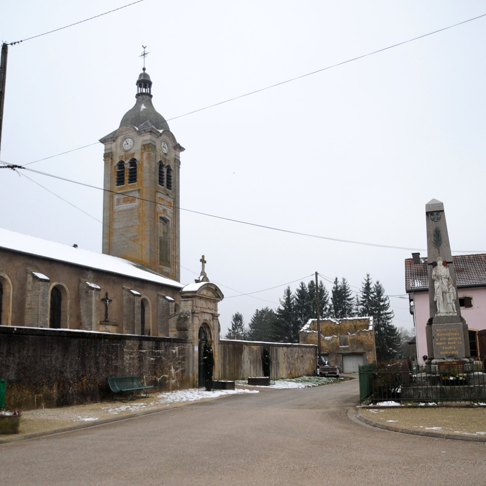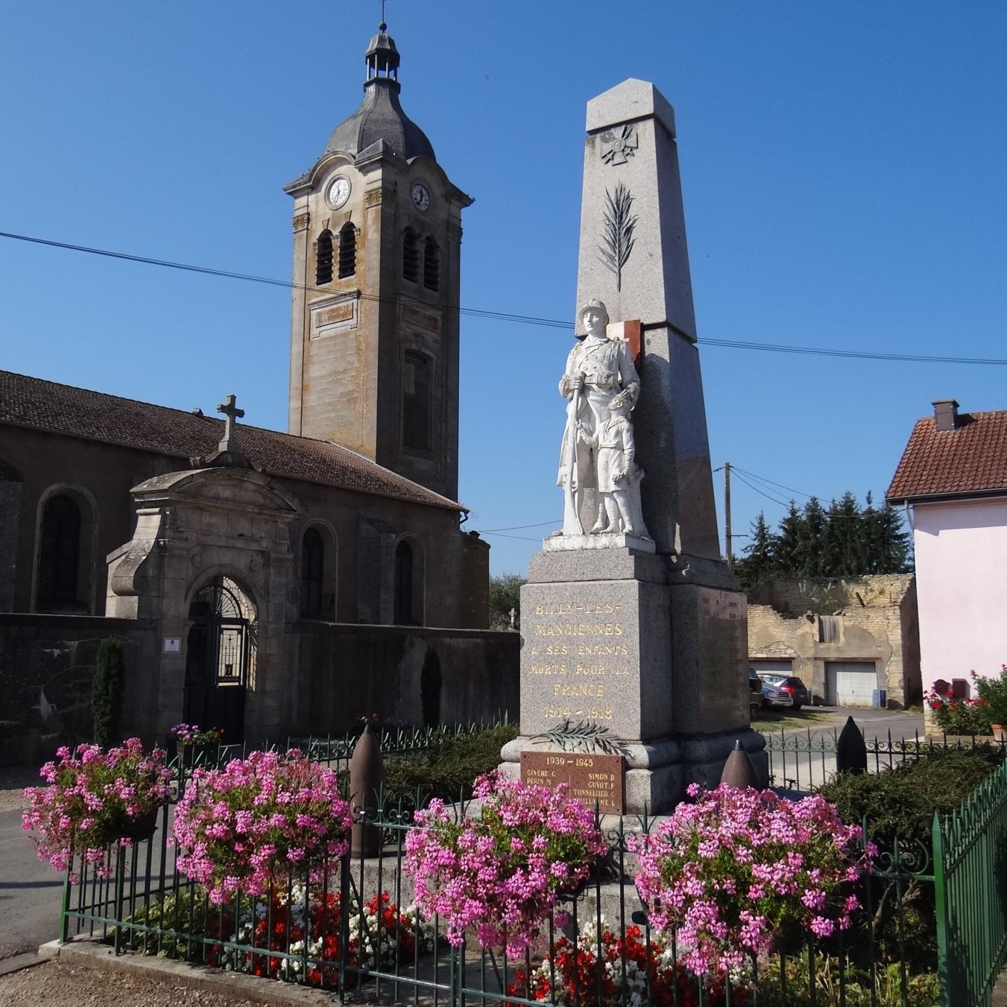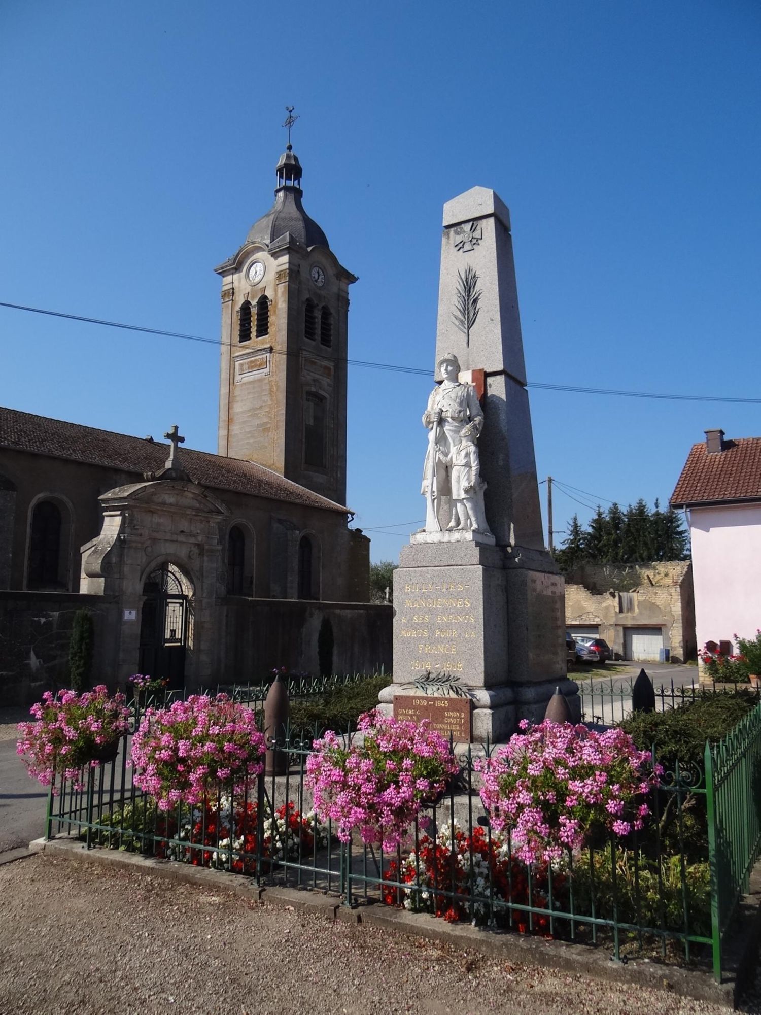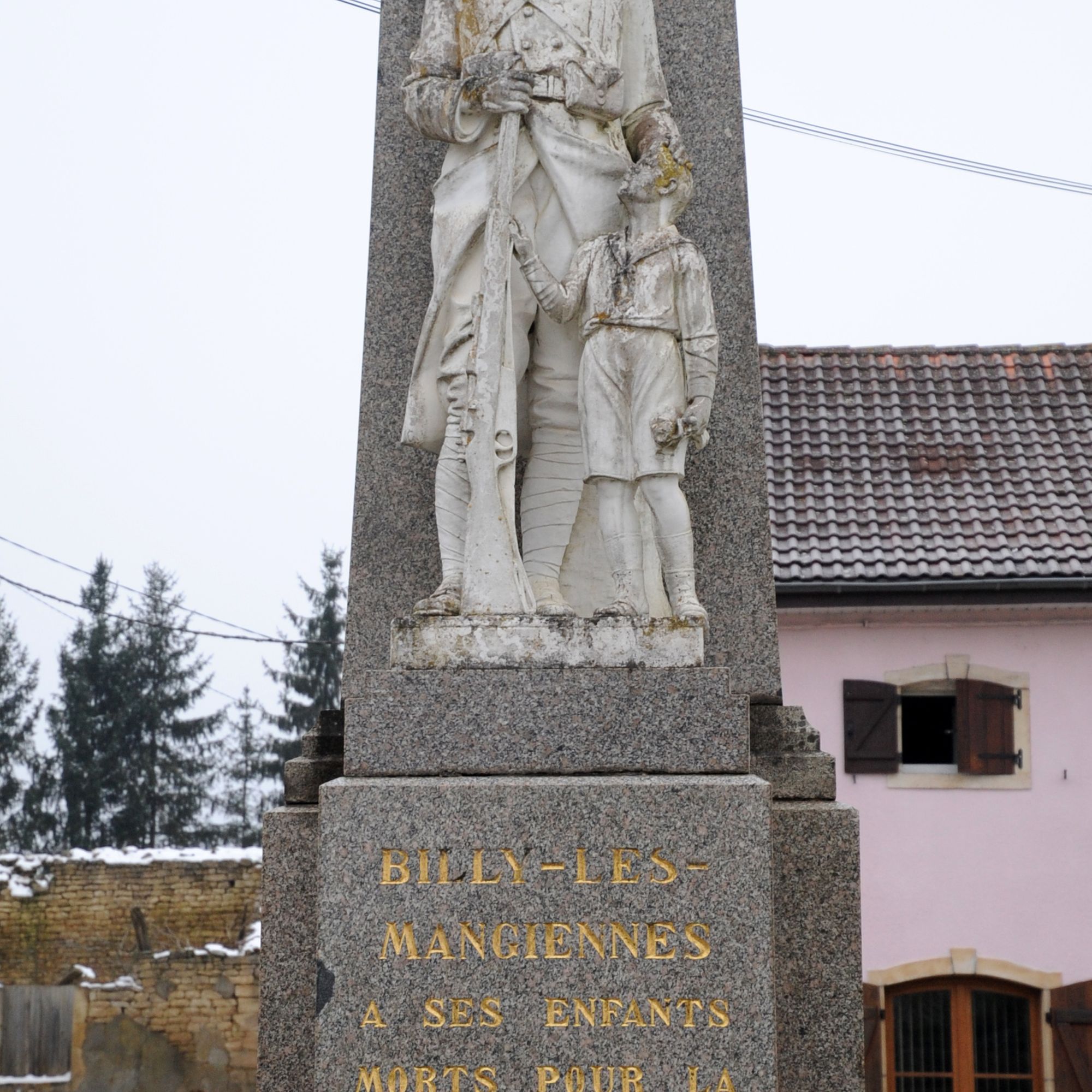 Oblésique sur socle. Devant l'obélisque, une statue d'un poilu au repos, mais attentif, regardant droit devant lui, tenant de sa main droite son fusil dont la crosse repose au sol, et protégeant de sa main droite un enfant venu apporter des fleurs.