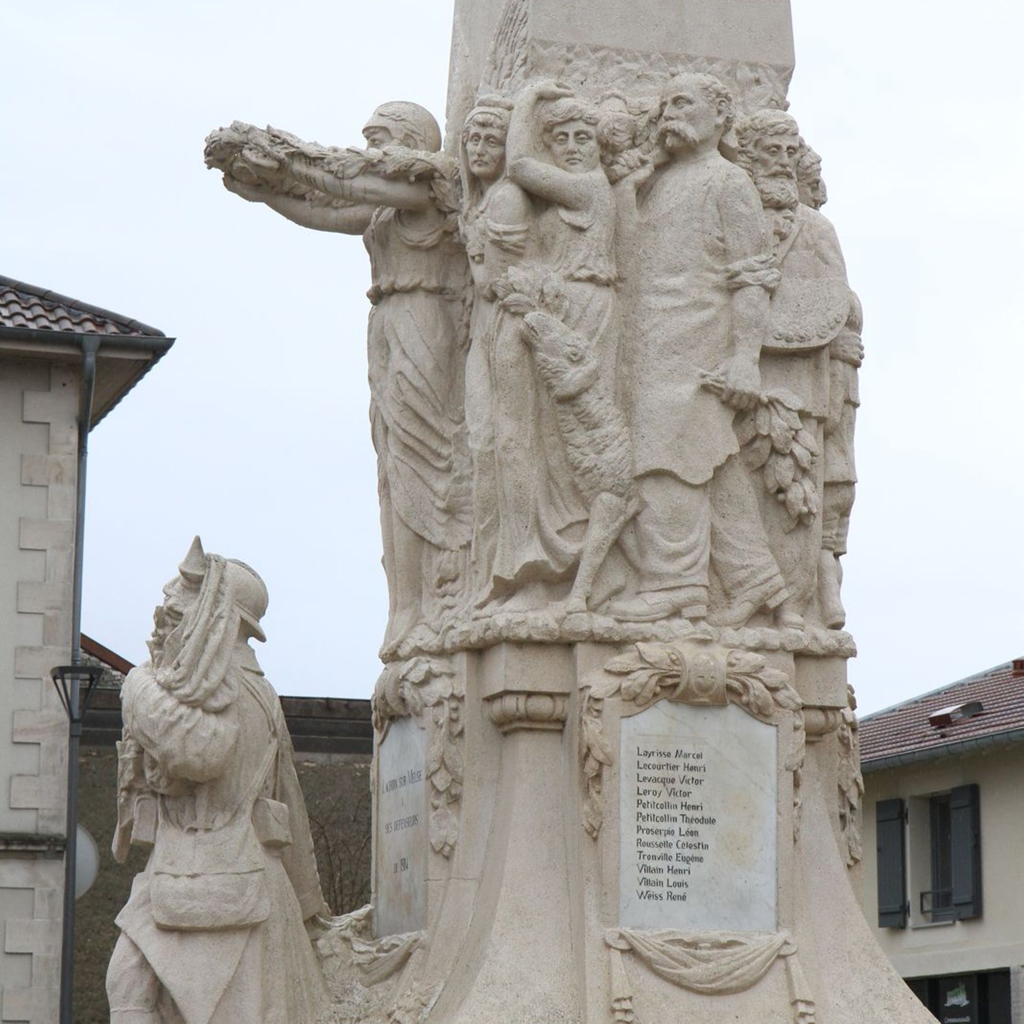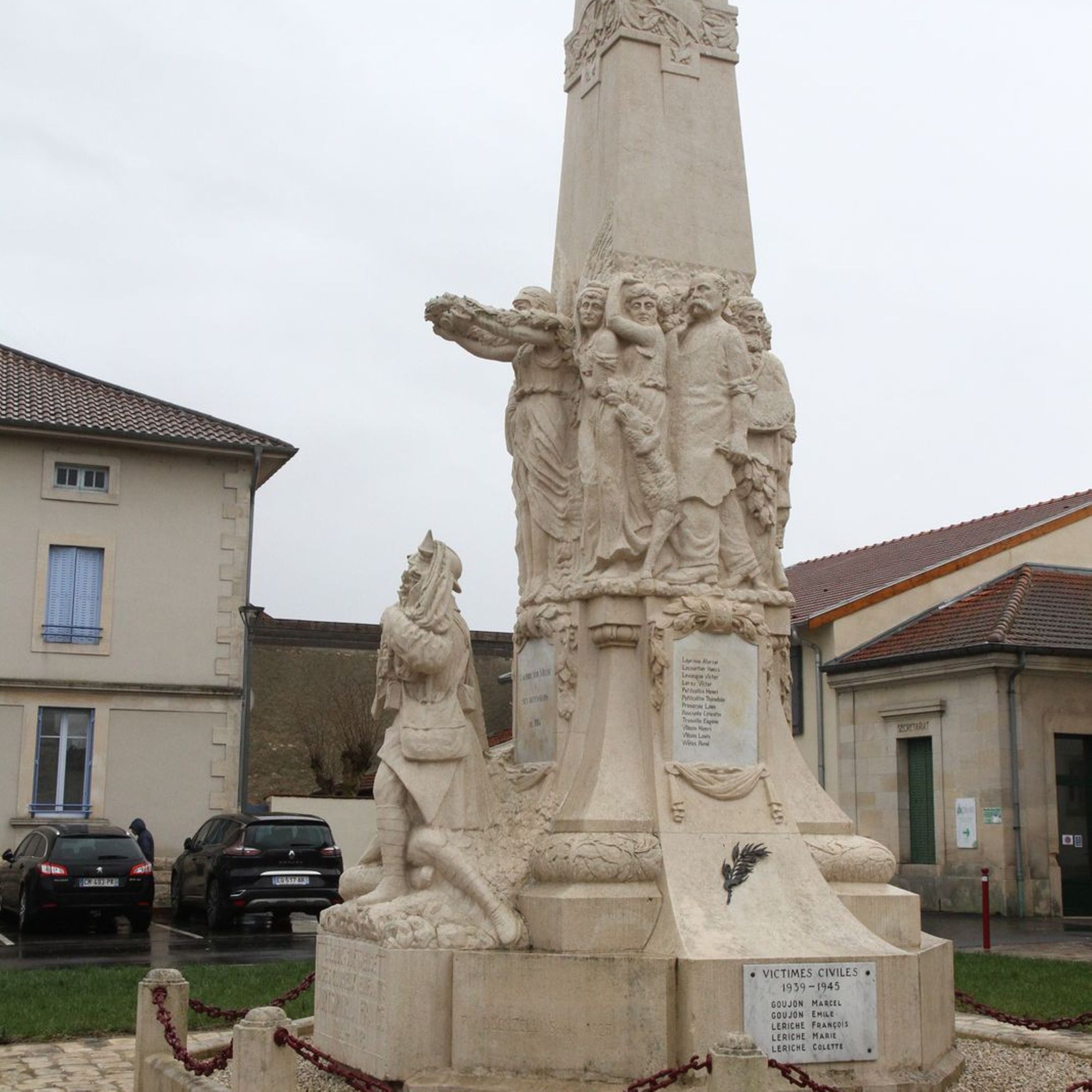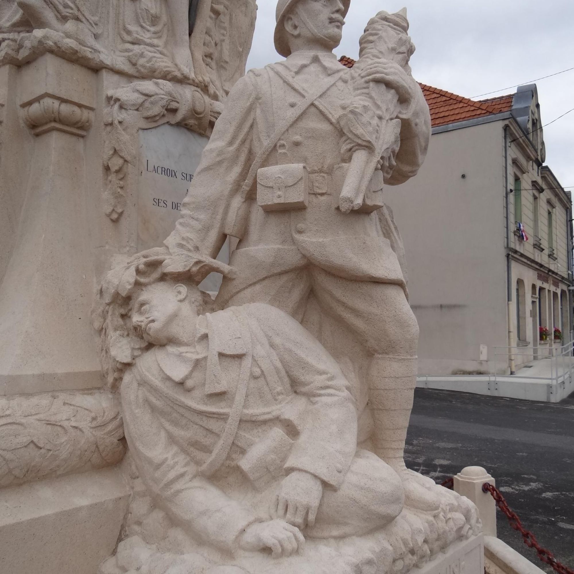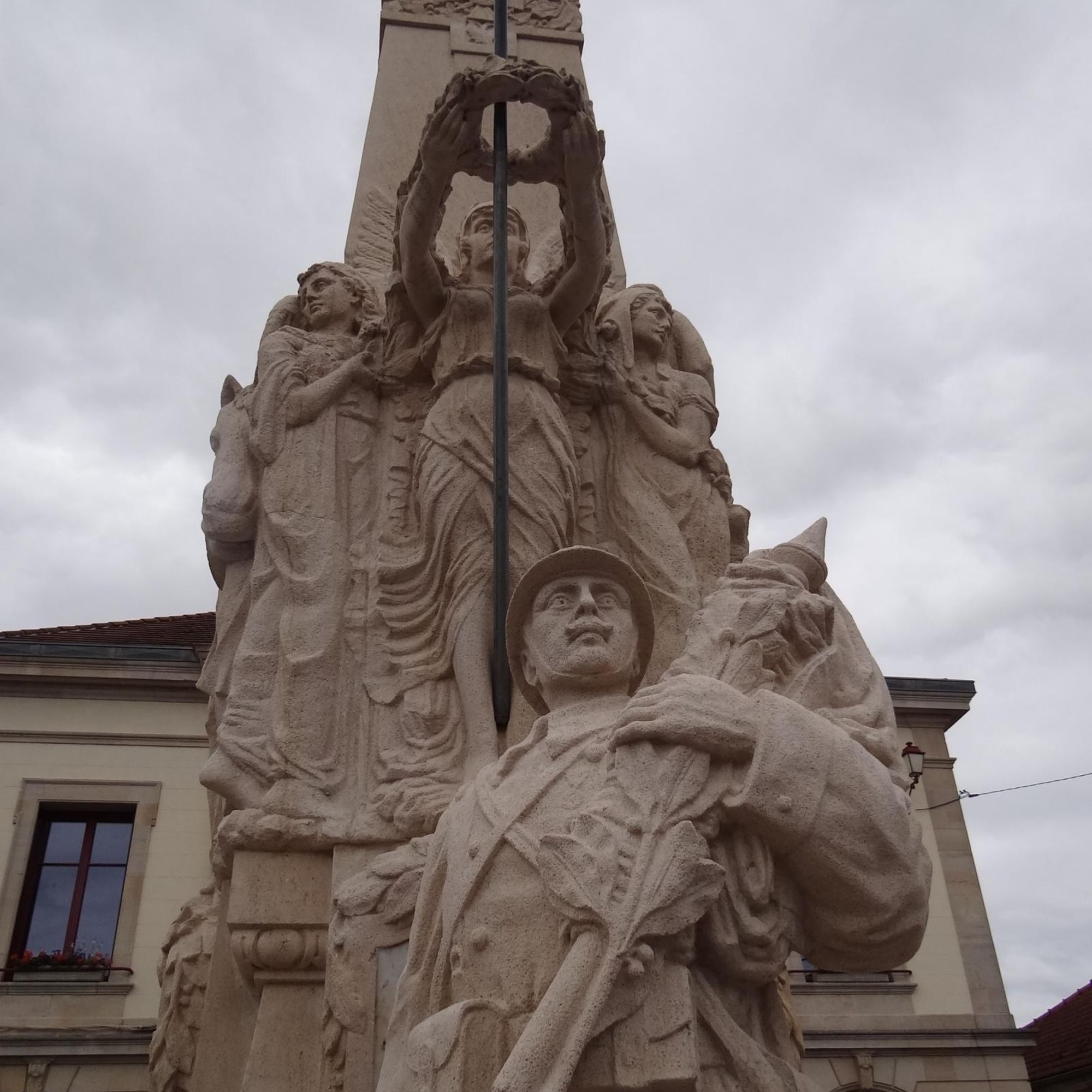 Obélisque sur socle devancé par une statue représentant un poilu tenant le drapeau posant de sa main droite des lauriers sur la tête d'un camarade mort.