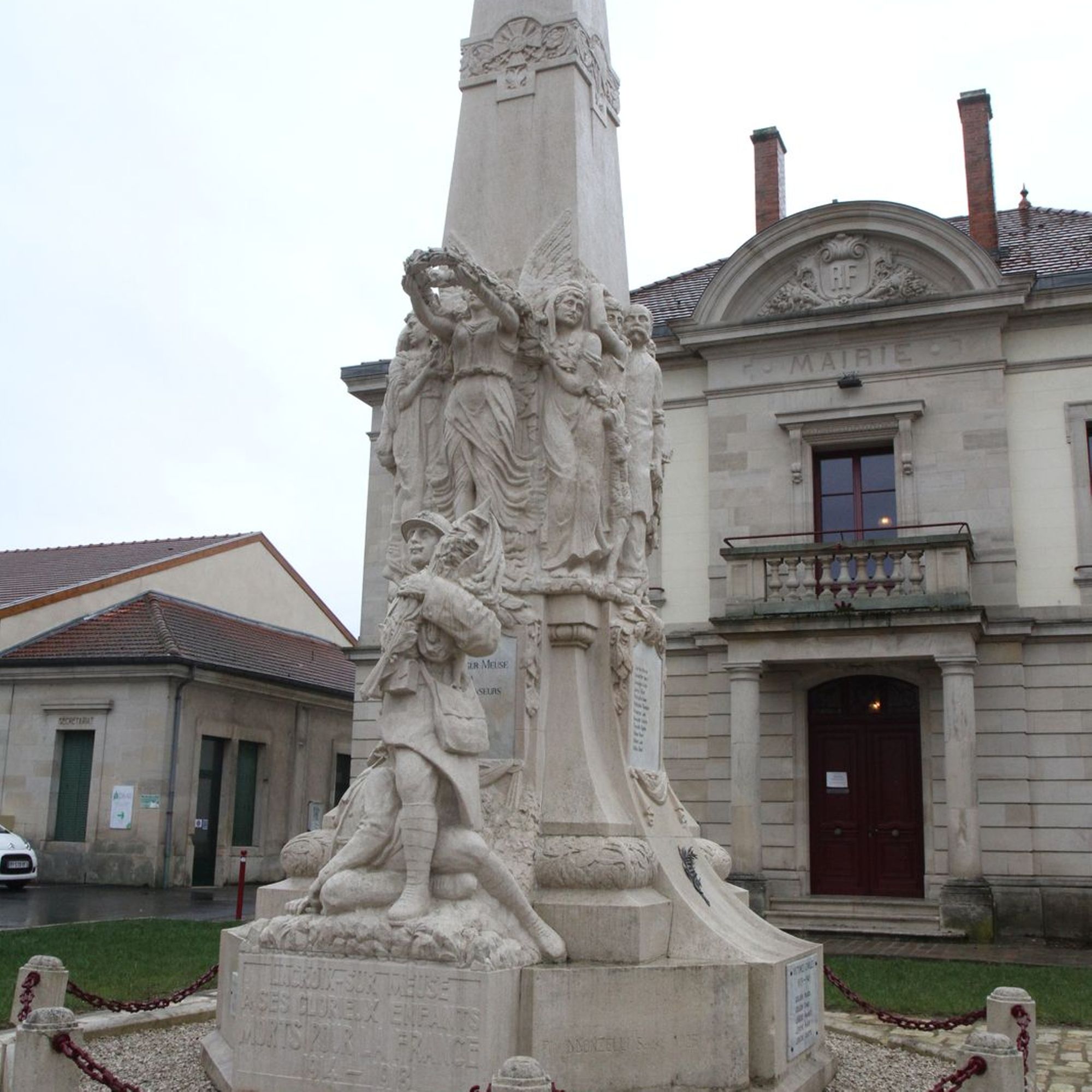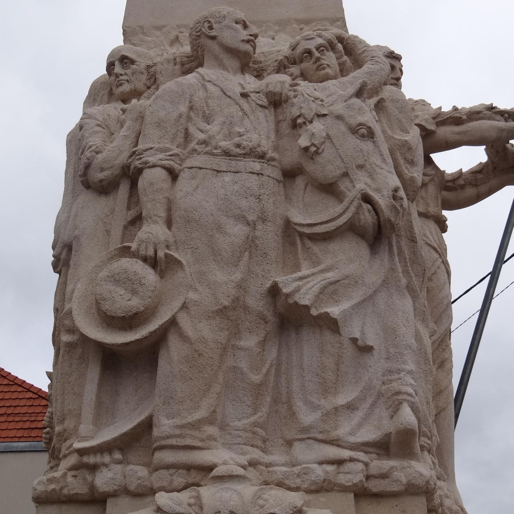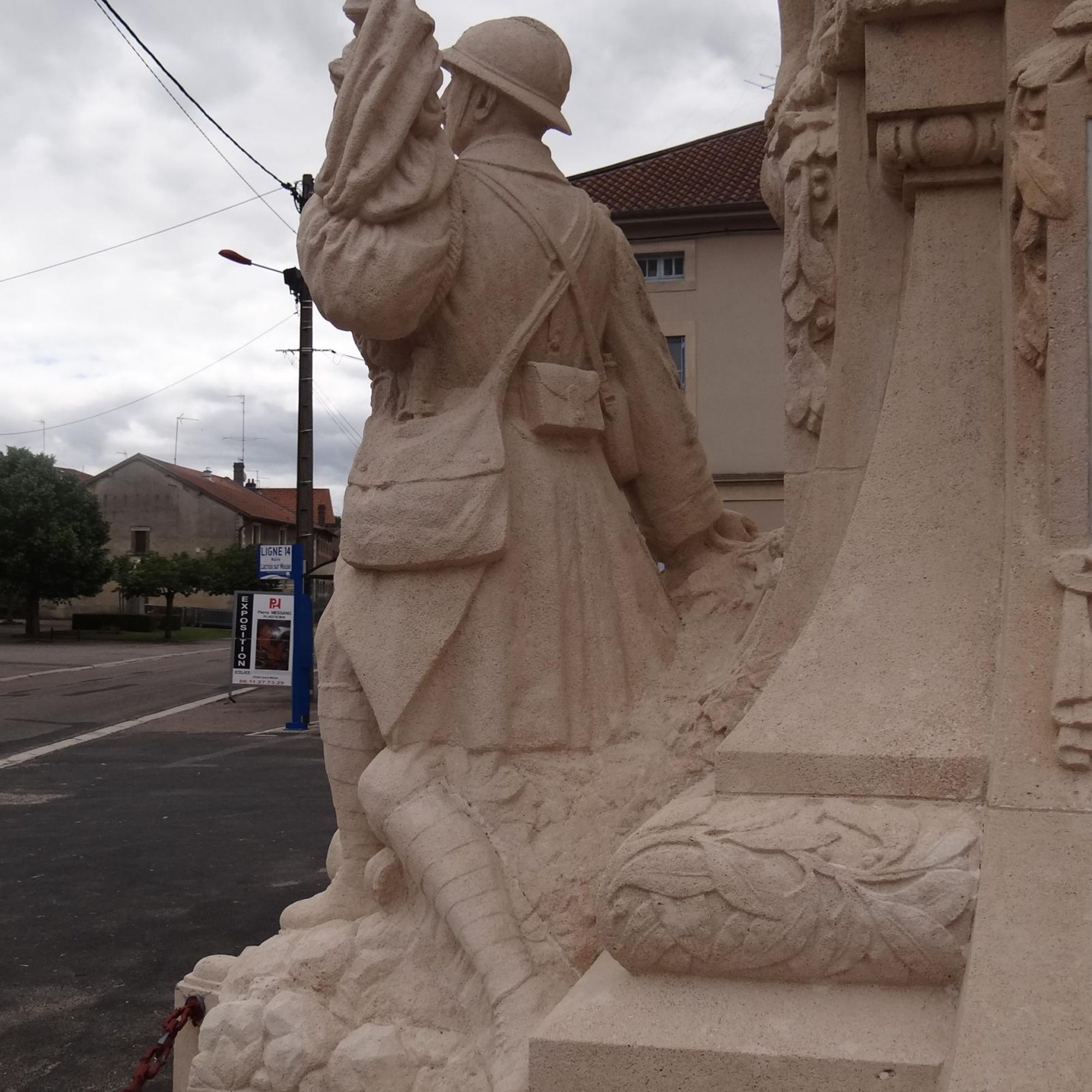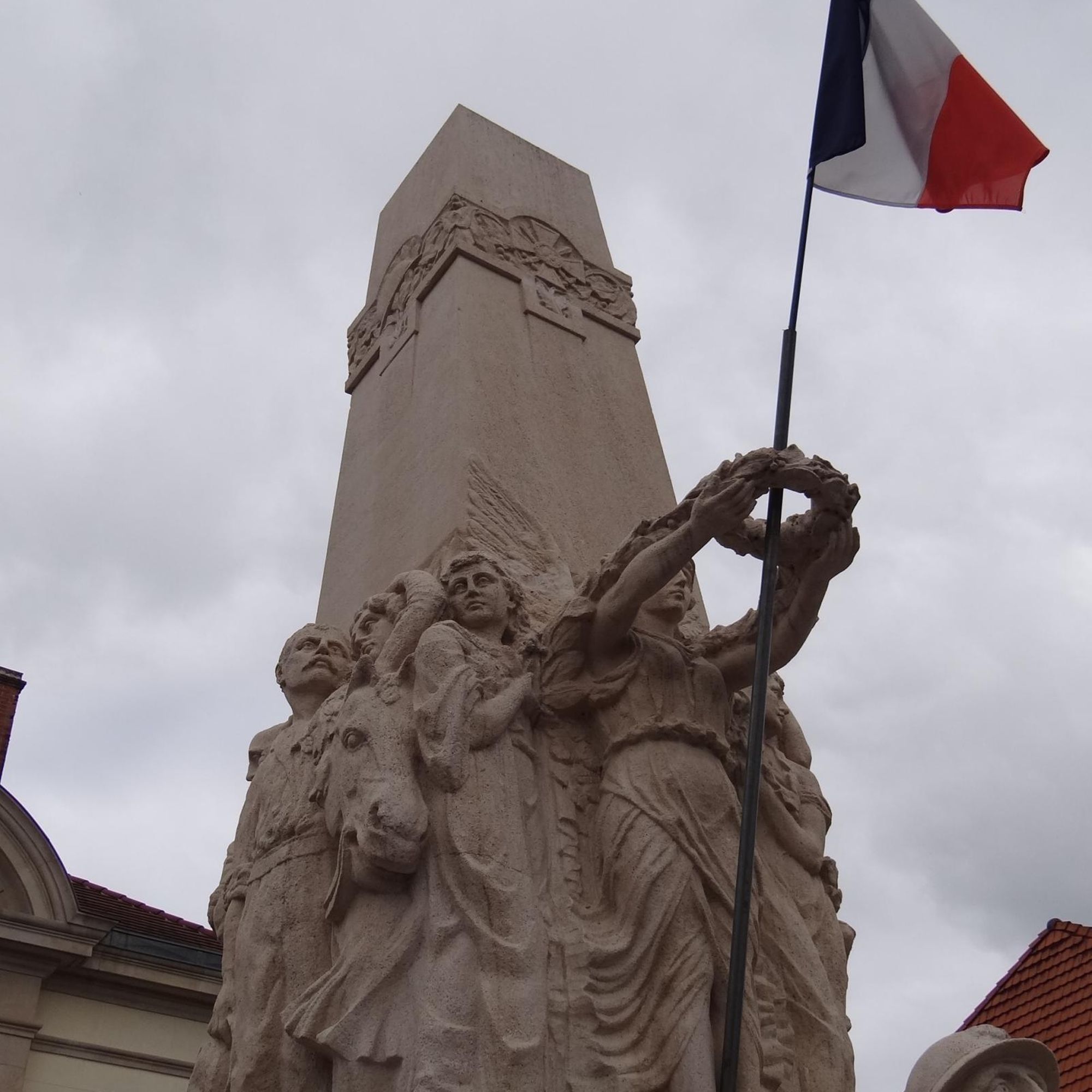 Obélisque sur socle devancé par une statue représentant un poilu tenant le drapeau posant de sa main droite des lauriers sur la tête d'un camarade mort.