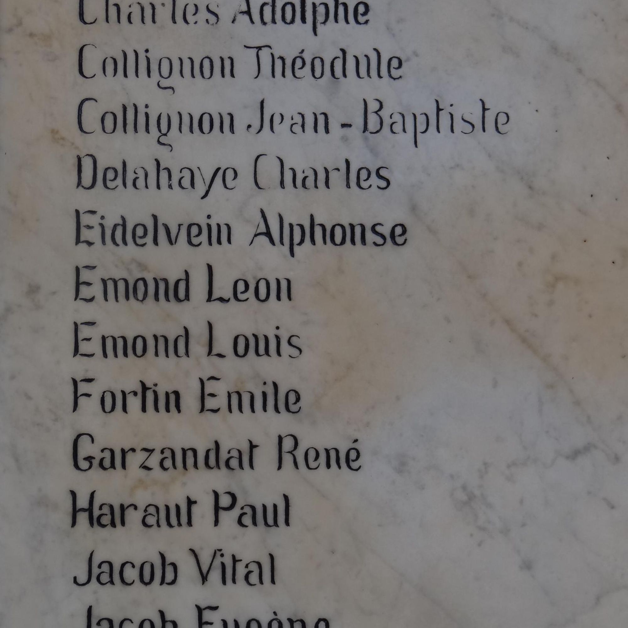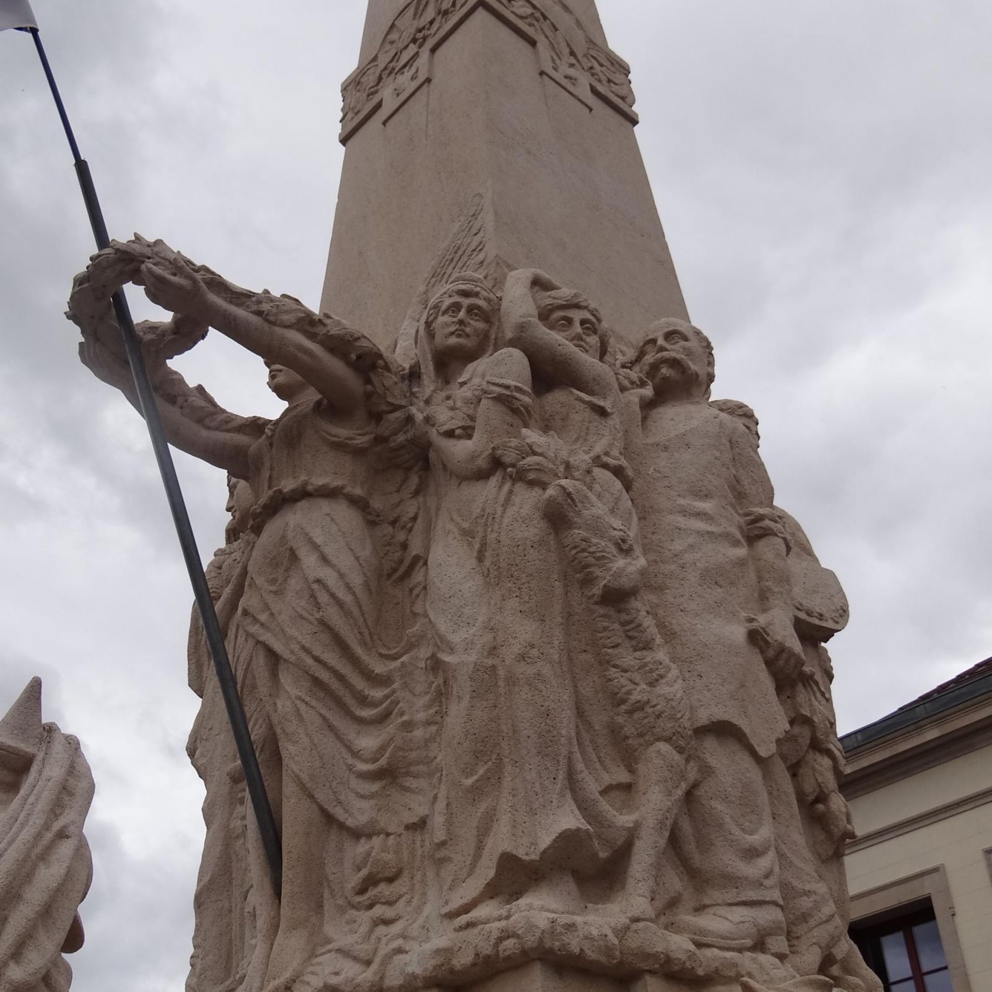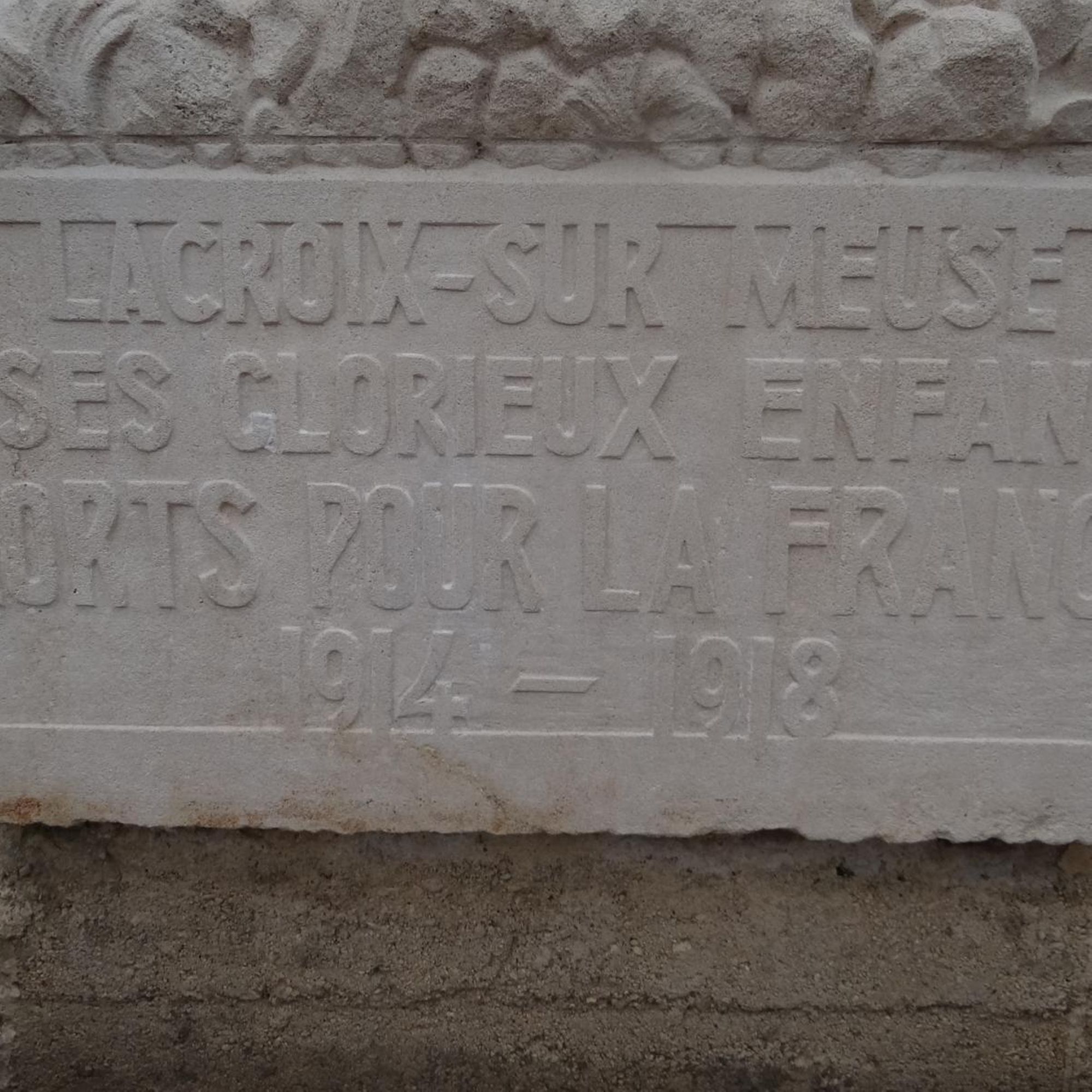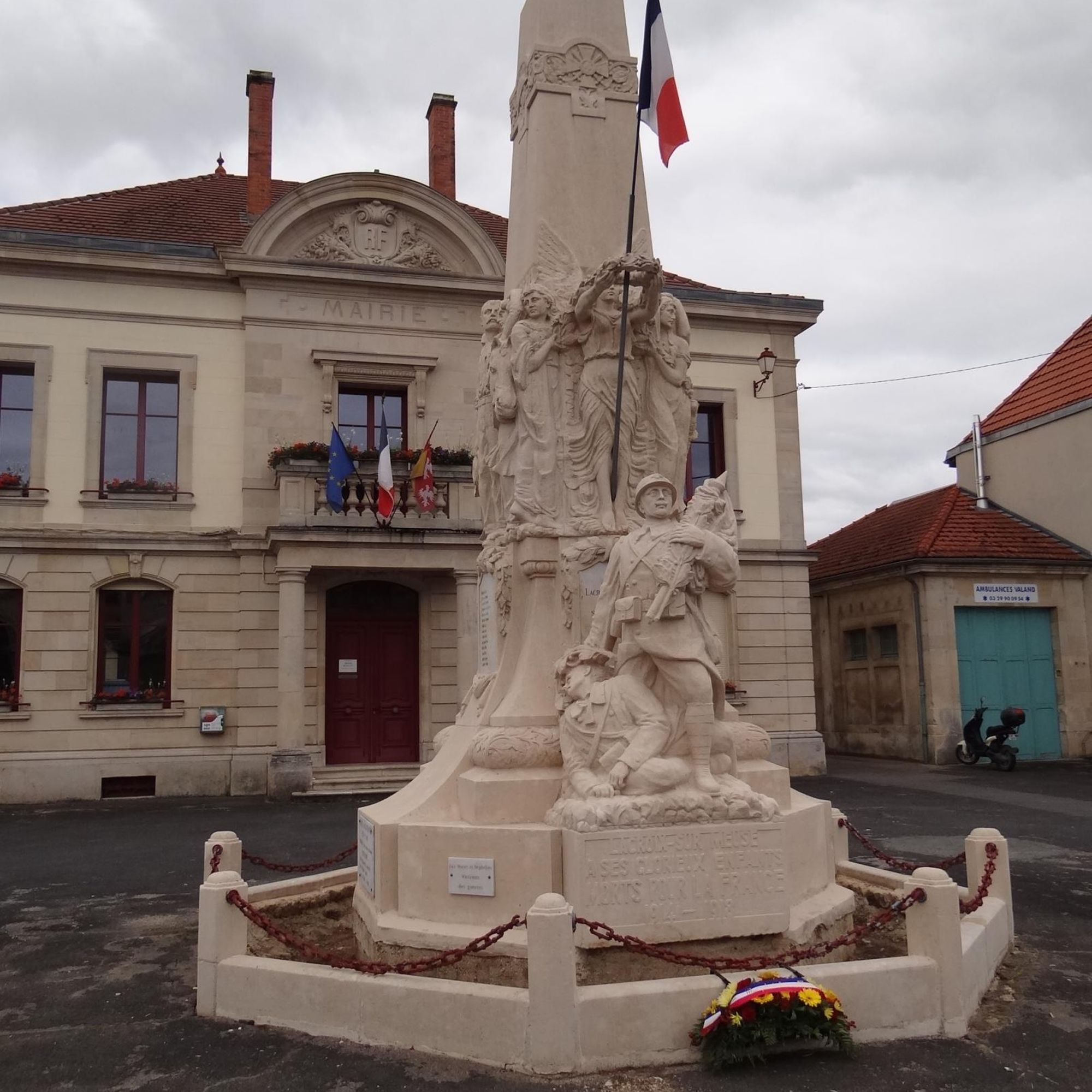Obélisque sur socle devancé par une statue représentant un poilu tenant le drapeau posant de sa main droite des lauriers sur la tête d'un camarade mort.