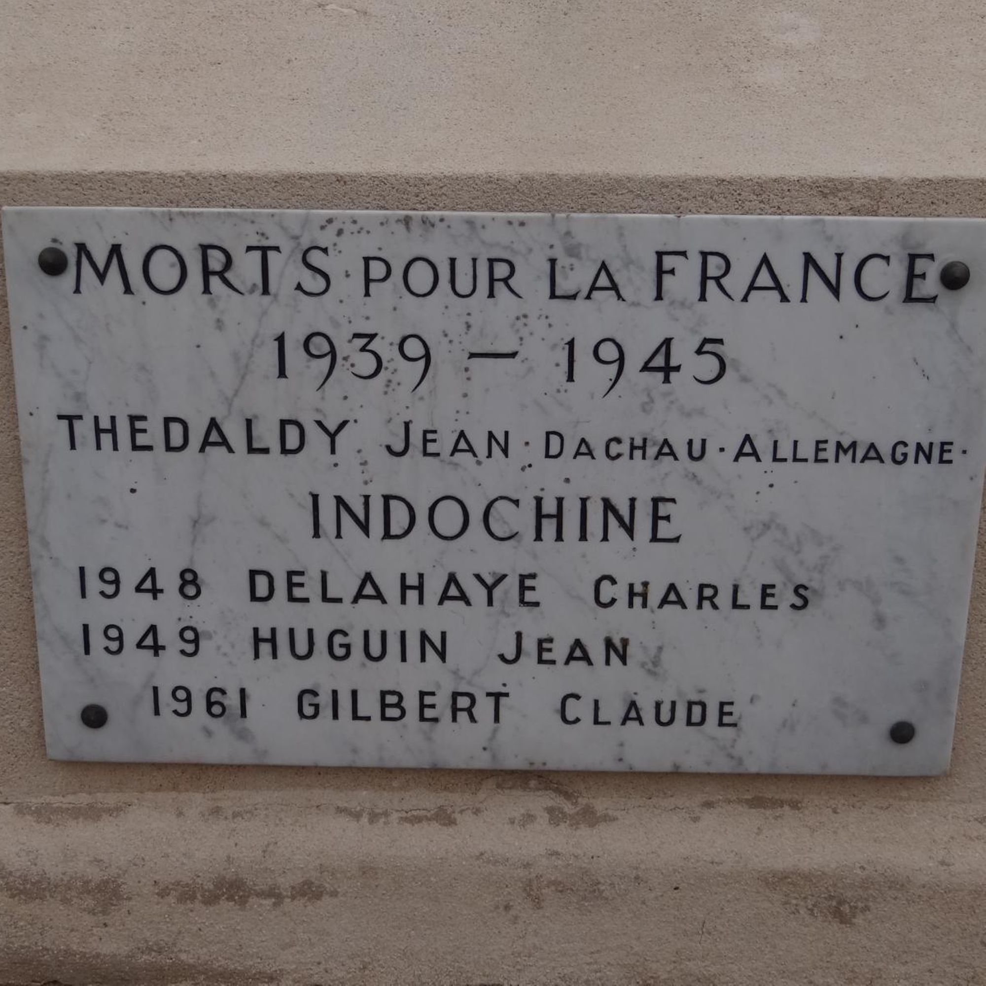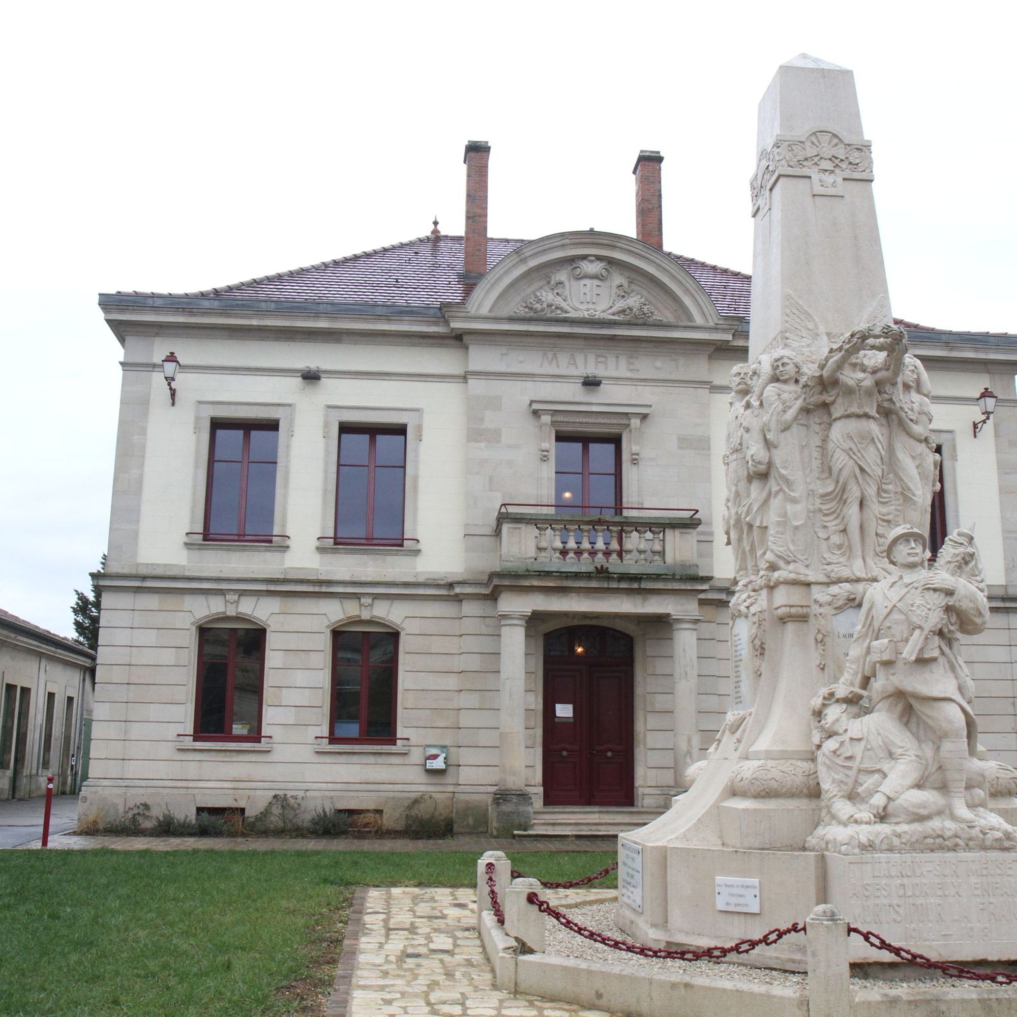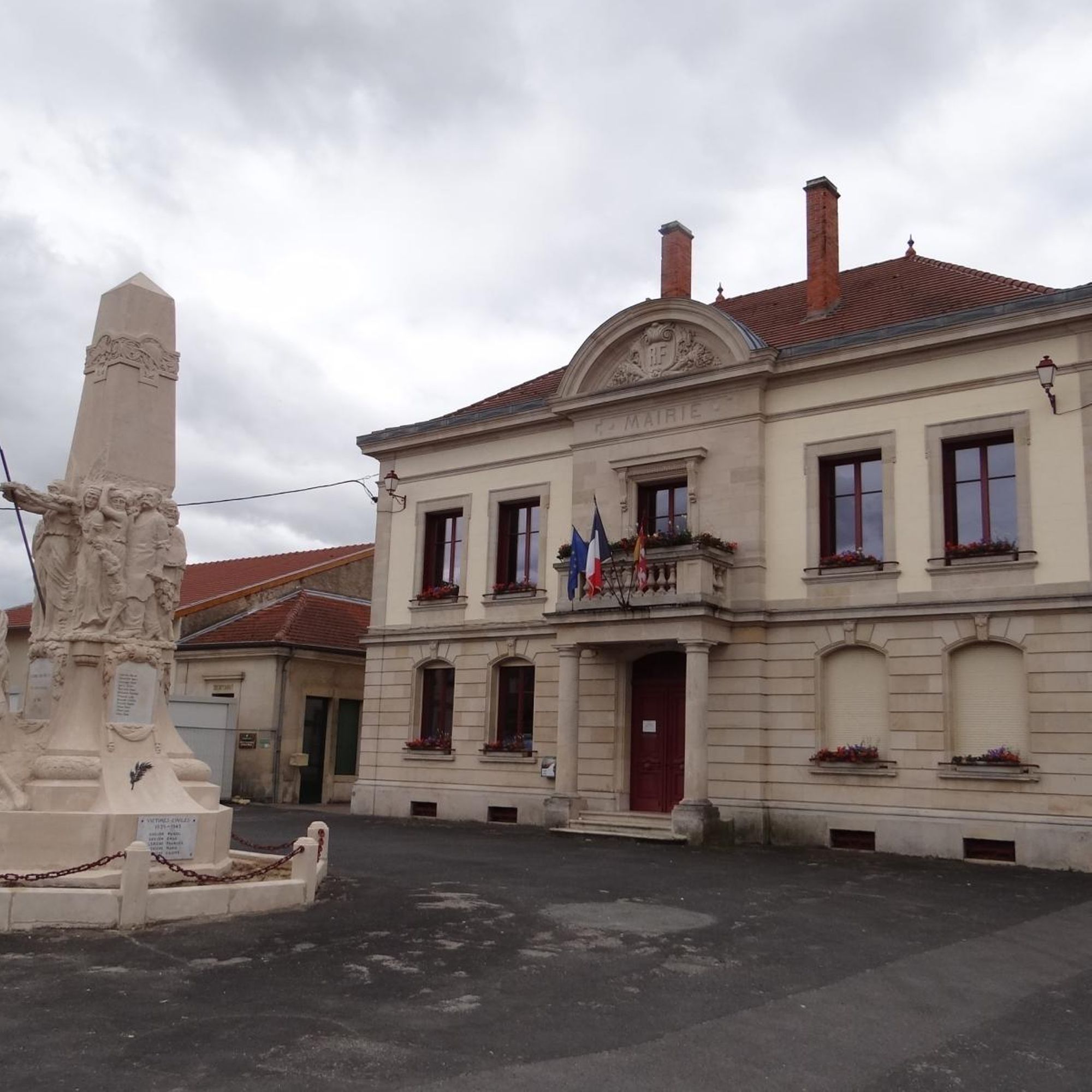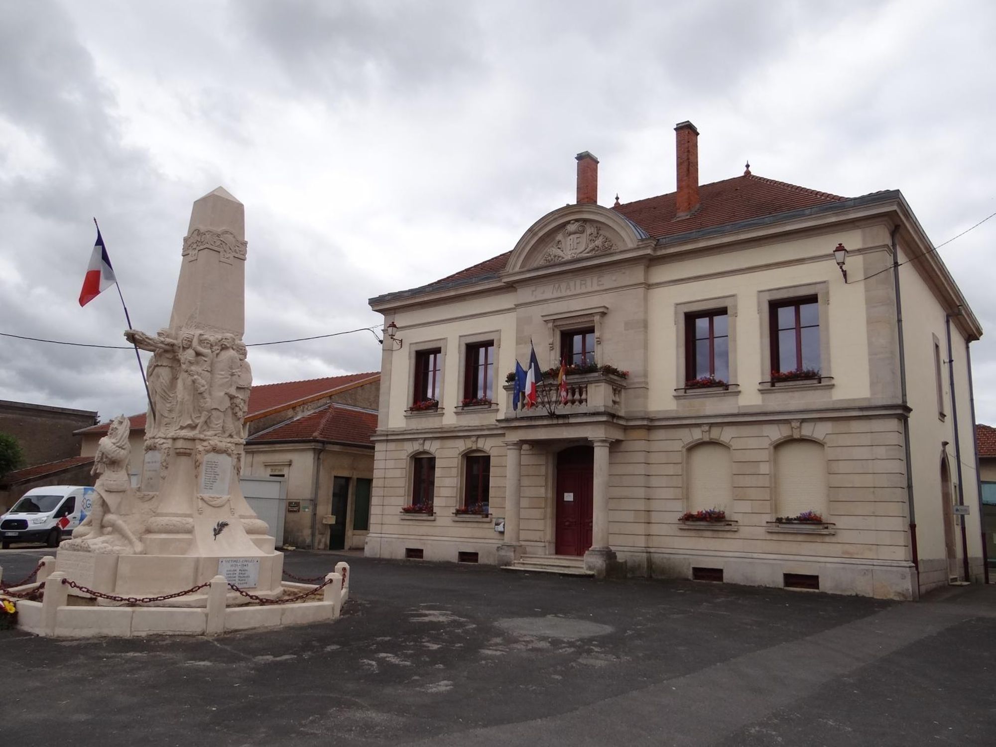 Obélisque sur socle devancé par une statue représentant un poilu tenant le drapeau posant de sa main droite des lauriers sur la tête d'un camarade mort.