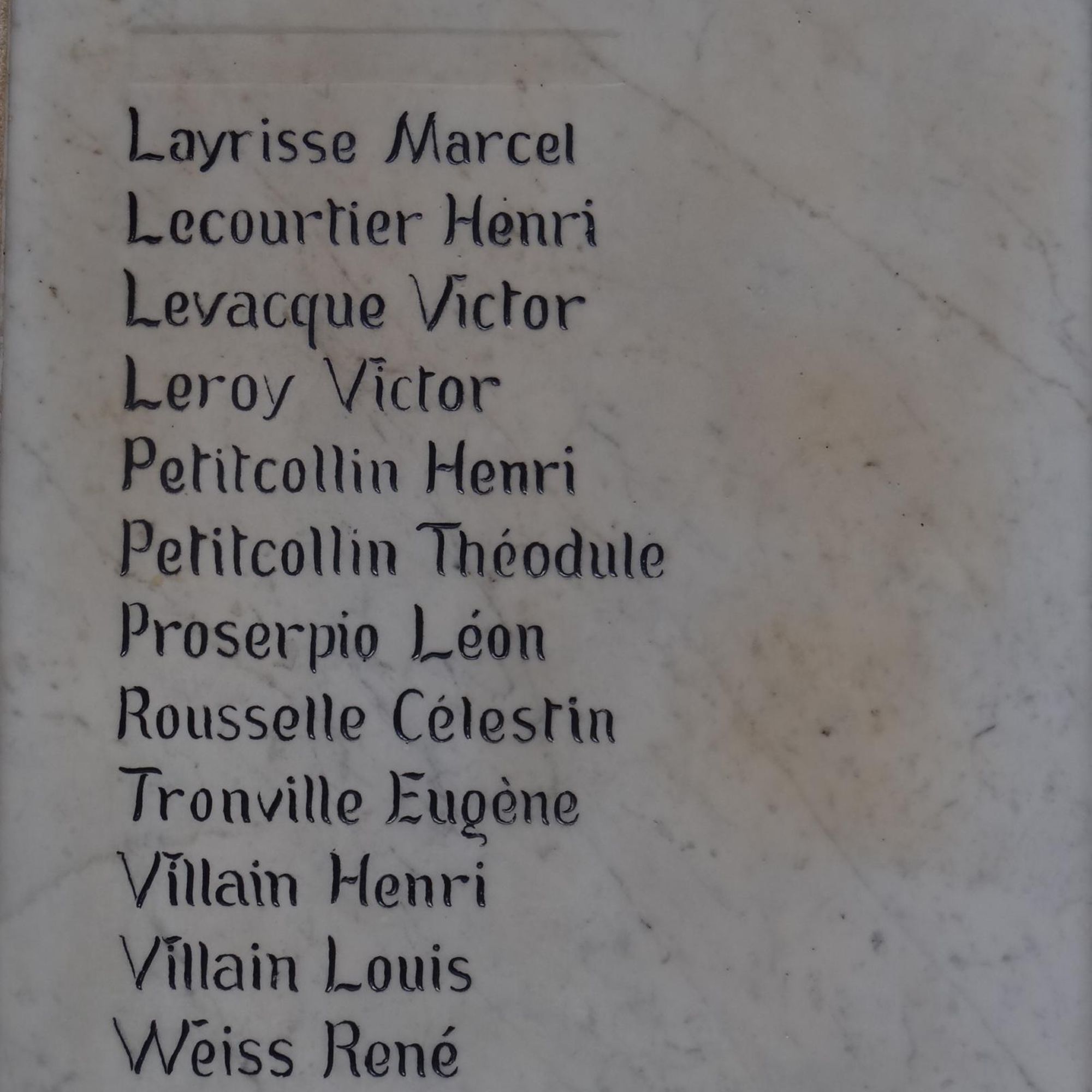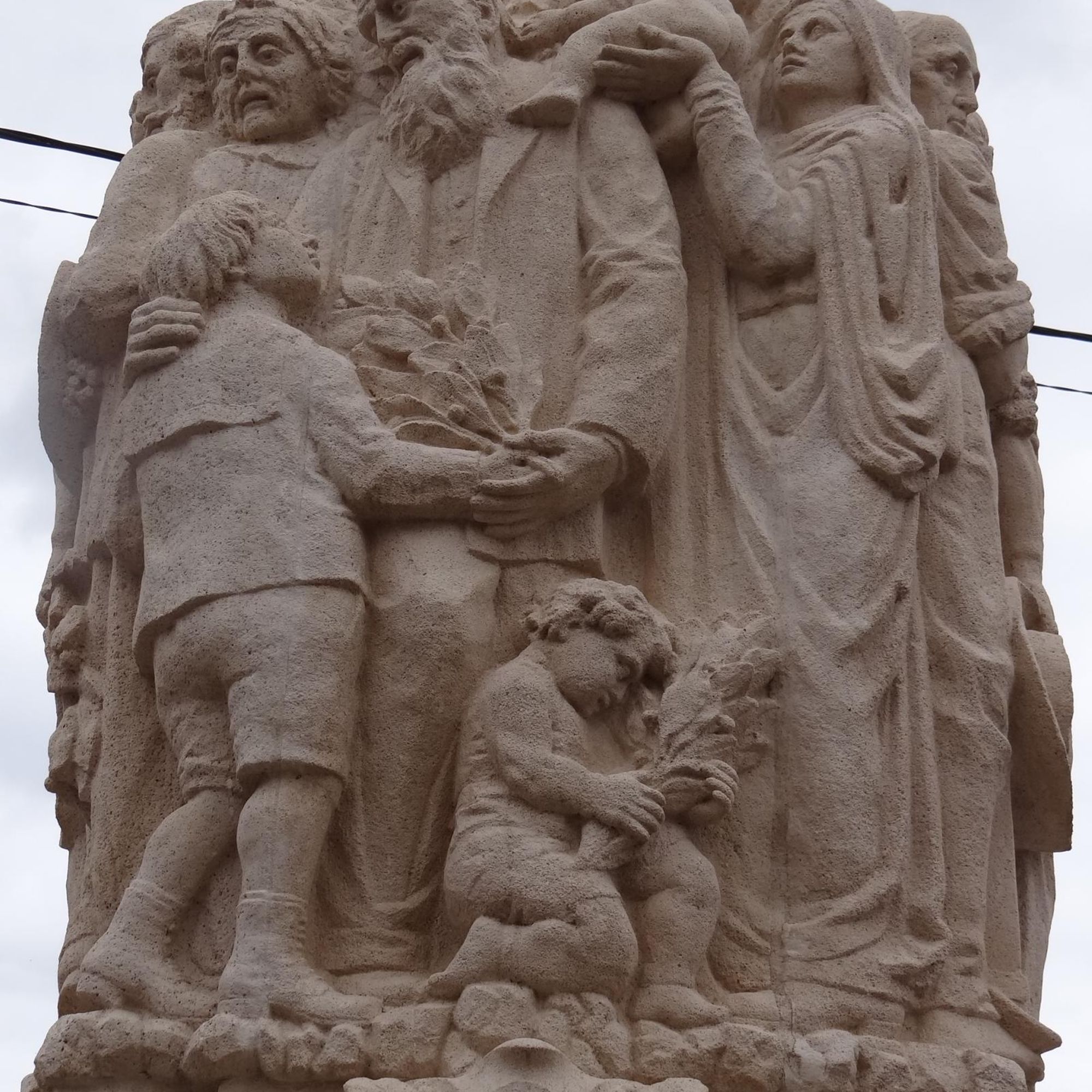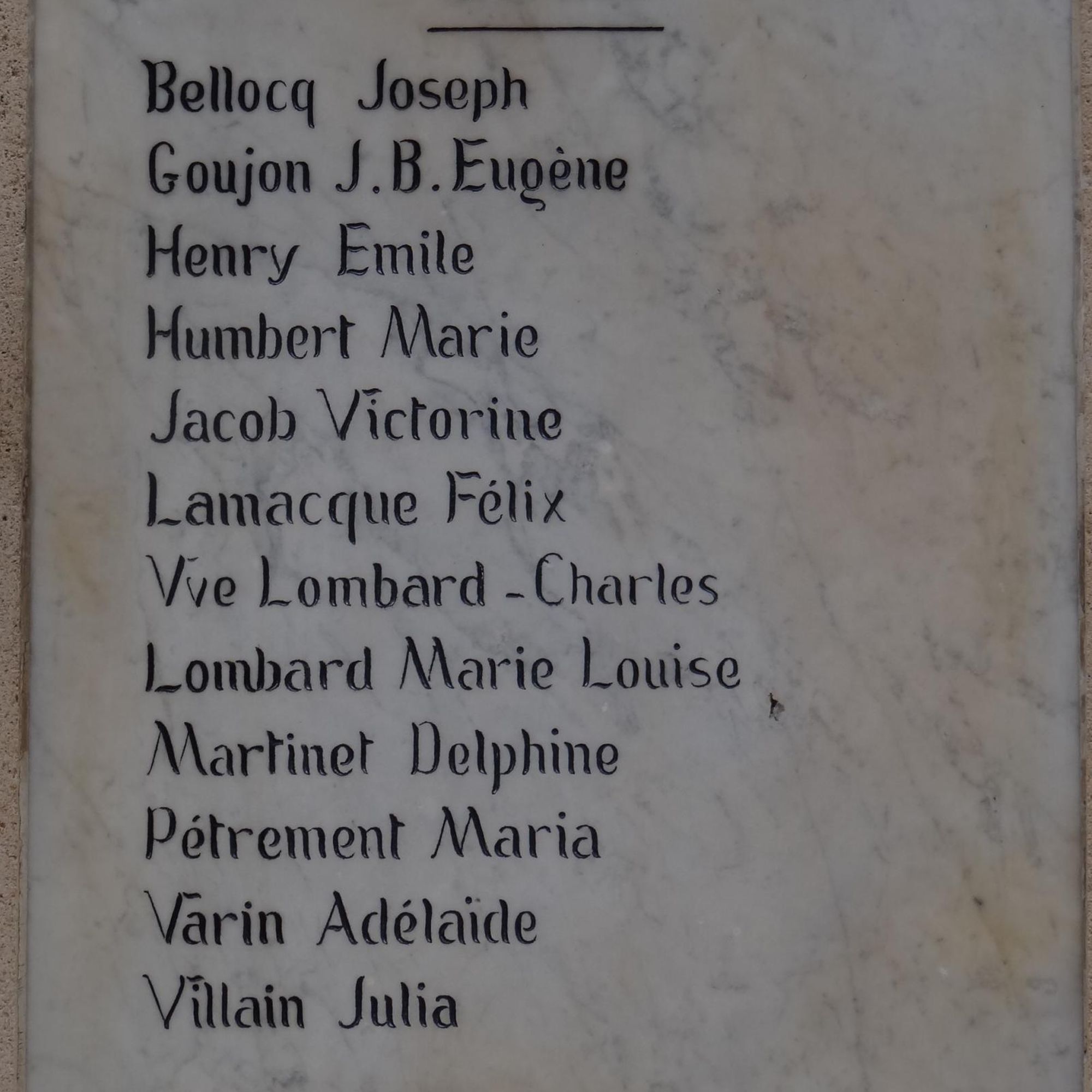 Ces personnages sont tous des civils, on y distingue deux enfants, un bébé, plusieurs cultivateurs dont un avec sa faux, un instituteur, trois femmes,+ une avec un bonnet phrygien s'appuyant sur la Victoire ailée ; un cheval et un mouton.