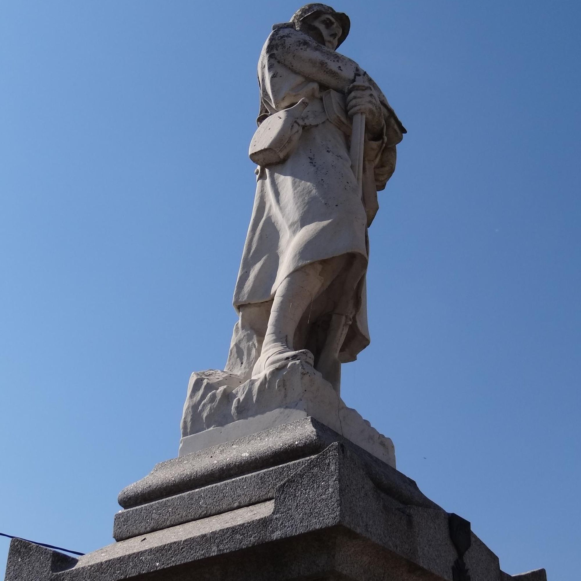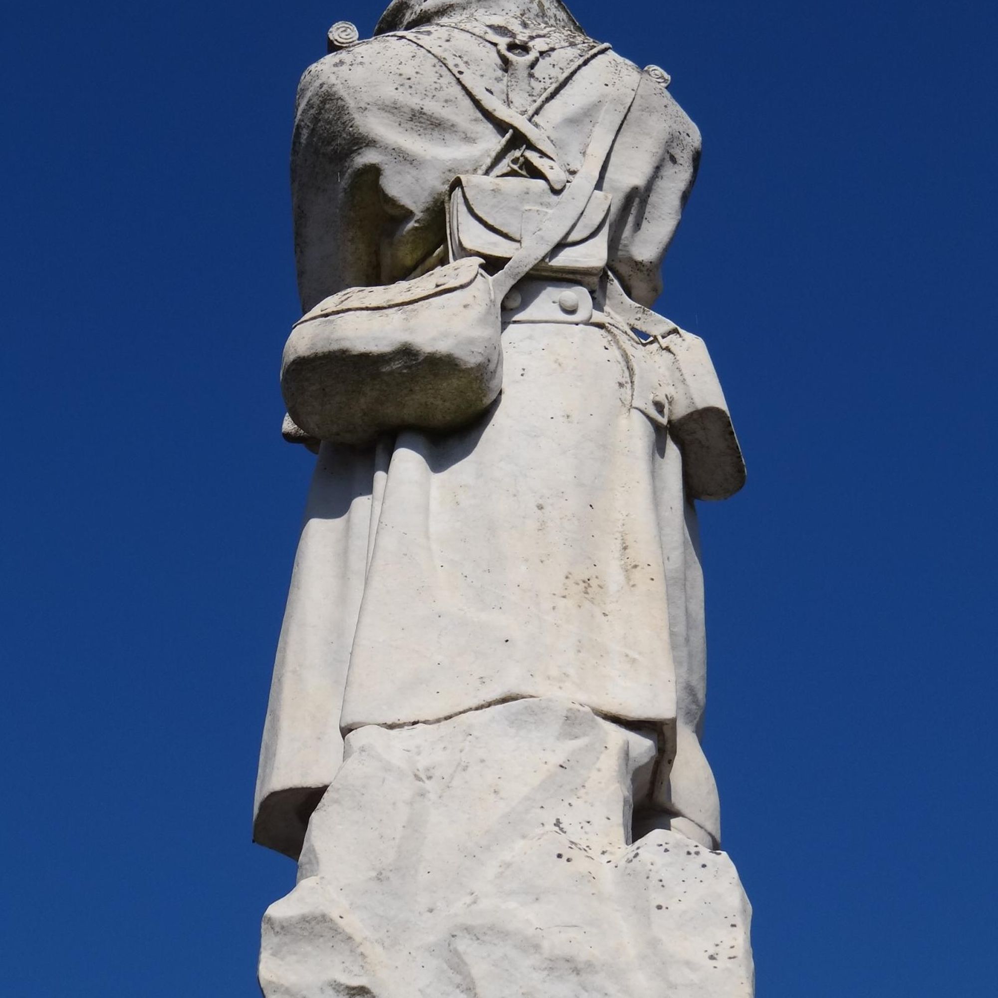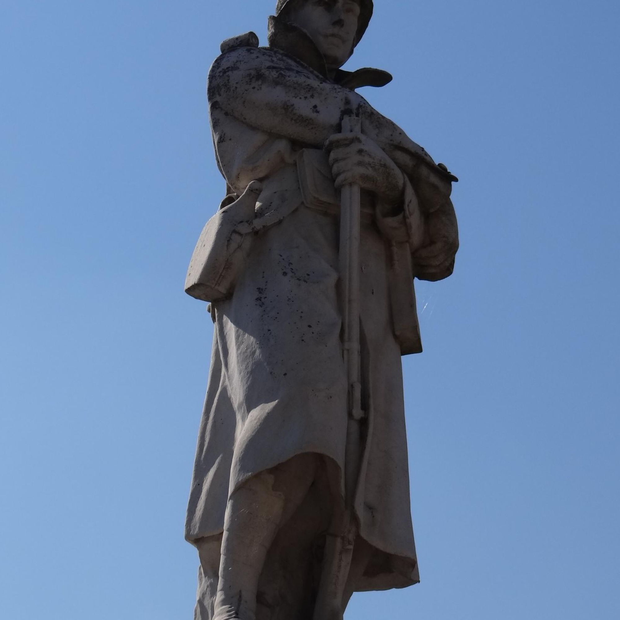 La statue est celle d'un soldat montant la garde, attentif, les bras croisés, tenant son fusil de sa main gauche, fusil crosse au sol.