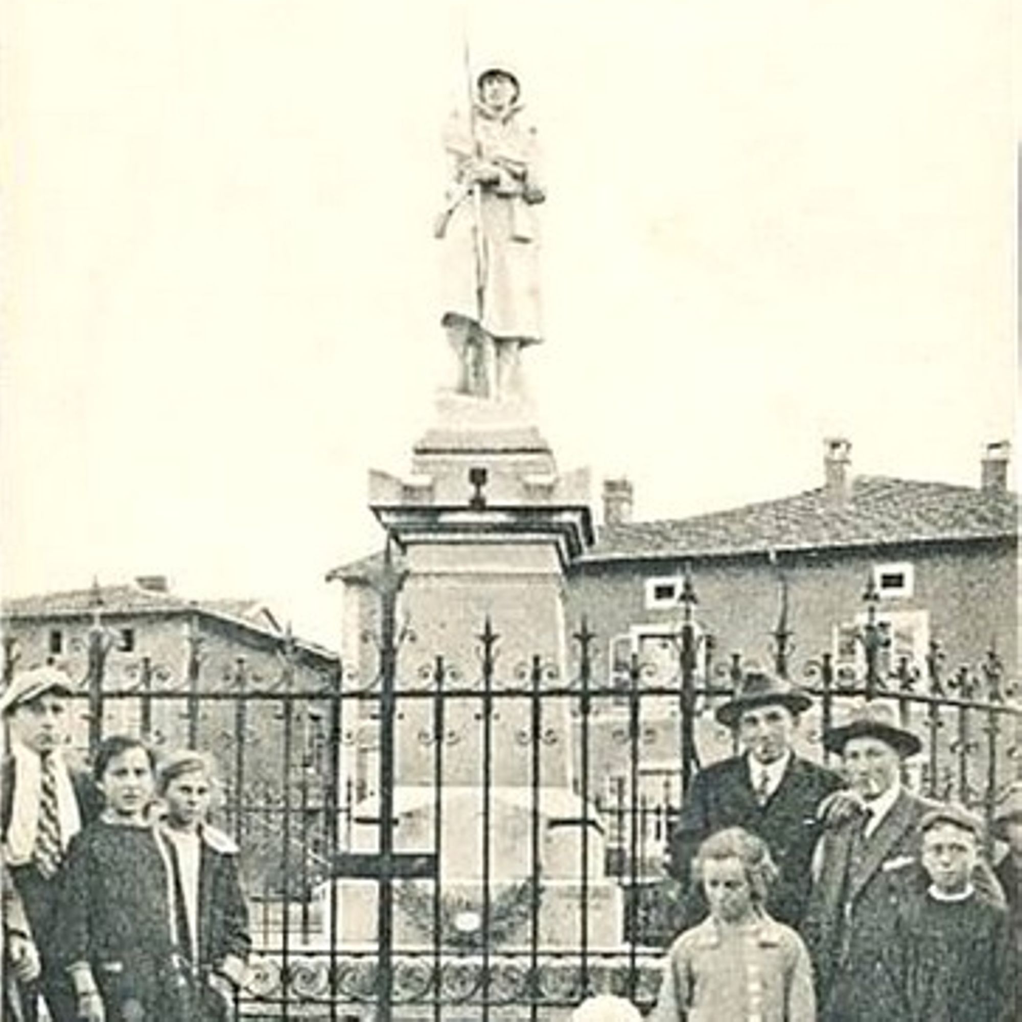 Espace octogonal délimité par des murets au creux duquel, balisé par quatre obus, un obélisque sur socle est surmonté d'une statue de poliu.