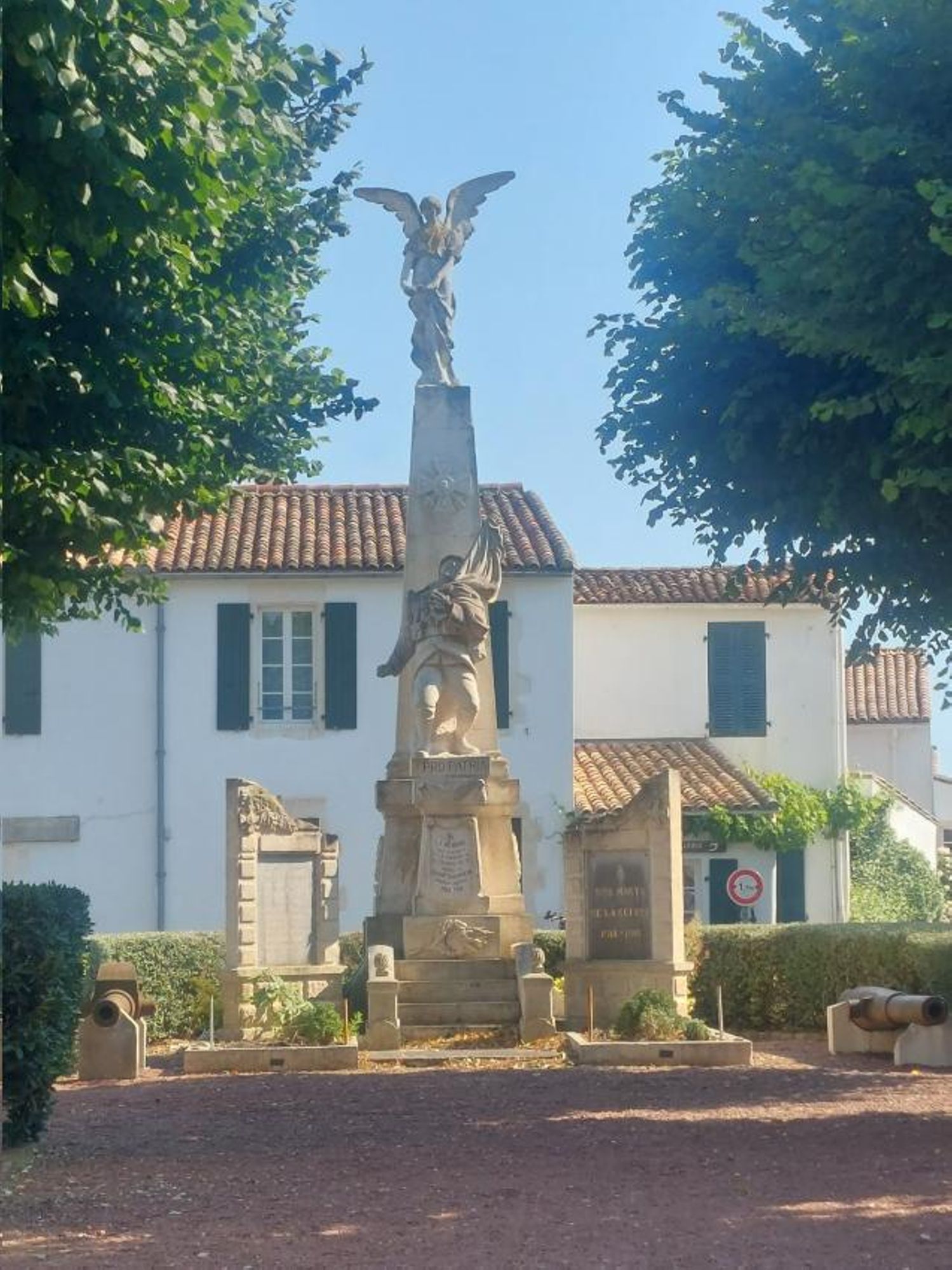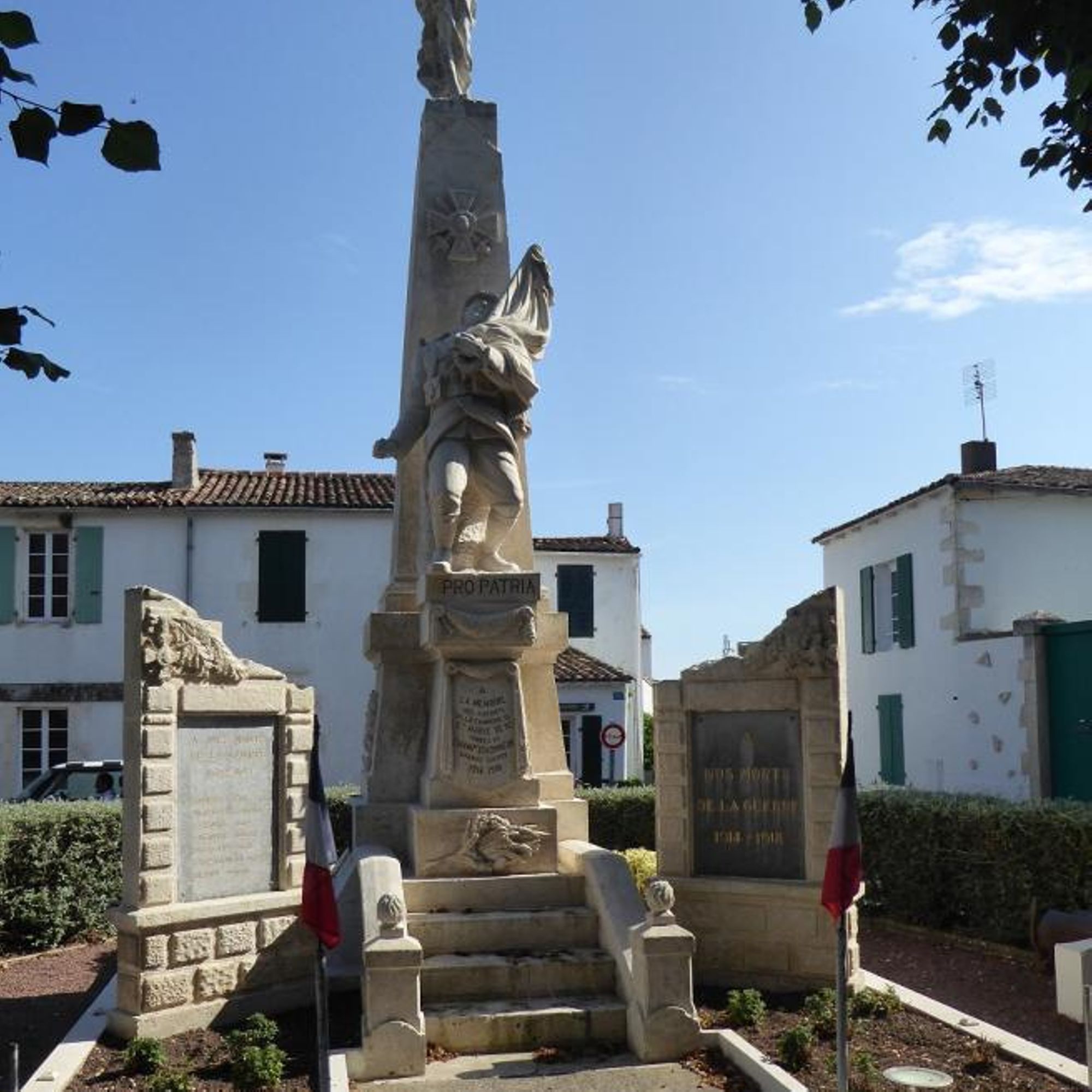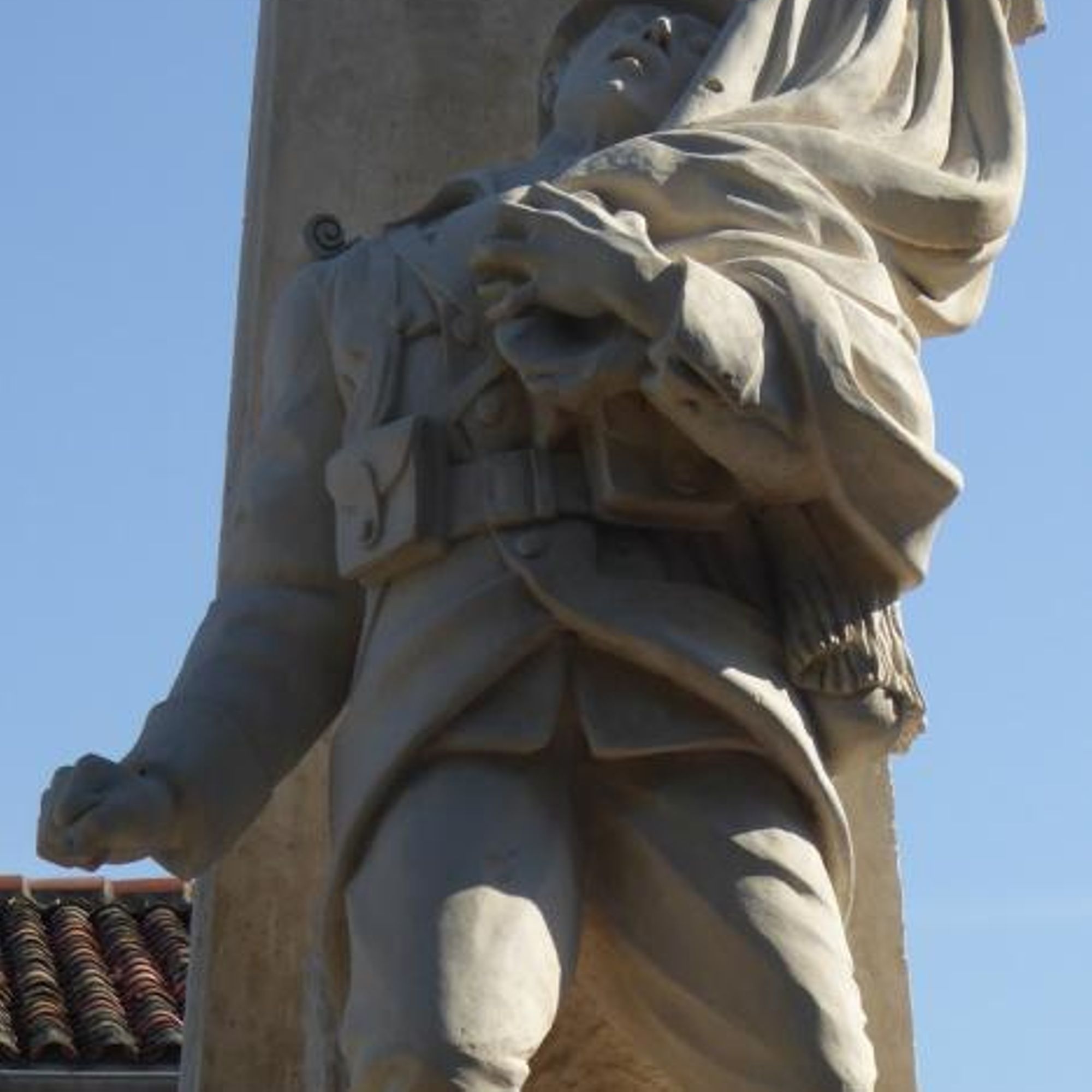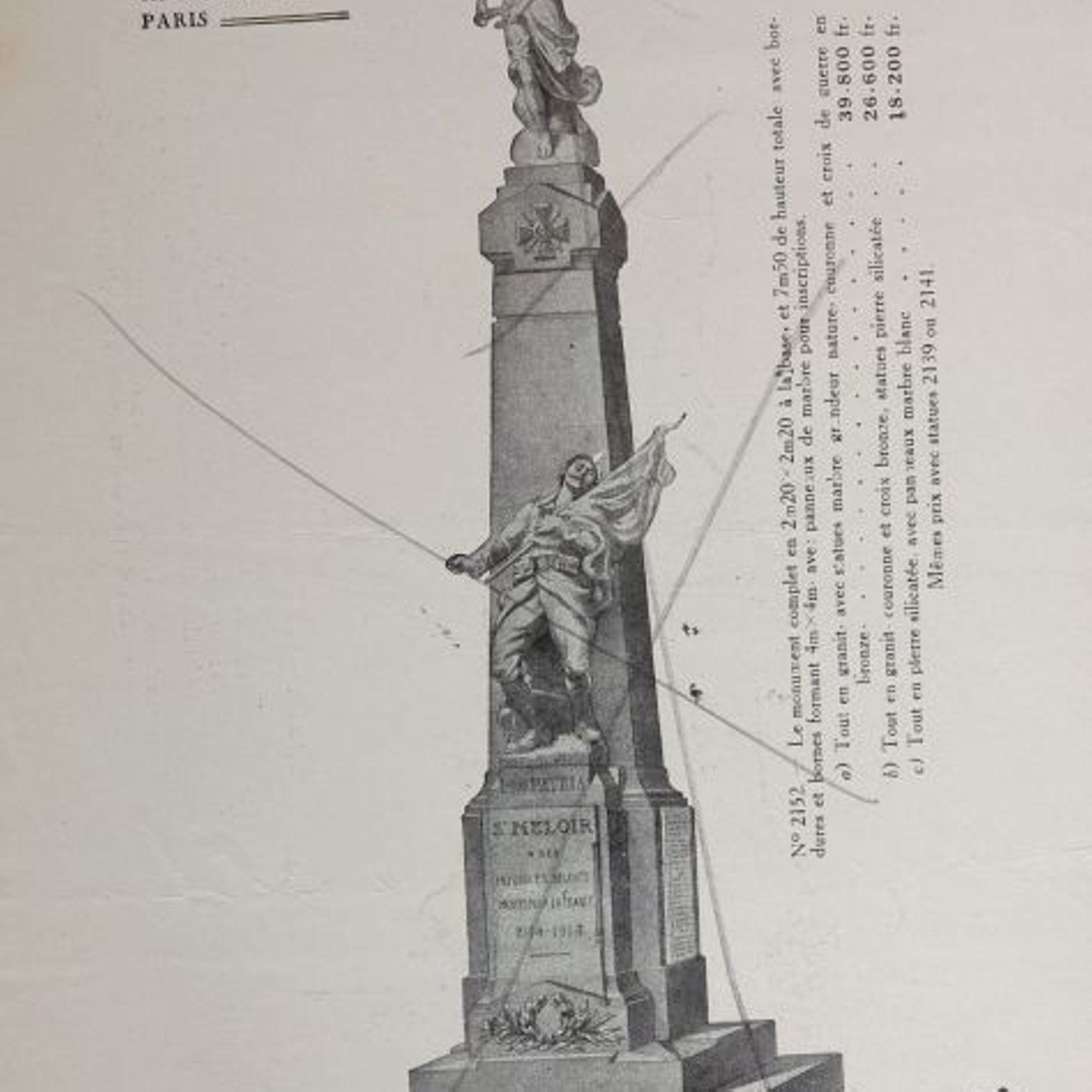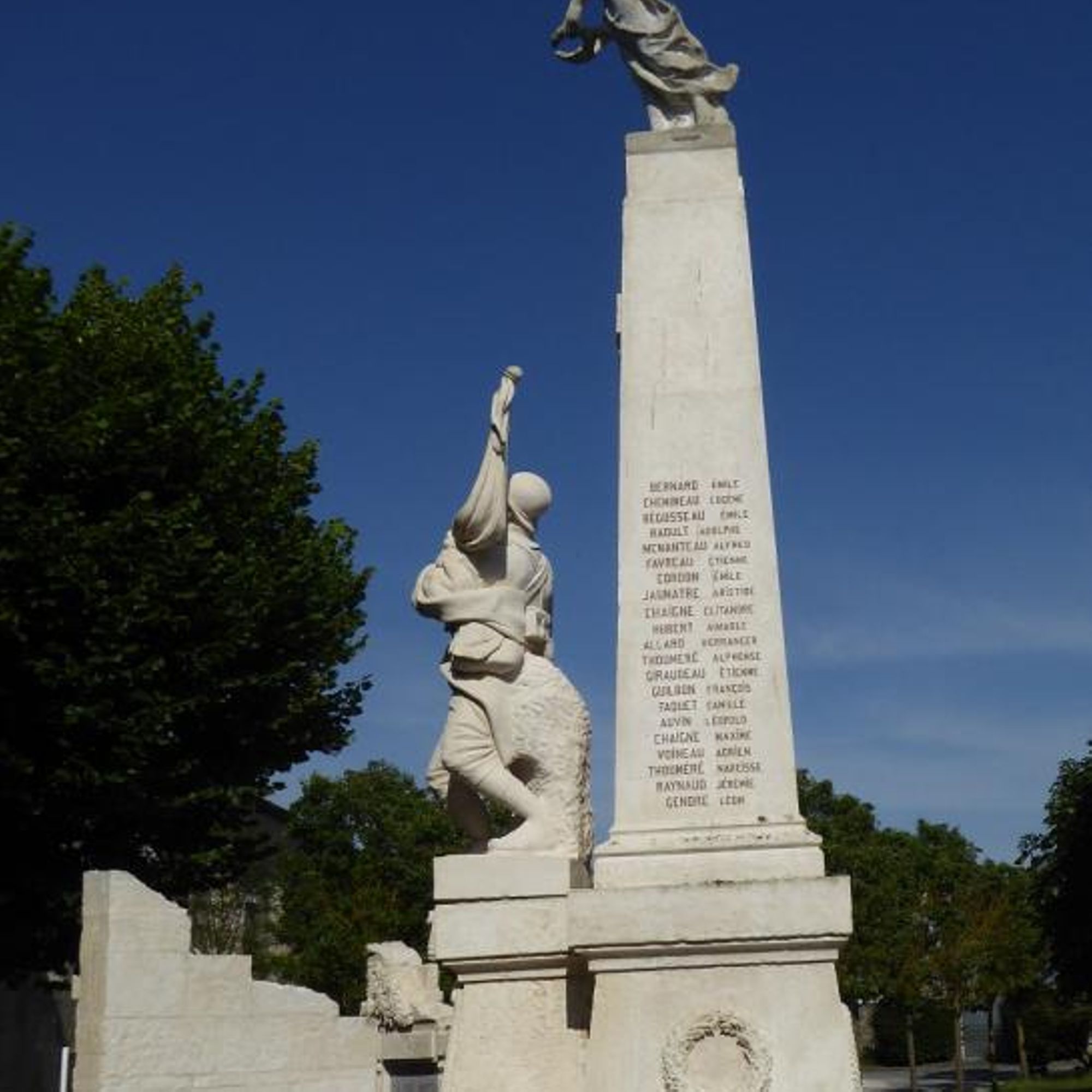 Colonne quadrangulaire avec une victoire ailée au sommet et un porte-drapeau blessé sur piedestal, devant.