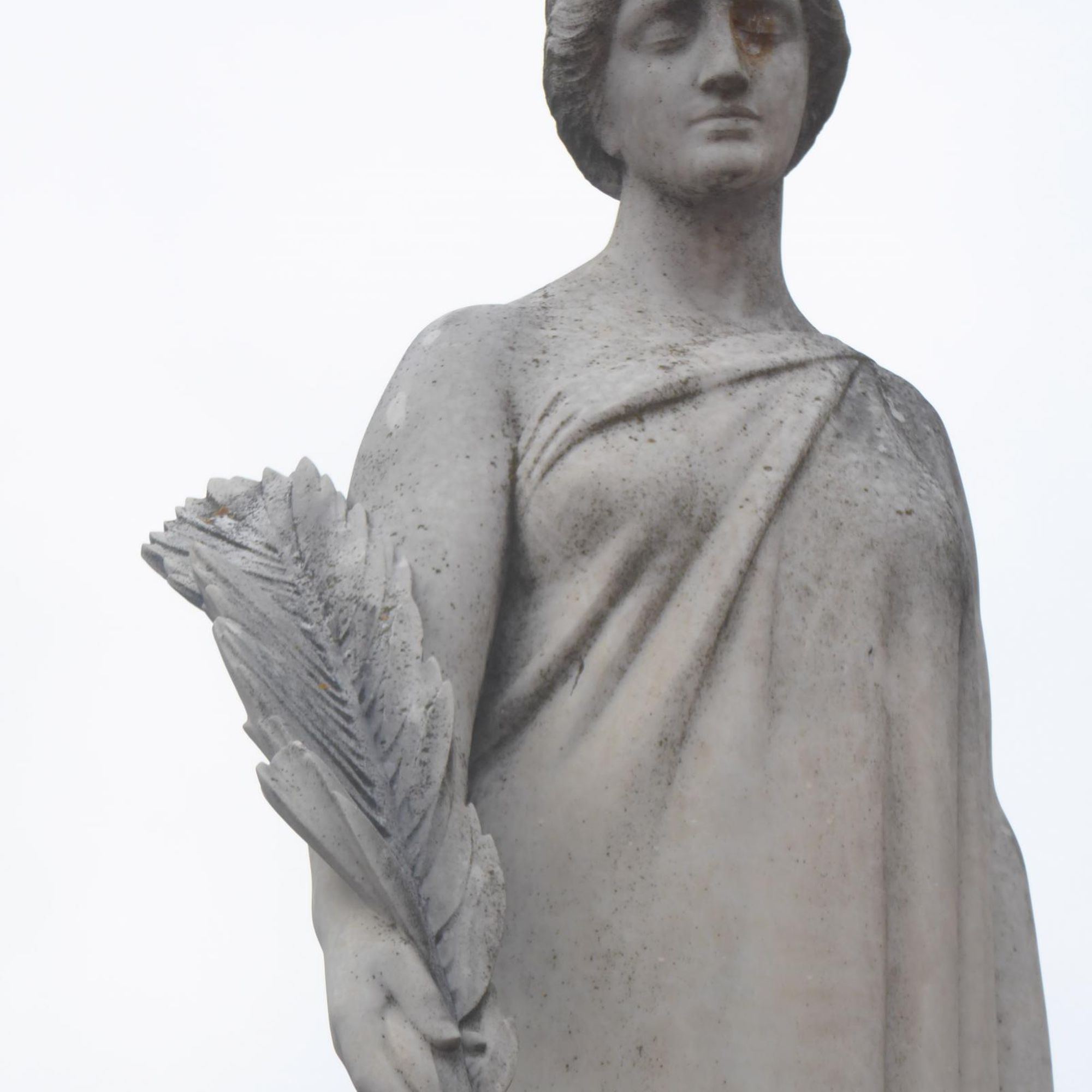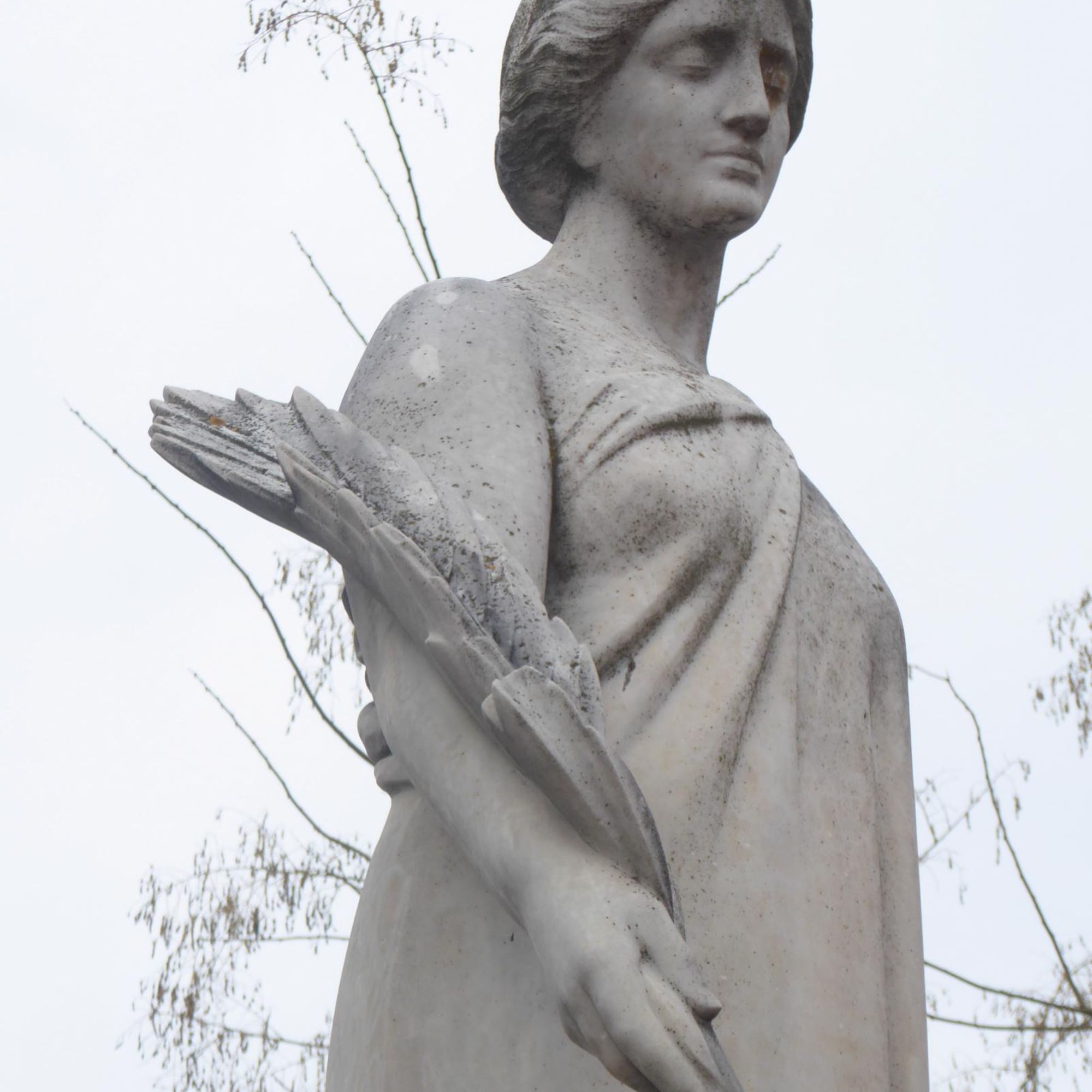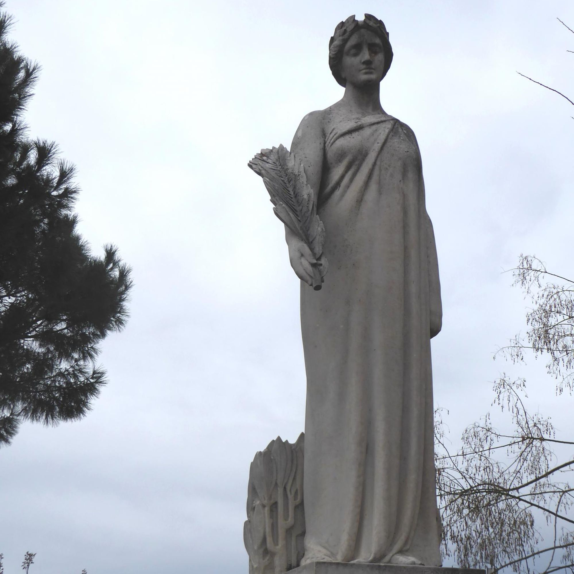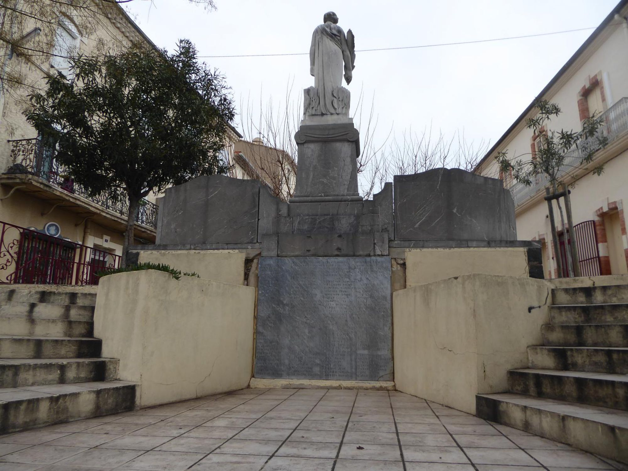 Au centre , sur un piédestal et sur assise à deux degrès se dresse une statue de femme représentant la Républque endeuillée tenant une palme dans la main droite.