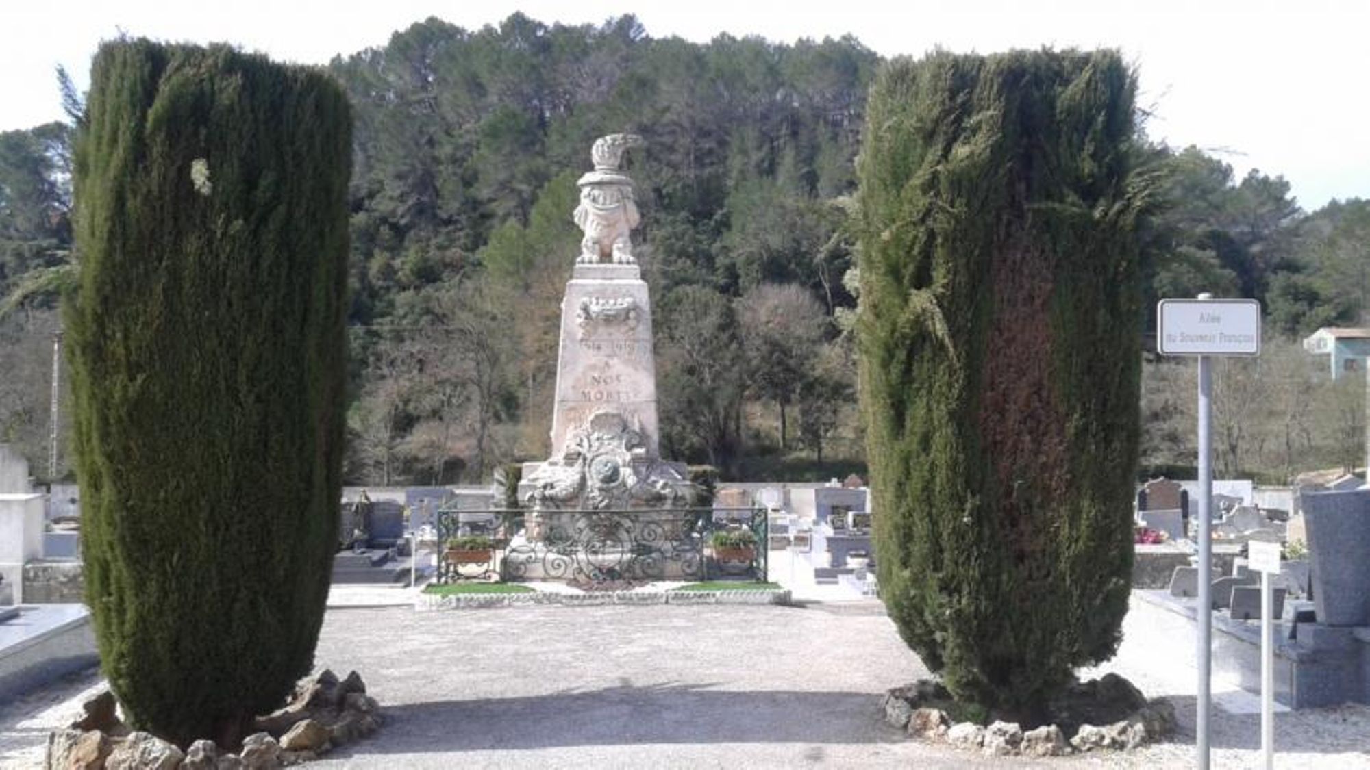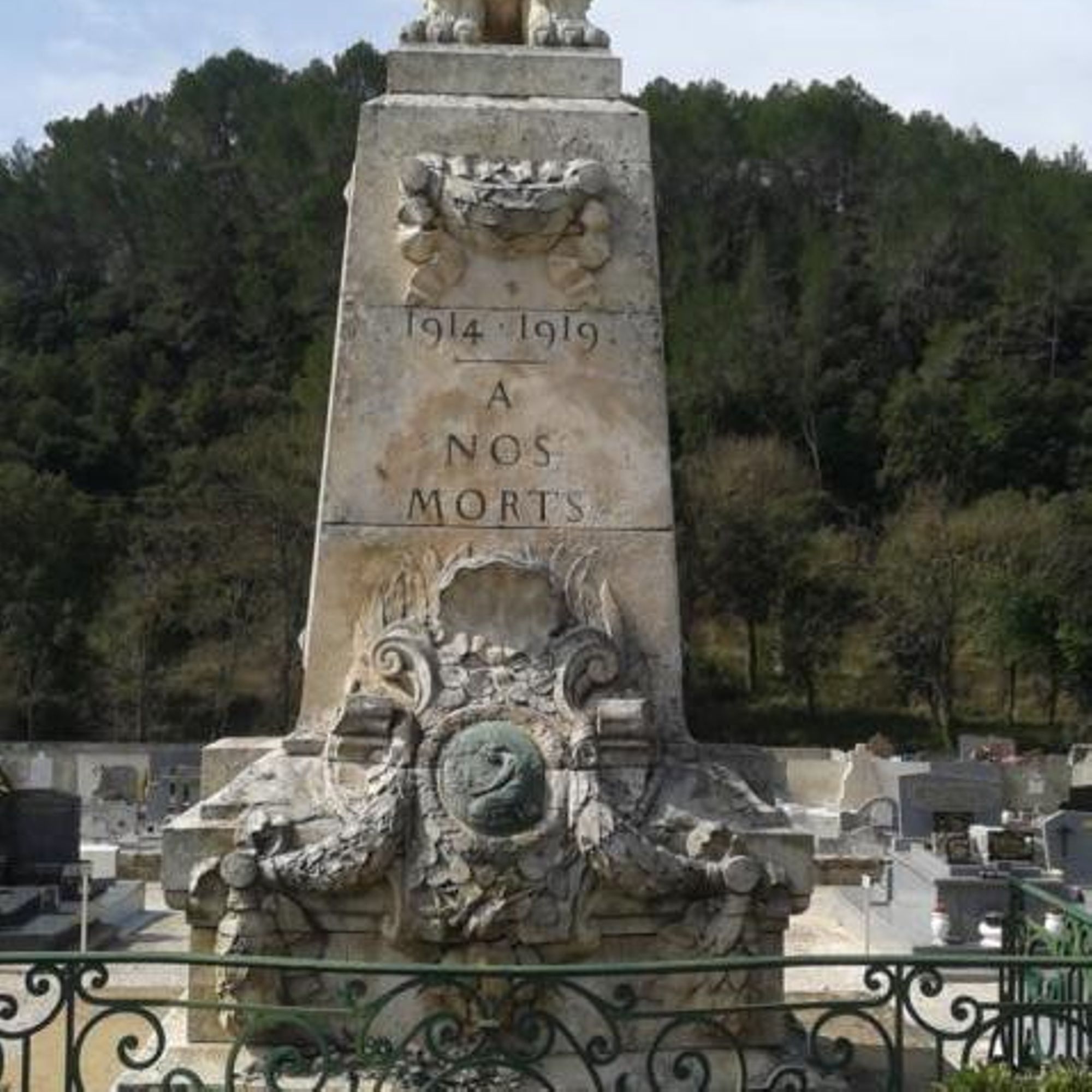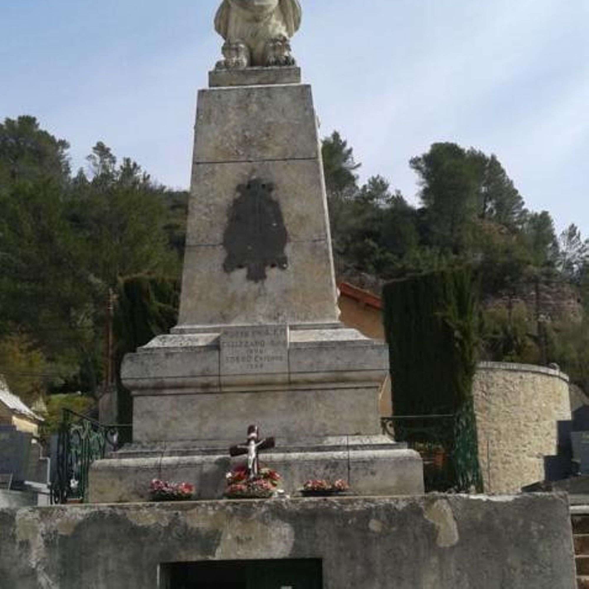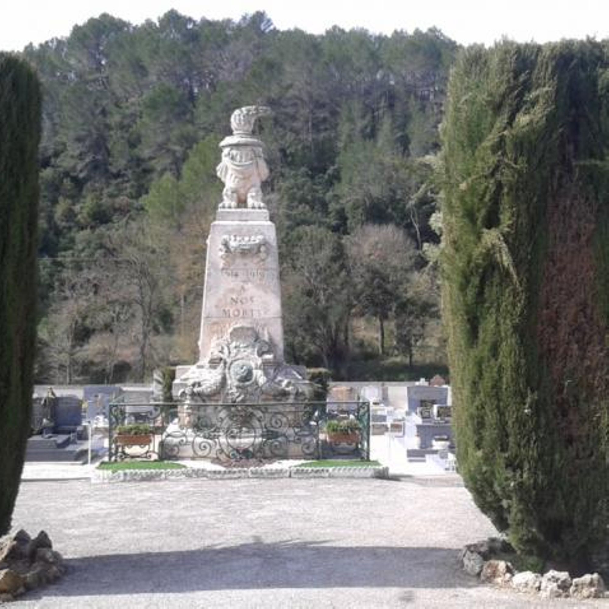 - pilier quadrangulaire sur socle, entourage grille métallique, surmonté d'une urne voilée avec flambeau
