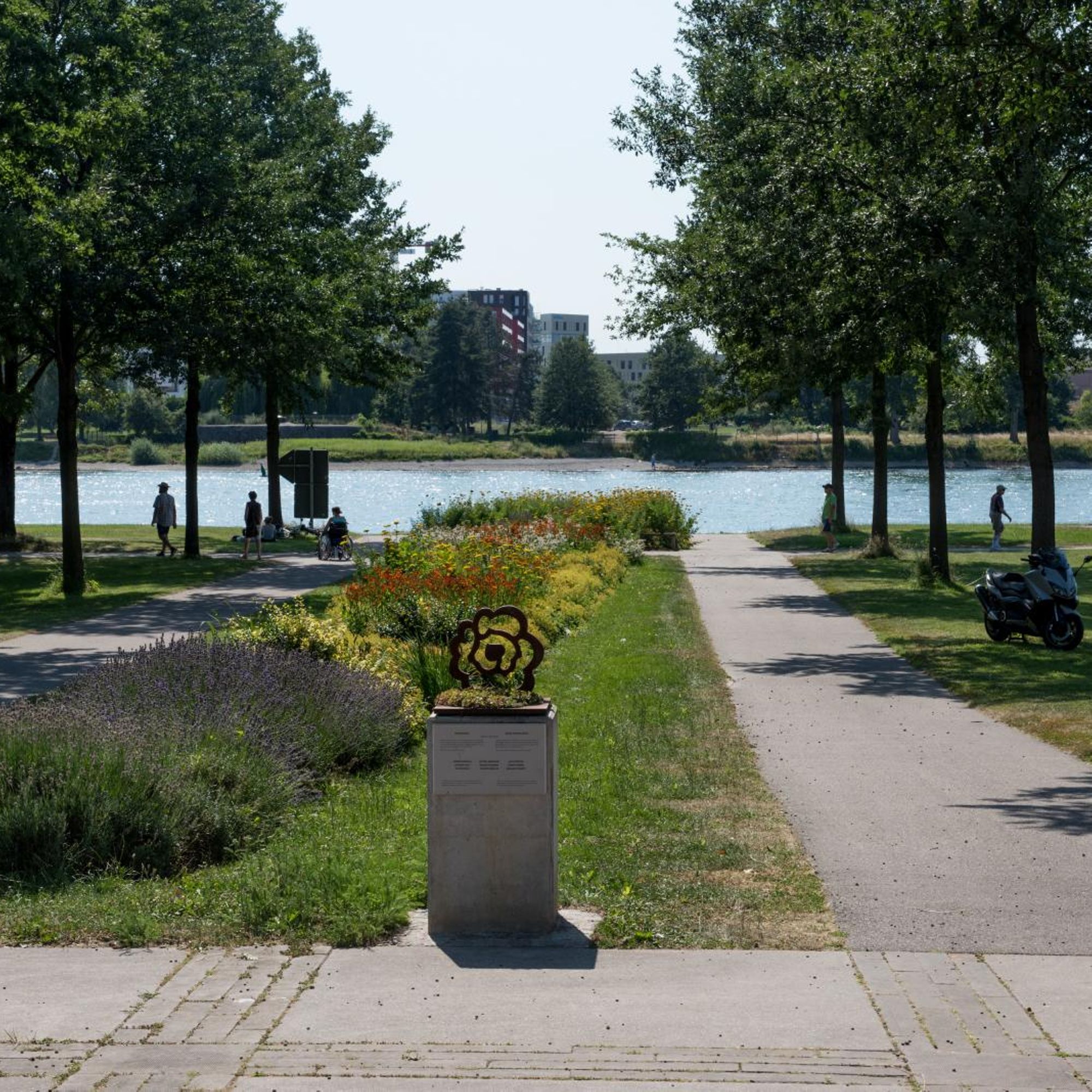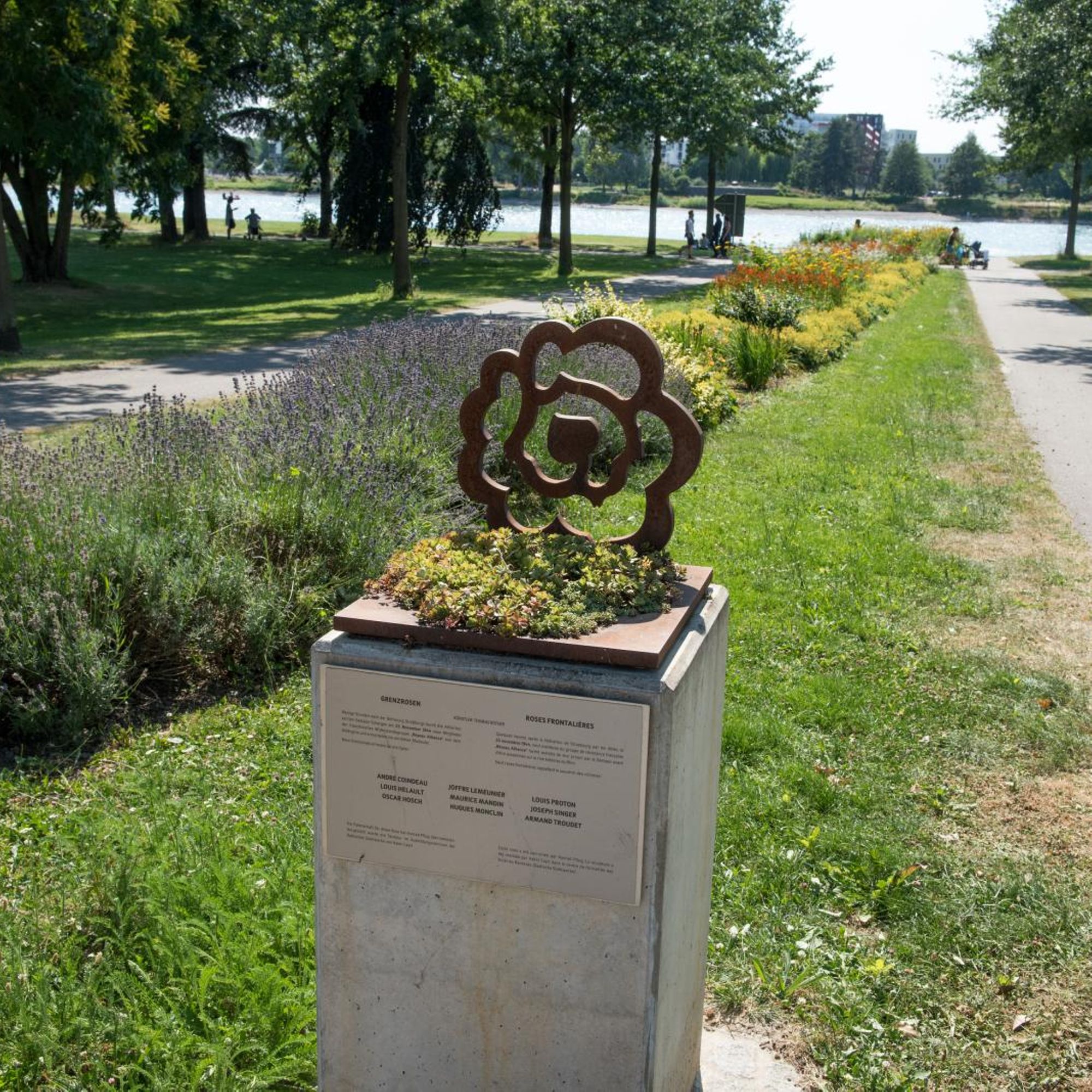 - Dans le Jardin des Deux Rives, à l’entrée de la passerelle