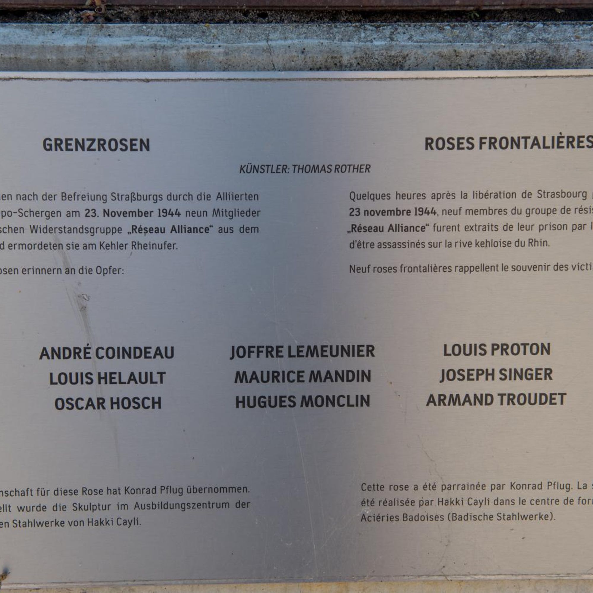 In Kehl wurden zwischen Juni 2013 und November 2014 insgesamt acht Rosen installiert, eine neunte erhielt die Nachbarstadt Straßburg in Frankreich. Verbunden damit ist die Erinnerung an die Ermordung von neun französischen Widerstandskämpfern des Réseau Alliance durch die Gestapo am 23. November 1944.