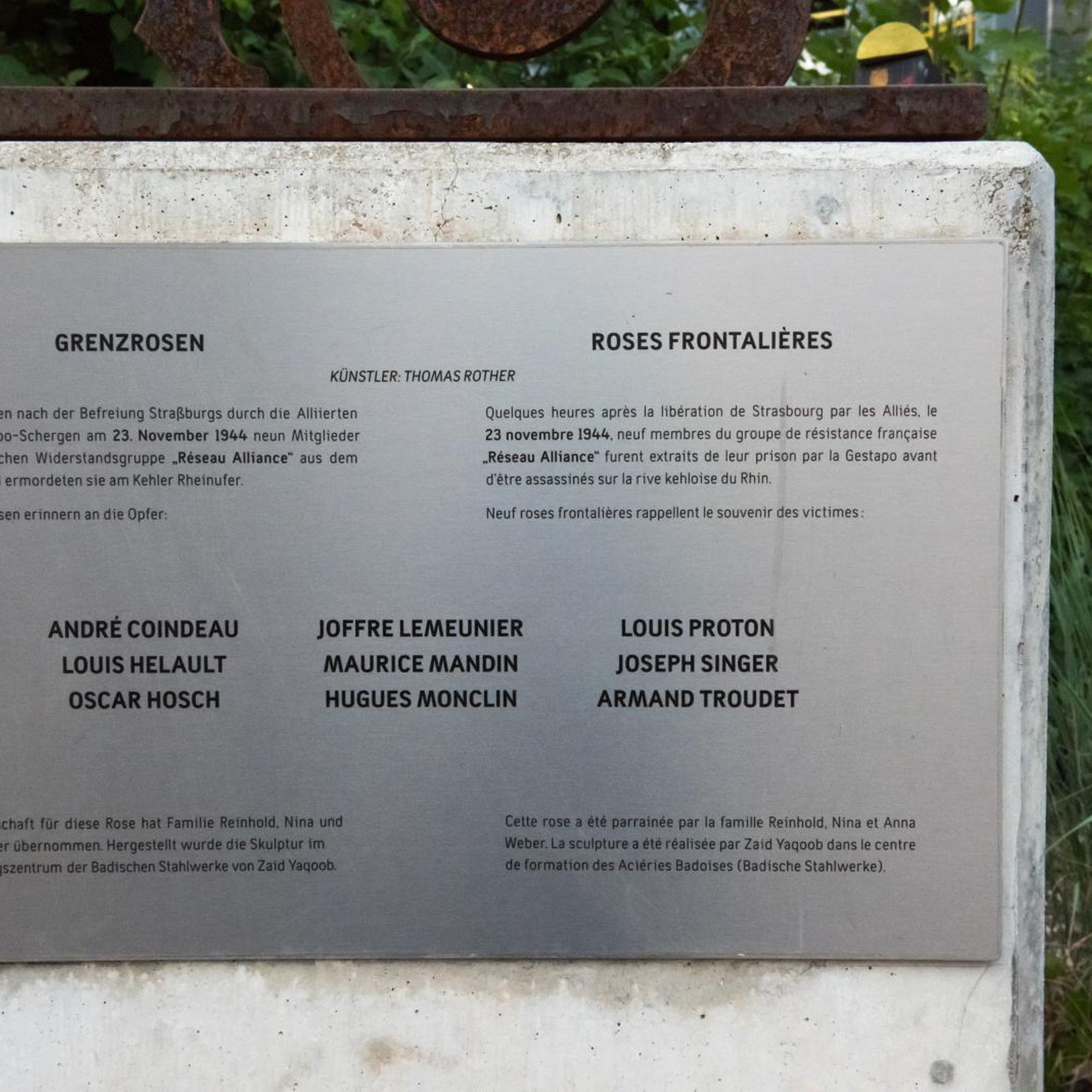 In Kehl wurden zwischen Juni 2013 und November 2014 insgesamt acht Rosen installiert, eine neunte erhielt die Nachbarstadt Straßburg in Frankreich. Verbunden damit ist die Erinnerung an die Ermordung von neun französischen Widerstandskämpfern des Réseau Alliance durch die Gestapo am 23. November 1944.