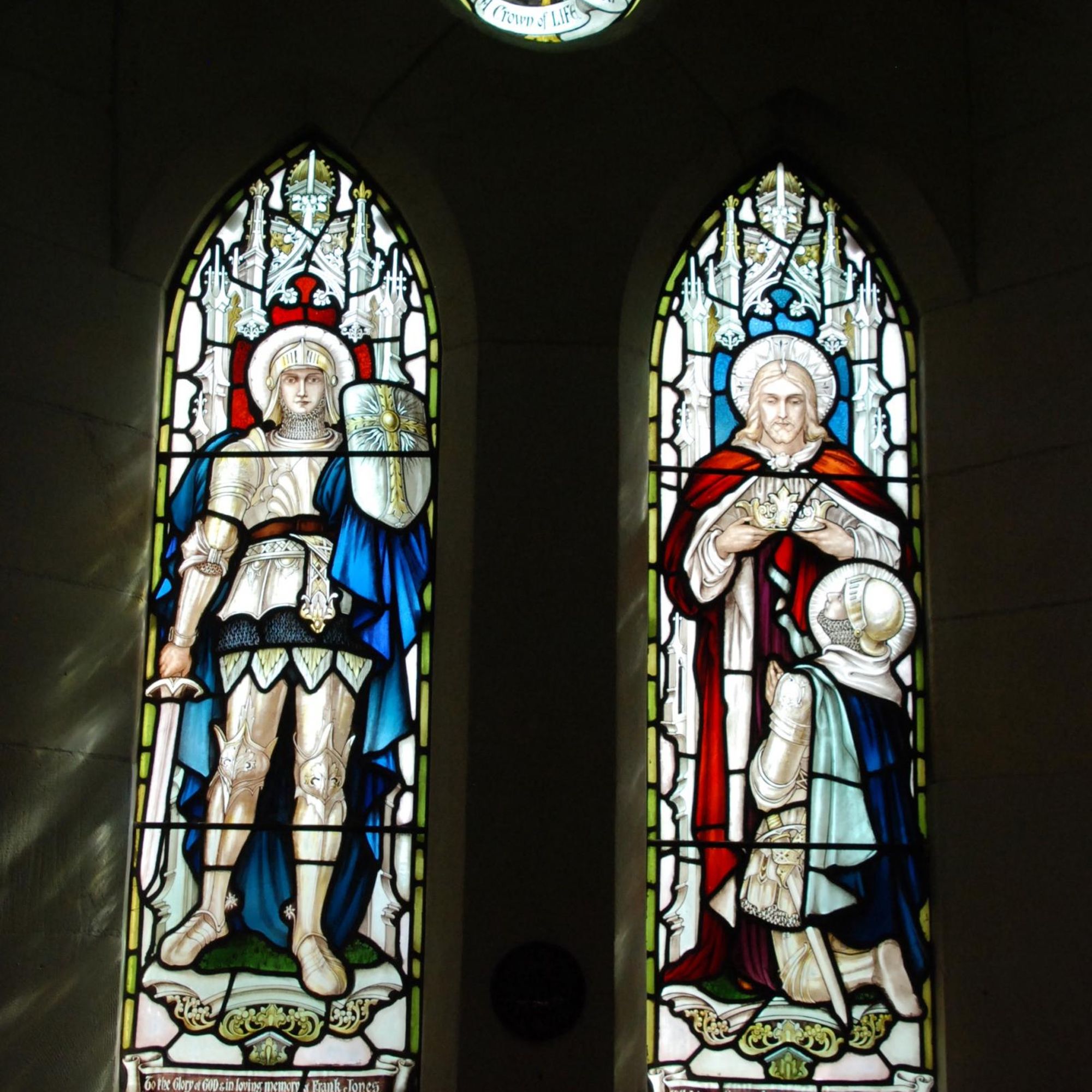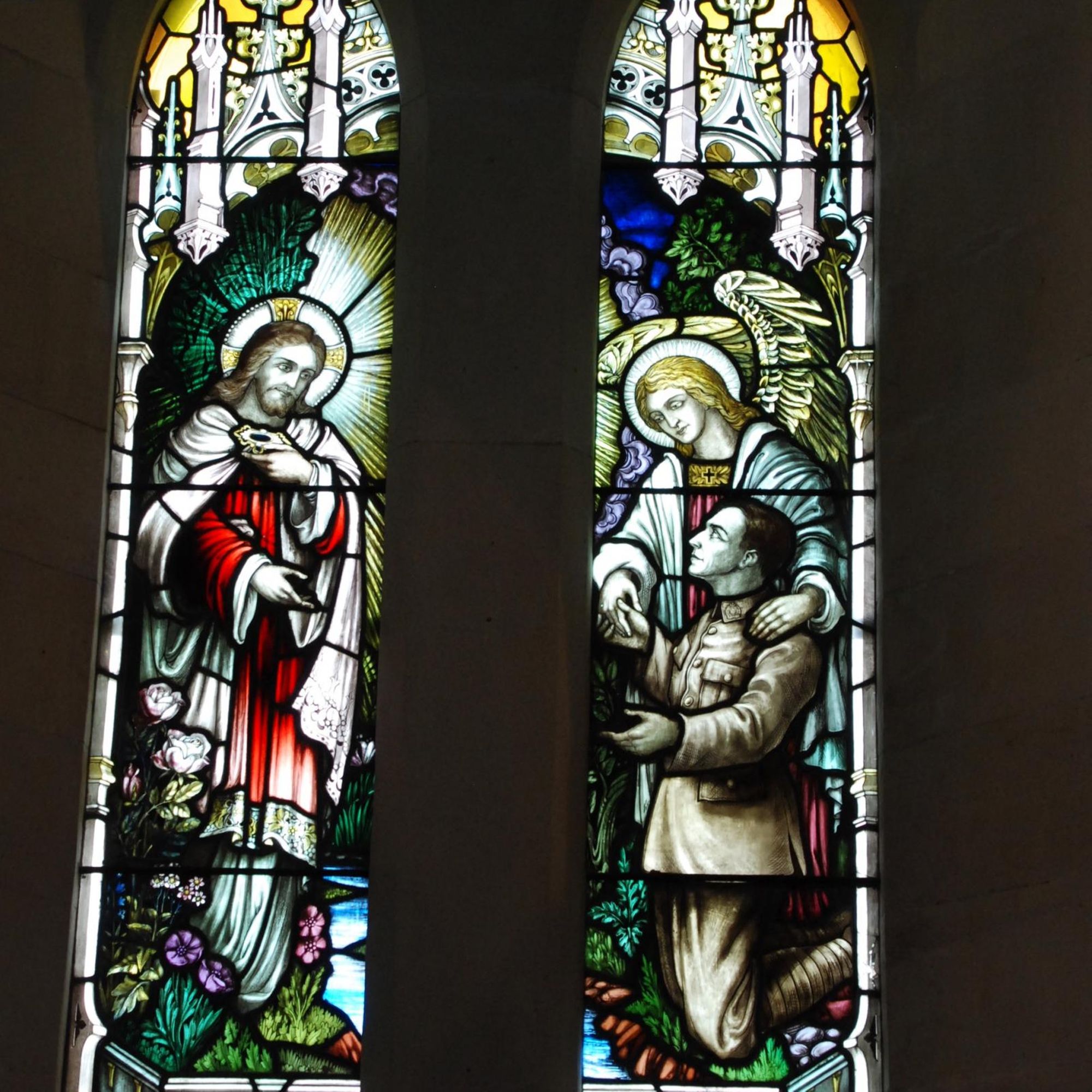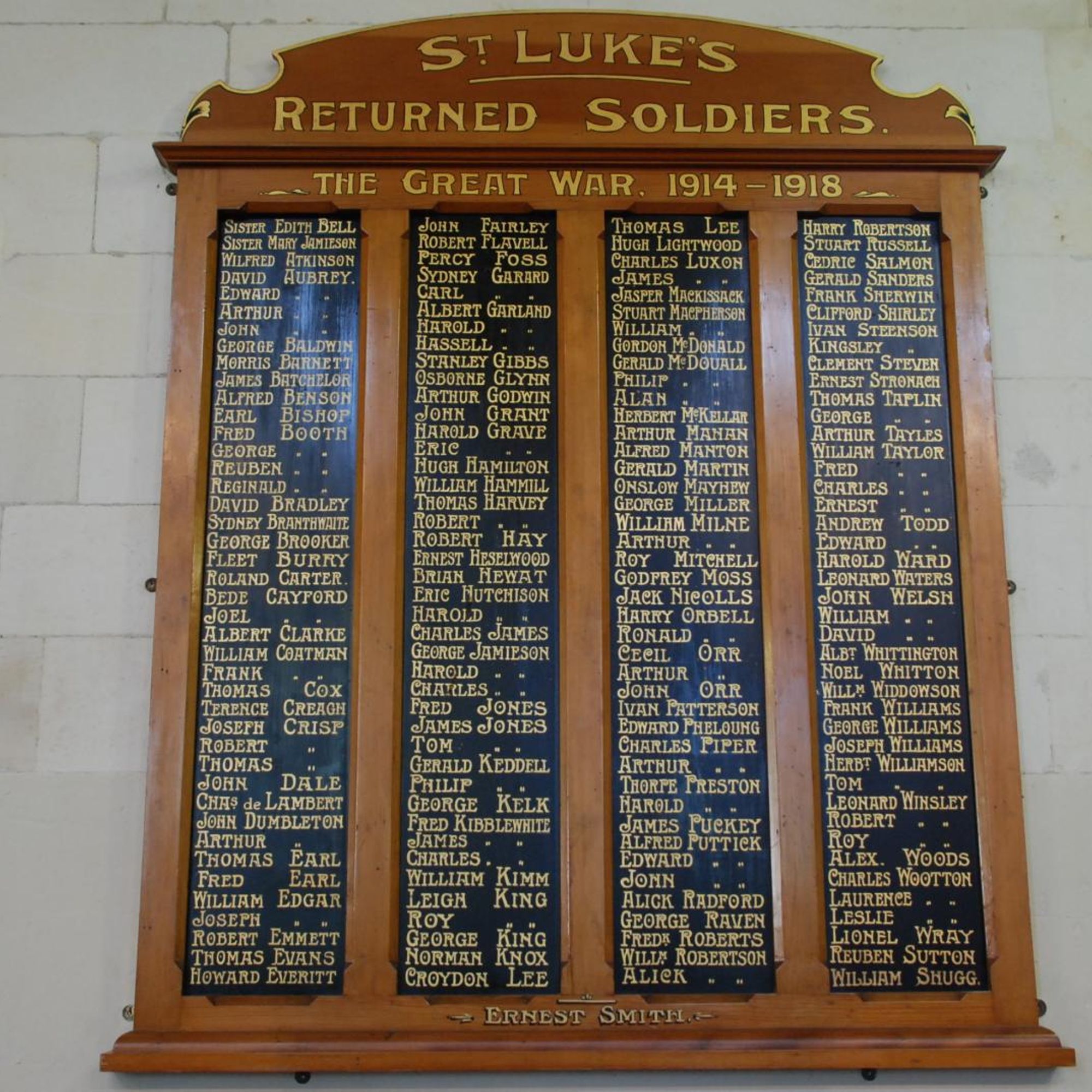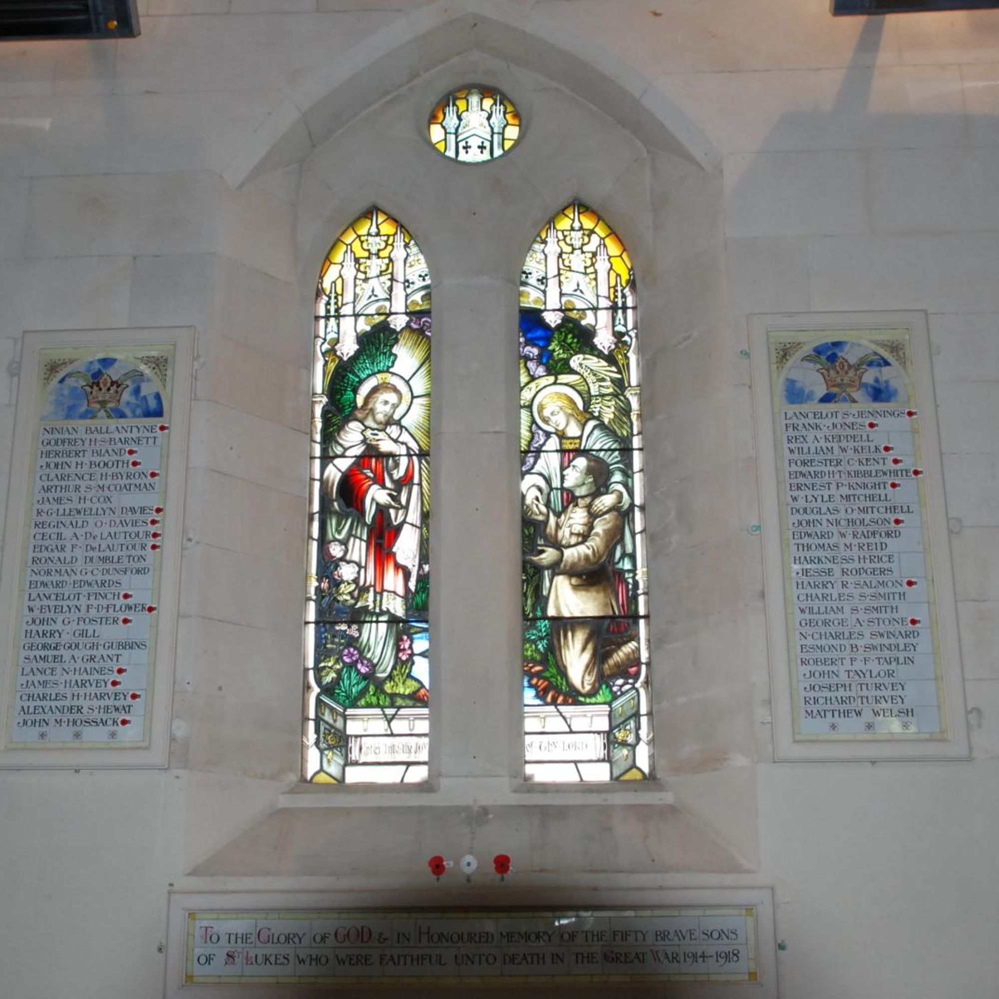 First World War memorial at St Luke's Anglican Church in Ōamaru. The memorial comprises a stained glass window depicting the images of a soldier, St Luke and Jesus; and three panels made from glazed tiles in cast iron and timber frames. Two record the names of congregation members who lost their lives serving overseas.