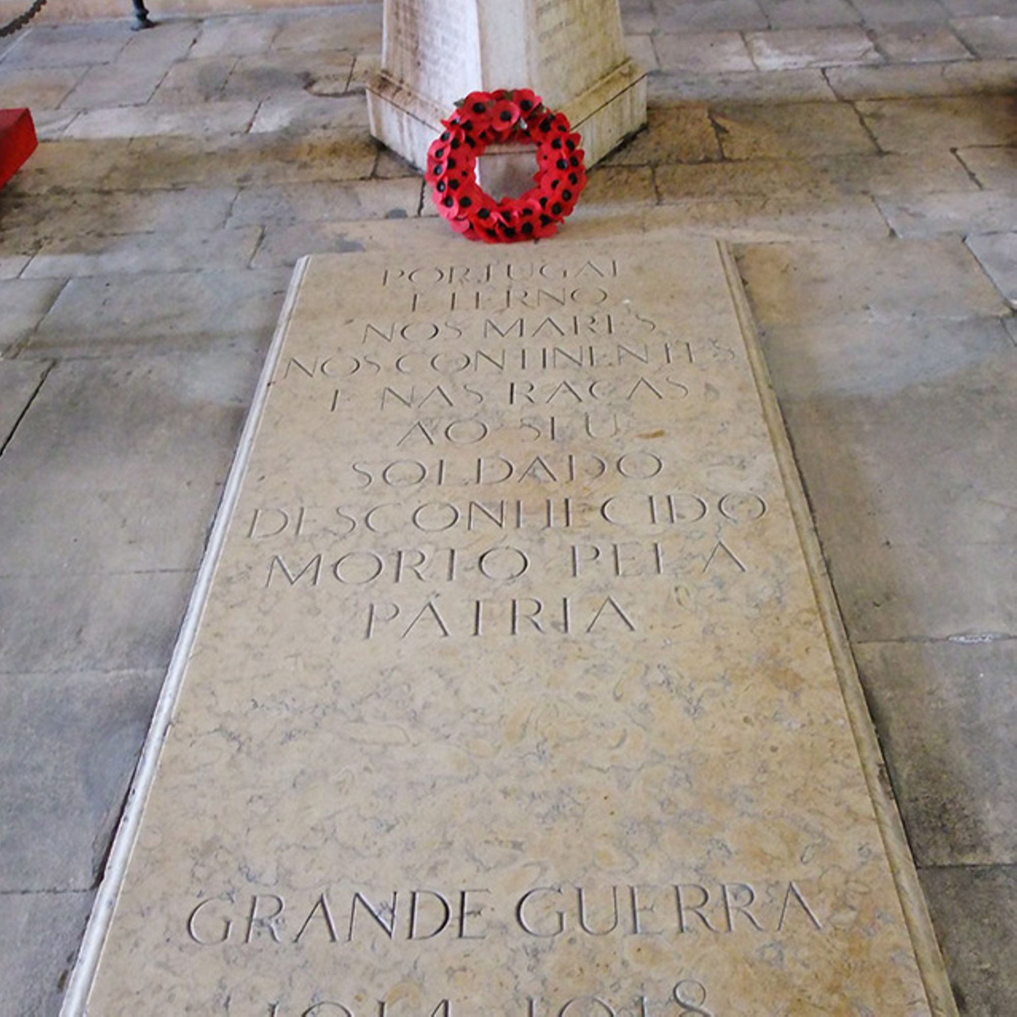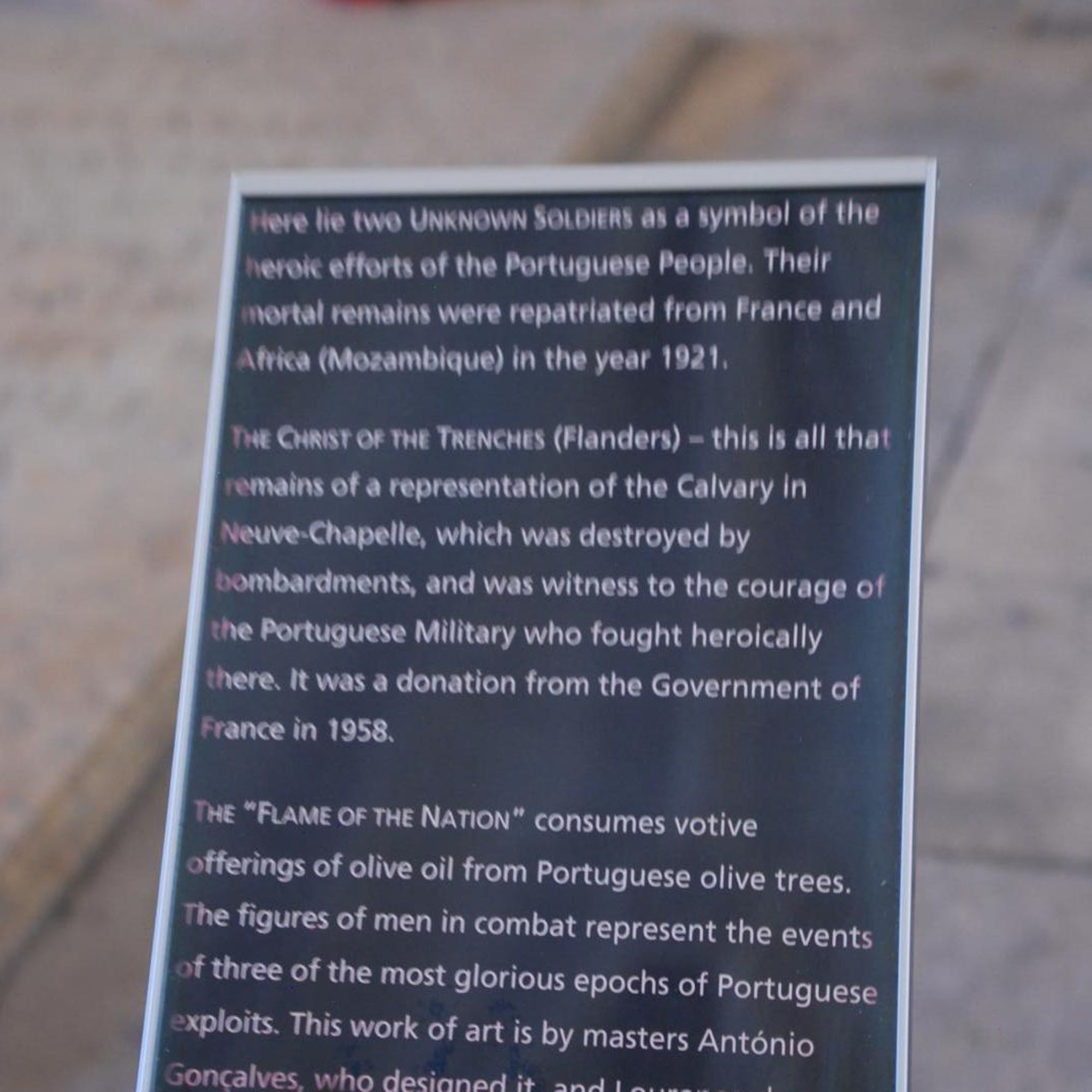 Le tombeau du soldat inconnu possède deux symboles forts, souvenirs de l'effort de guerre portugais :- - le Christ des Tranchées (c'est ce qu'il reste d'un calvaire de la ville de Neuve-Chapelle). Ce Christ, qui a survécu aux bombardements ennemis, est témoin de la bravoure des soldats portugais et fut donné par la France au Portugal en 1958.
