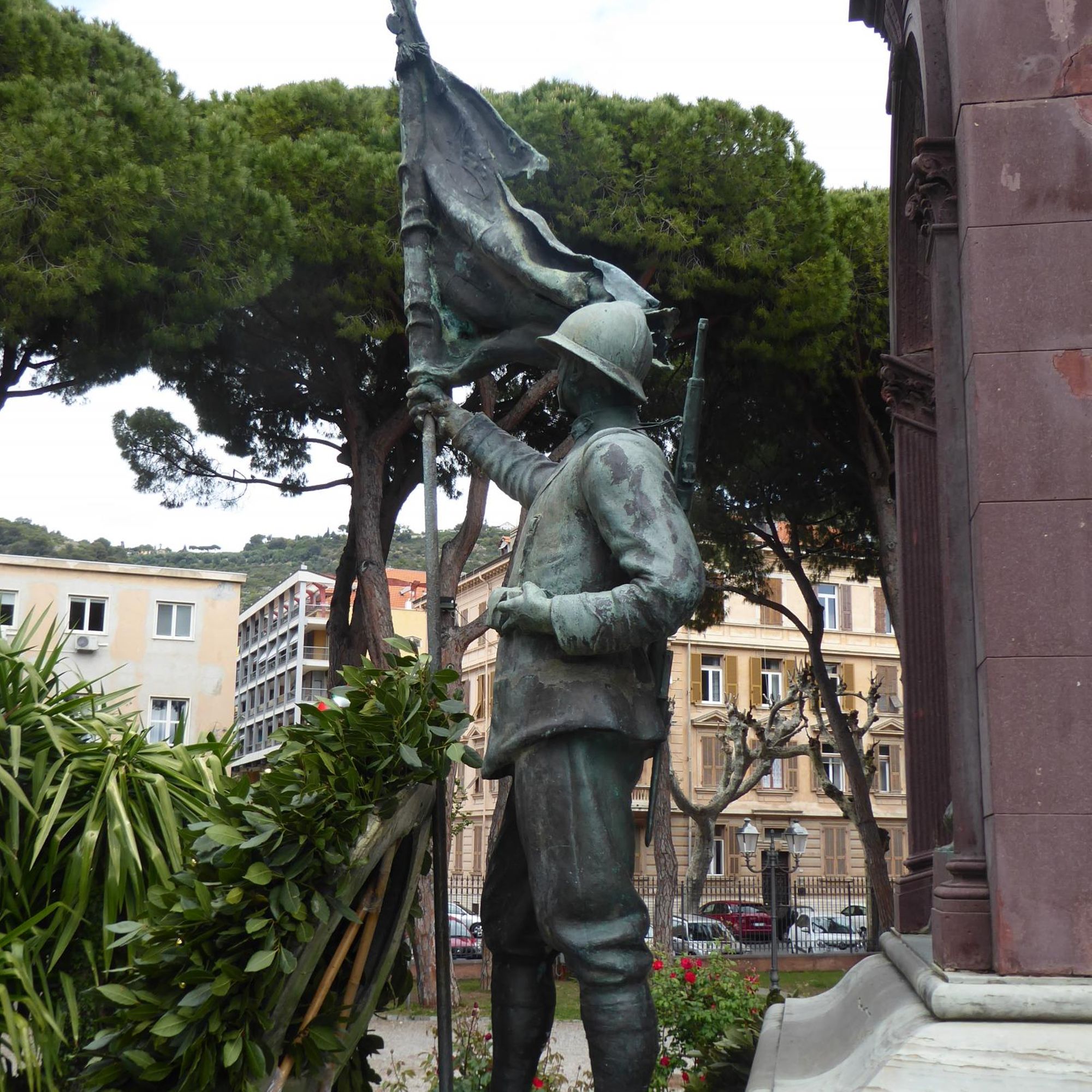 Devant le piédestal se dresse la statue en bronze d'un soldat casqué portant drapeau, fusil à l'épaule et aux pieds duquel gît un casque allemand.