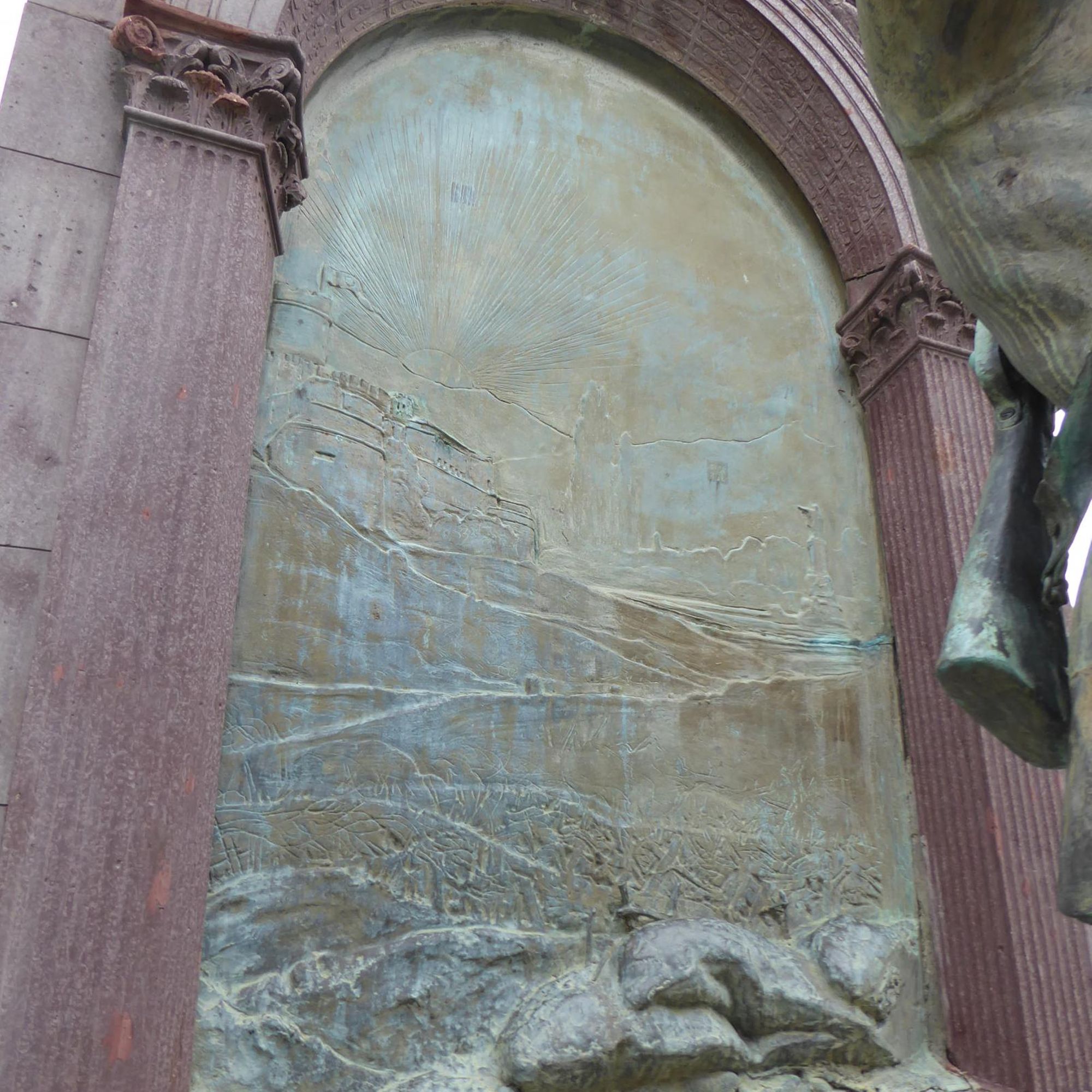Sur la face principale, derrière le soldat, l'arcature sculptée en porphyre encadre un grand bas-relief en bronze représentant un paysage montagneux, tranchées en premier plan, fort de défense accroché à la montagne sur fond de soleil rayonnant.