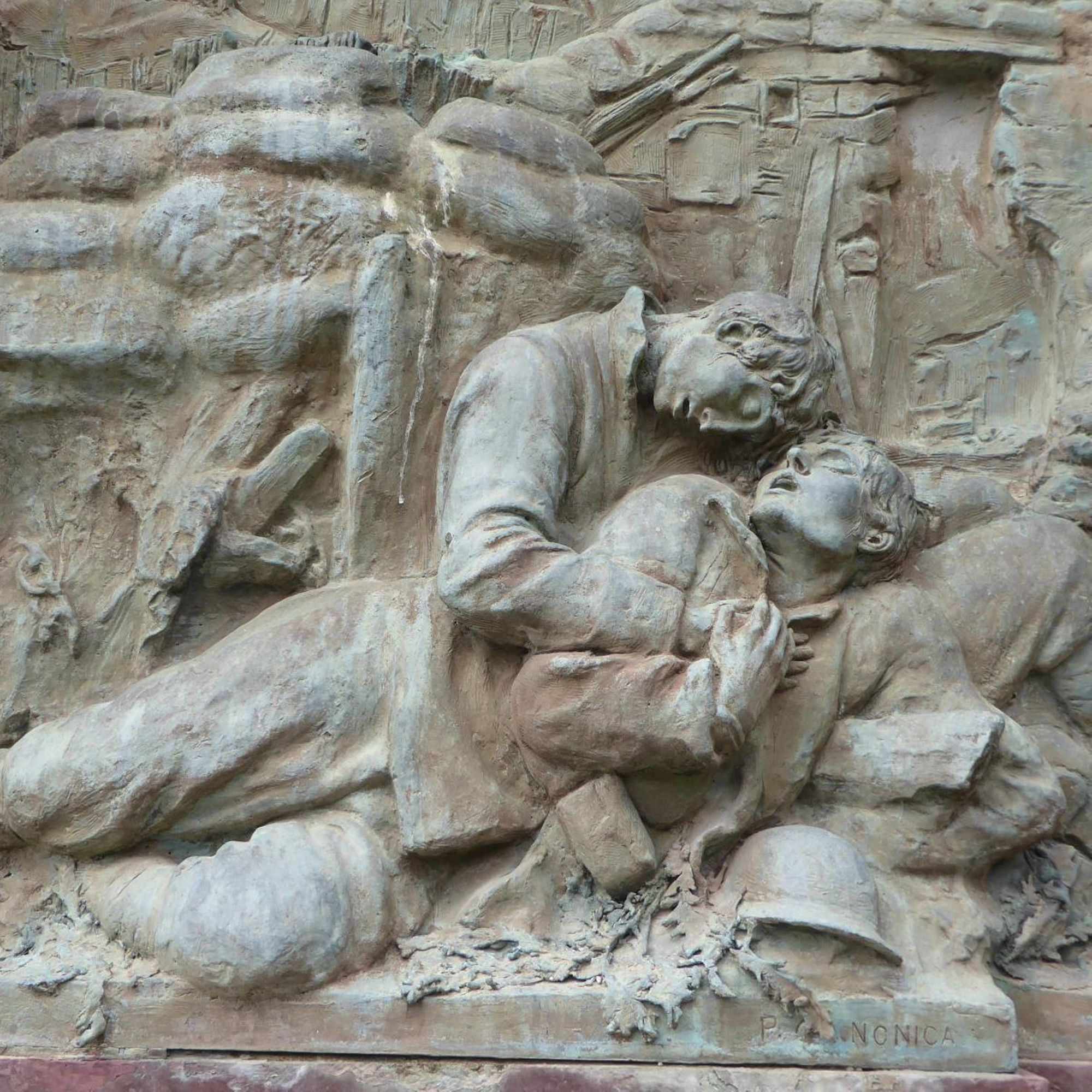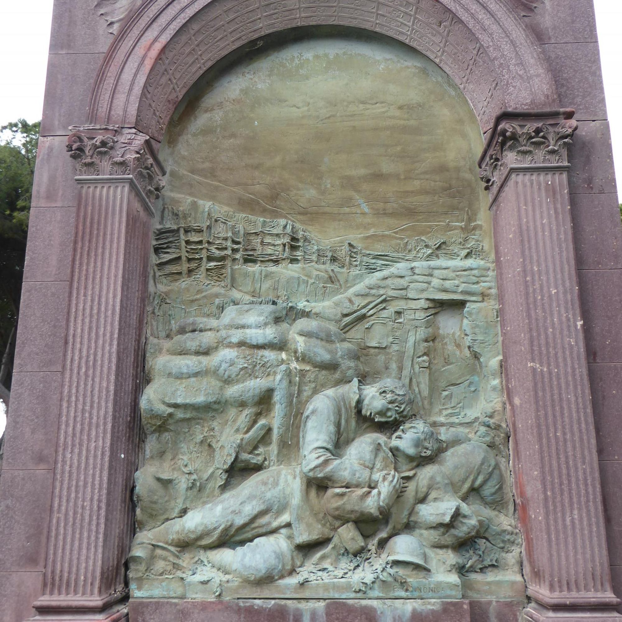 Sur la face arrière, l'arcature sculptée en porphyre encadre un grand bas-relief en bronze représentant , devant une casemate de tranchée, un soldat soutenant son camarade mourant.