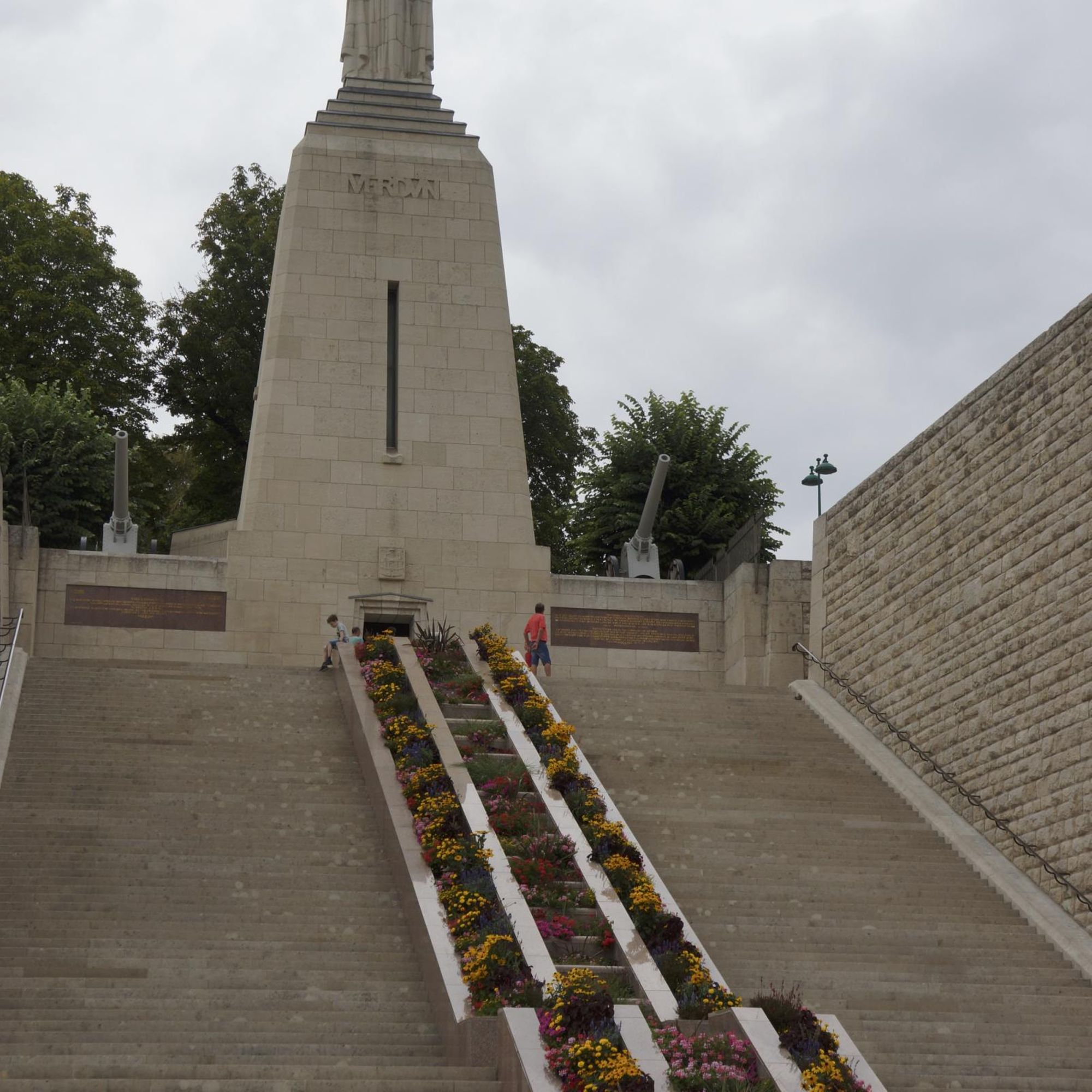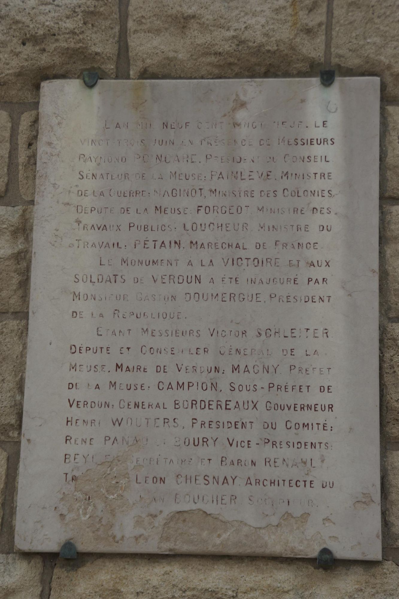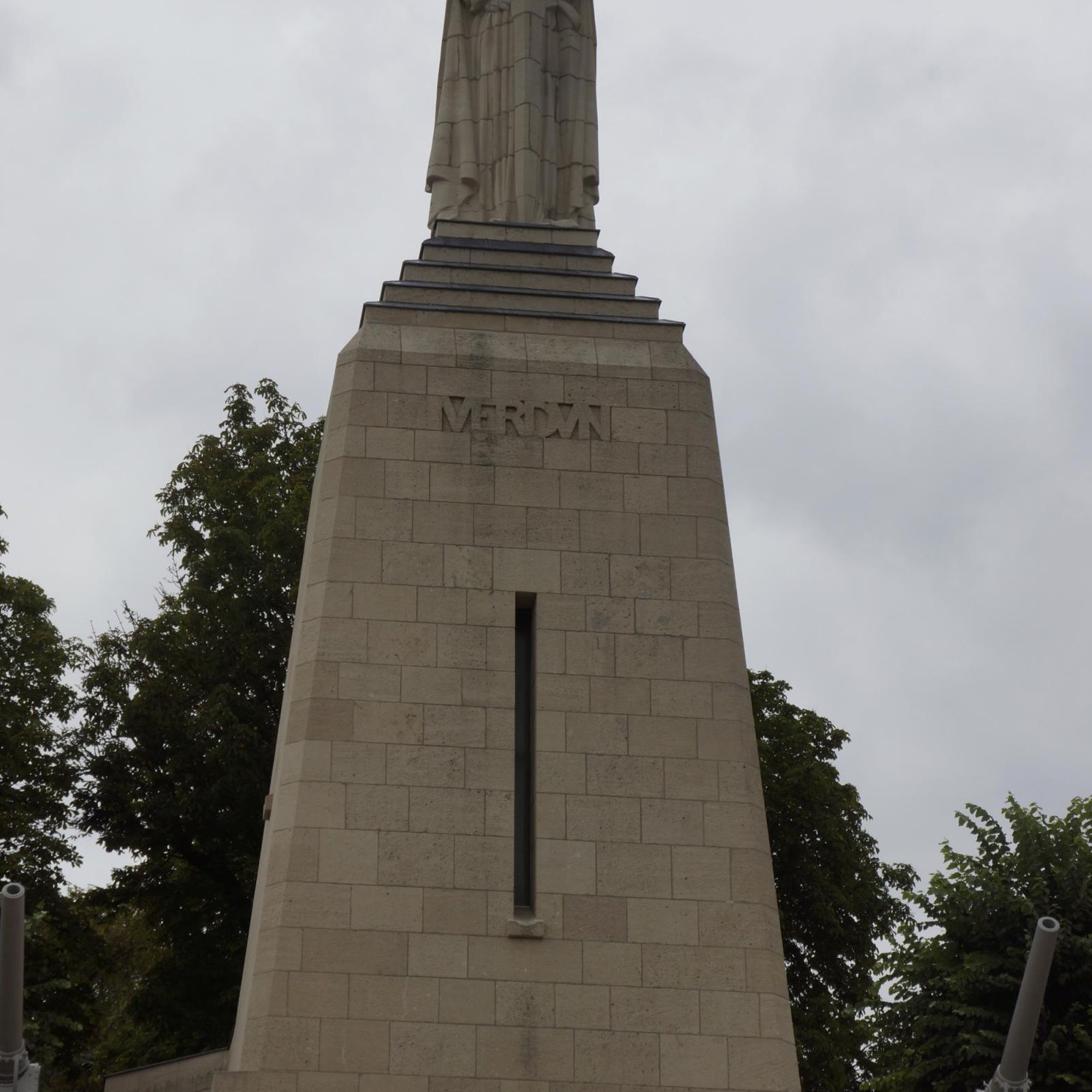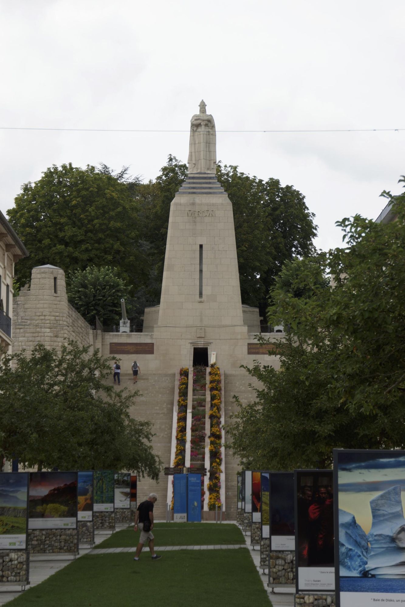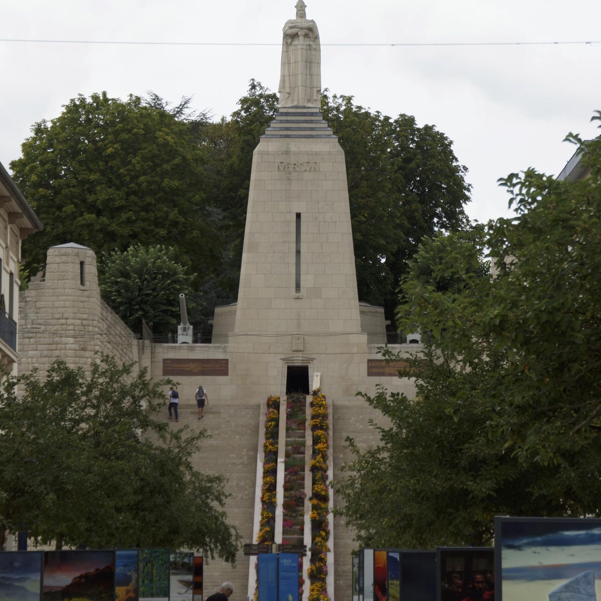 De part et d'autre du monument, deux canons russes de la Première Guerre mondiale pris aux Allemands. Aujourd'hui, l'escalier est scindé en son centre par une cascade symbolisant la vie renaissante. Elle rejoint le grand jet d'eau au bord de la Meuse en descendant l'avenue de la Victoire.