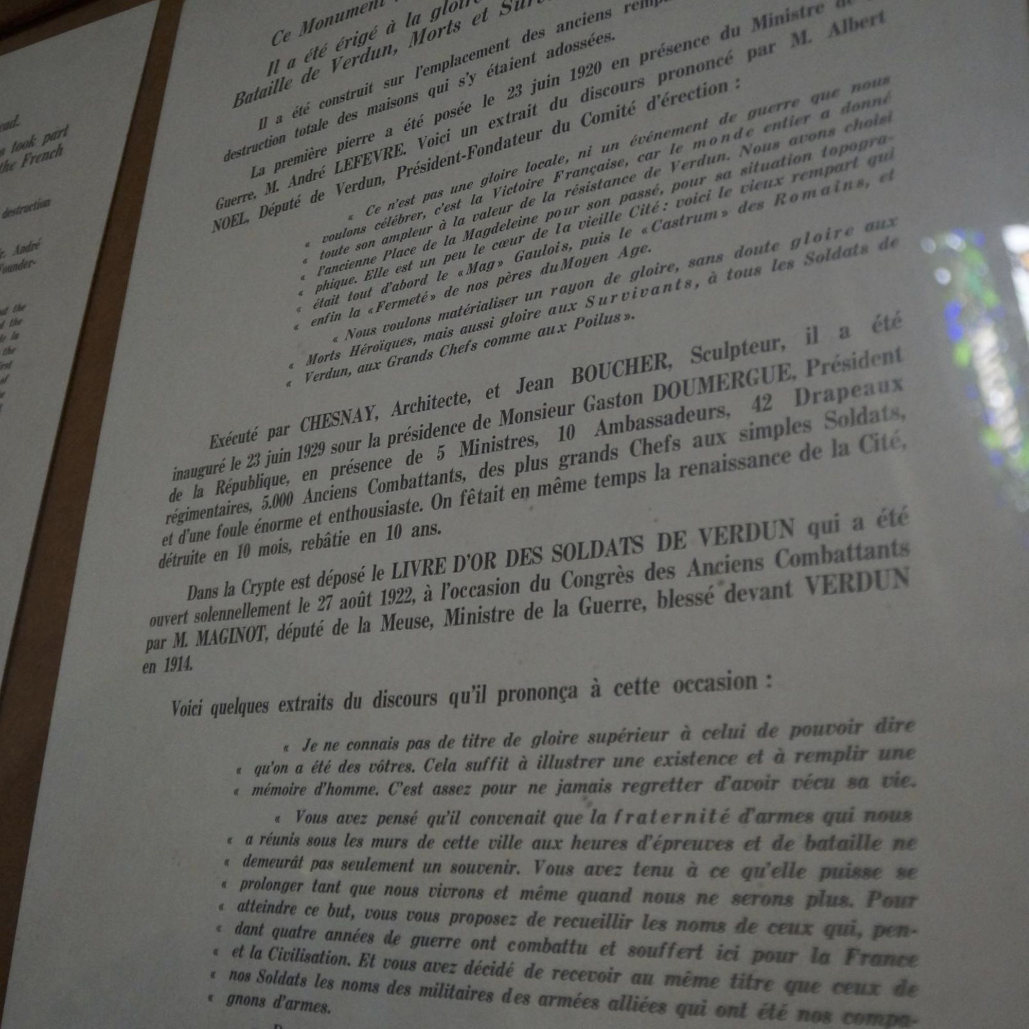 Malgré des travaux commencés seulement en 1926, l'édifice peut être inauguré le 23 juin 1929 lors des importantes cérémonies qui célèbrent la « renaissance » de Verdun après dix ans de reconstruction, en présence d'une foule considérable et des présidents de la République (Gaston Doumergue), du Conseil (Raymond Poincaré), des Assemblées, de différents ministres ainsi que du maréchal Pétain.