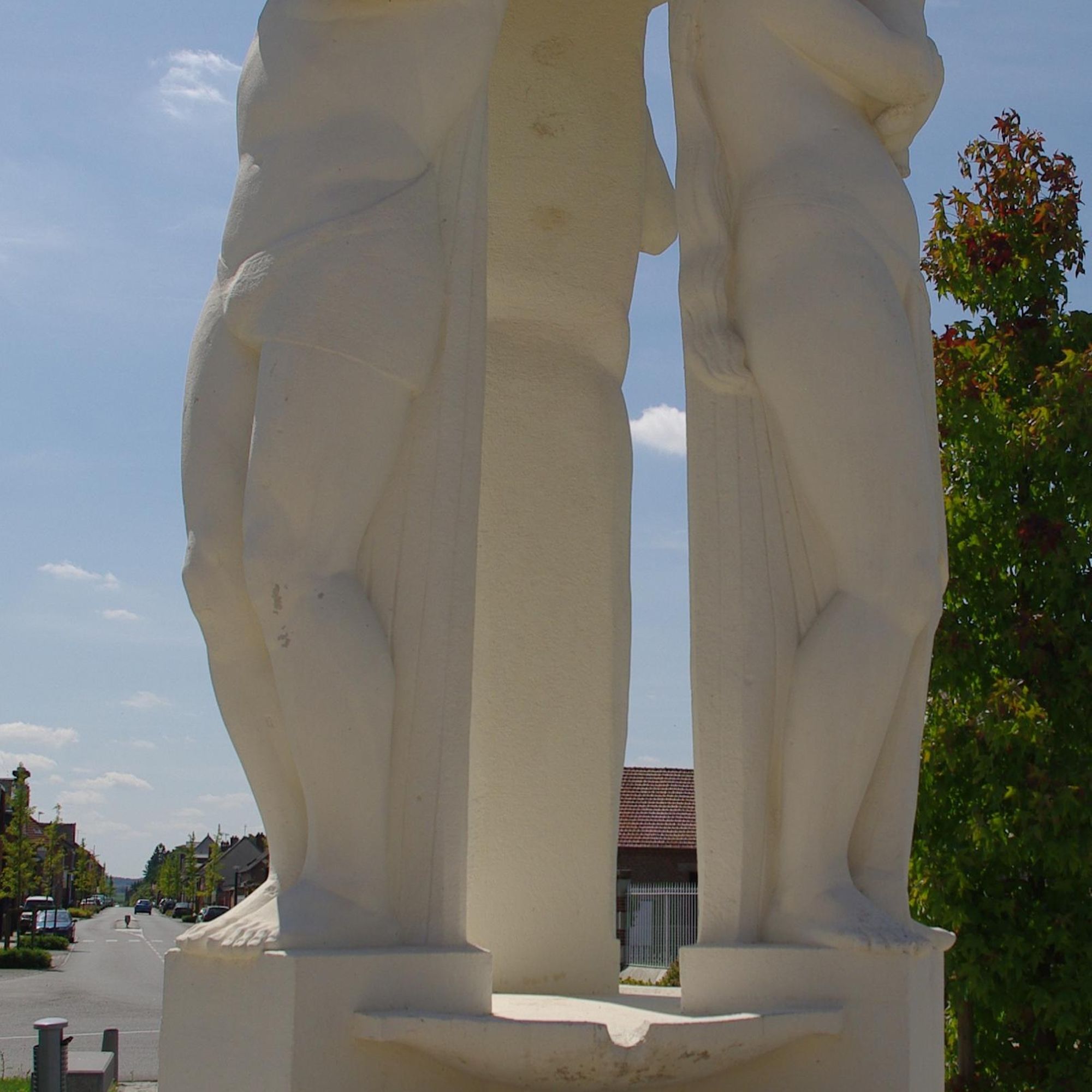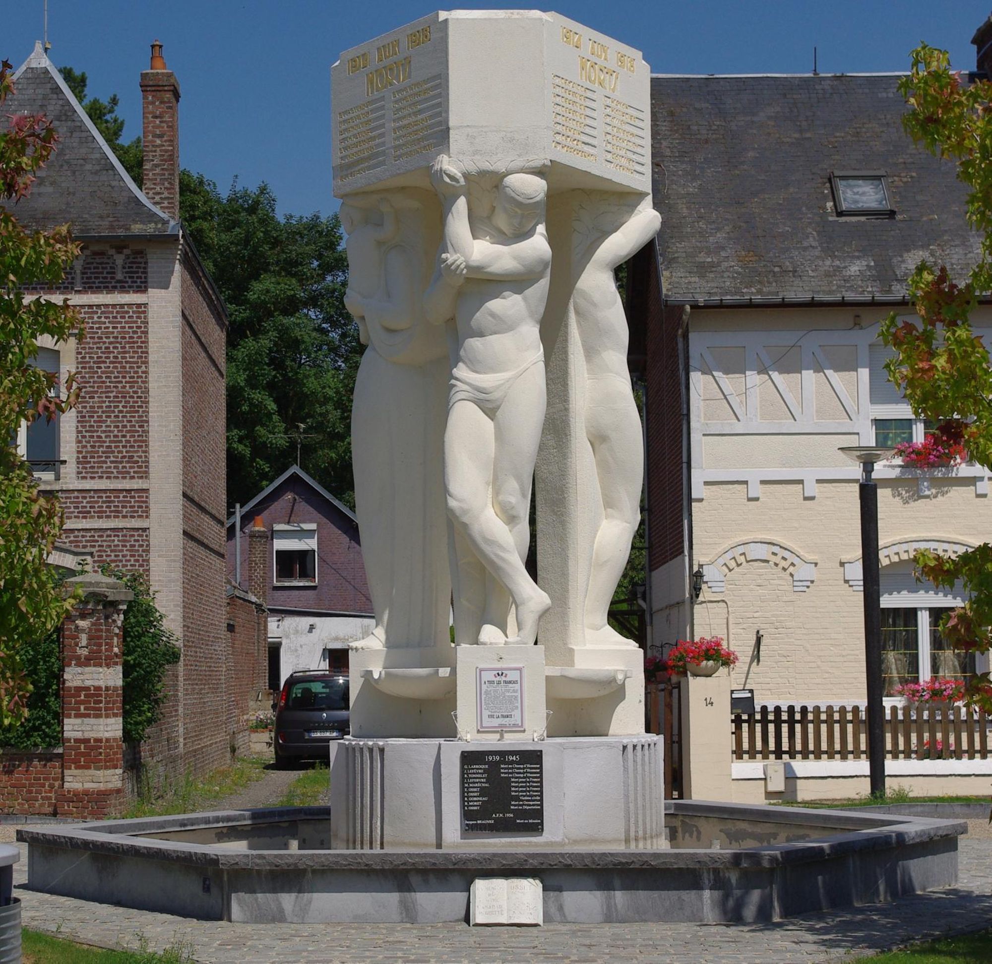 - Art déco : Trois personnes ou atlantes debout sur une vasque - une femme portant un enfant représentant peut-être la Patrie, et deux hommes symbolisant sans doute la Force et la Vie, allégories du Renouveau de la France - portent un bloc sommital où sont gravés les noms des disparus