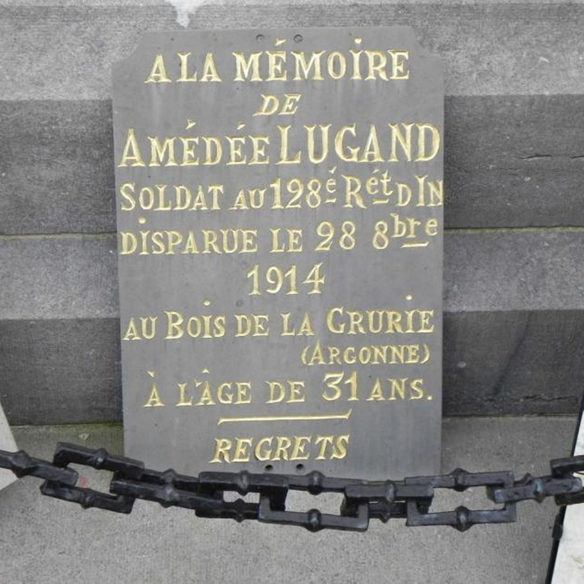 LUGAND Amédée [Plaque Soldat au 128e Régt. d'Inf. disparu le 28 8bre 1914 au Bois de la Grurie (Argonne) à l'âge de 31 ans]