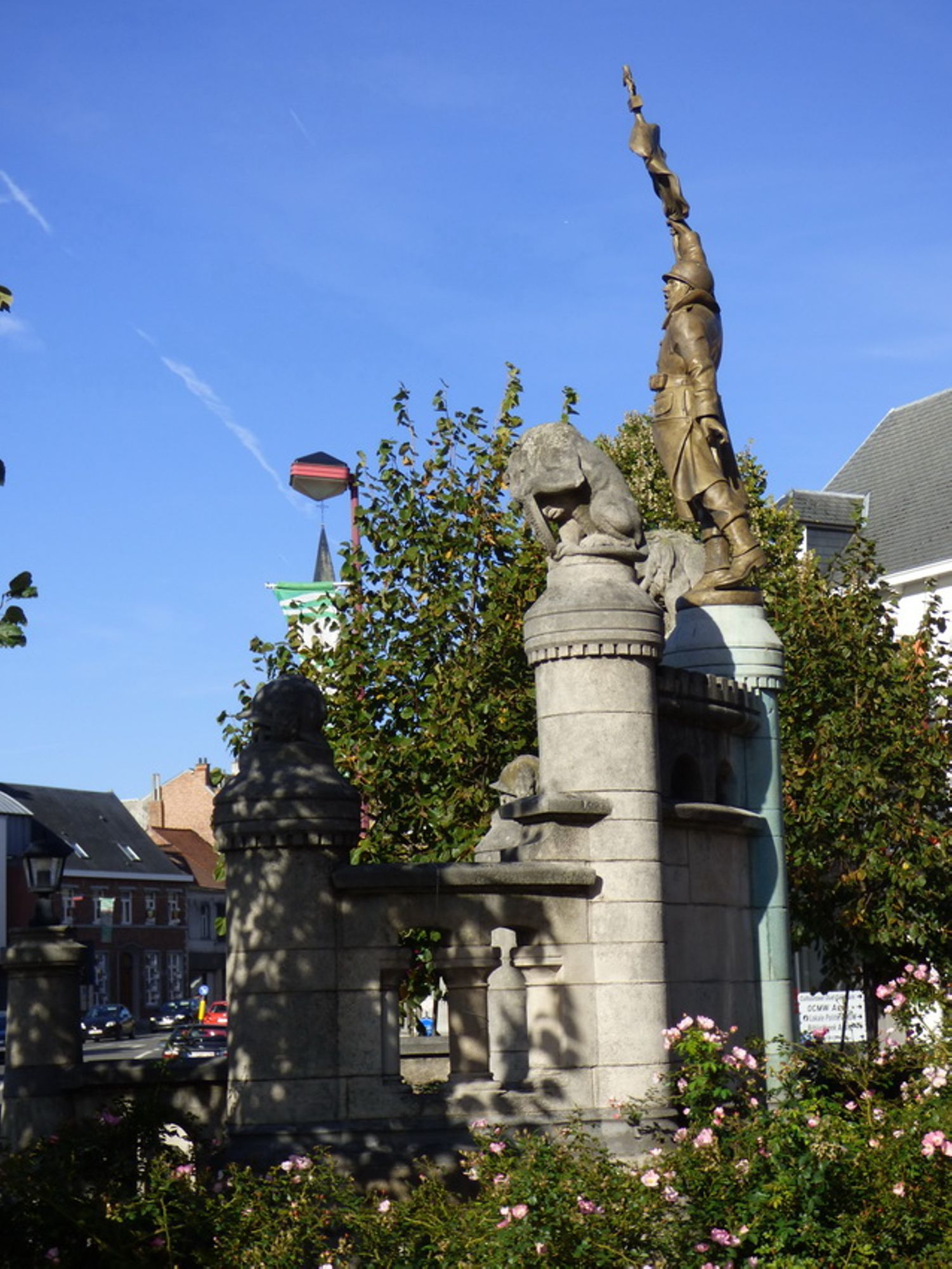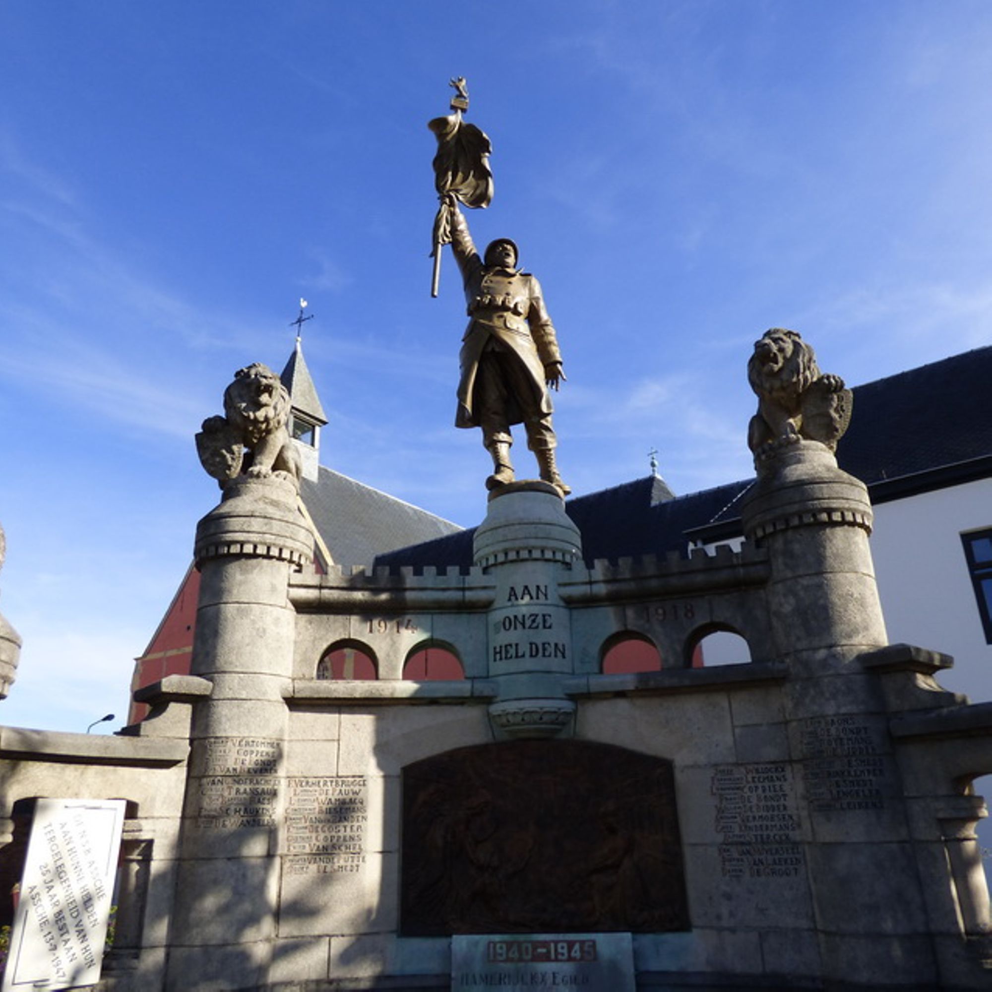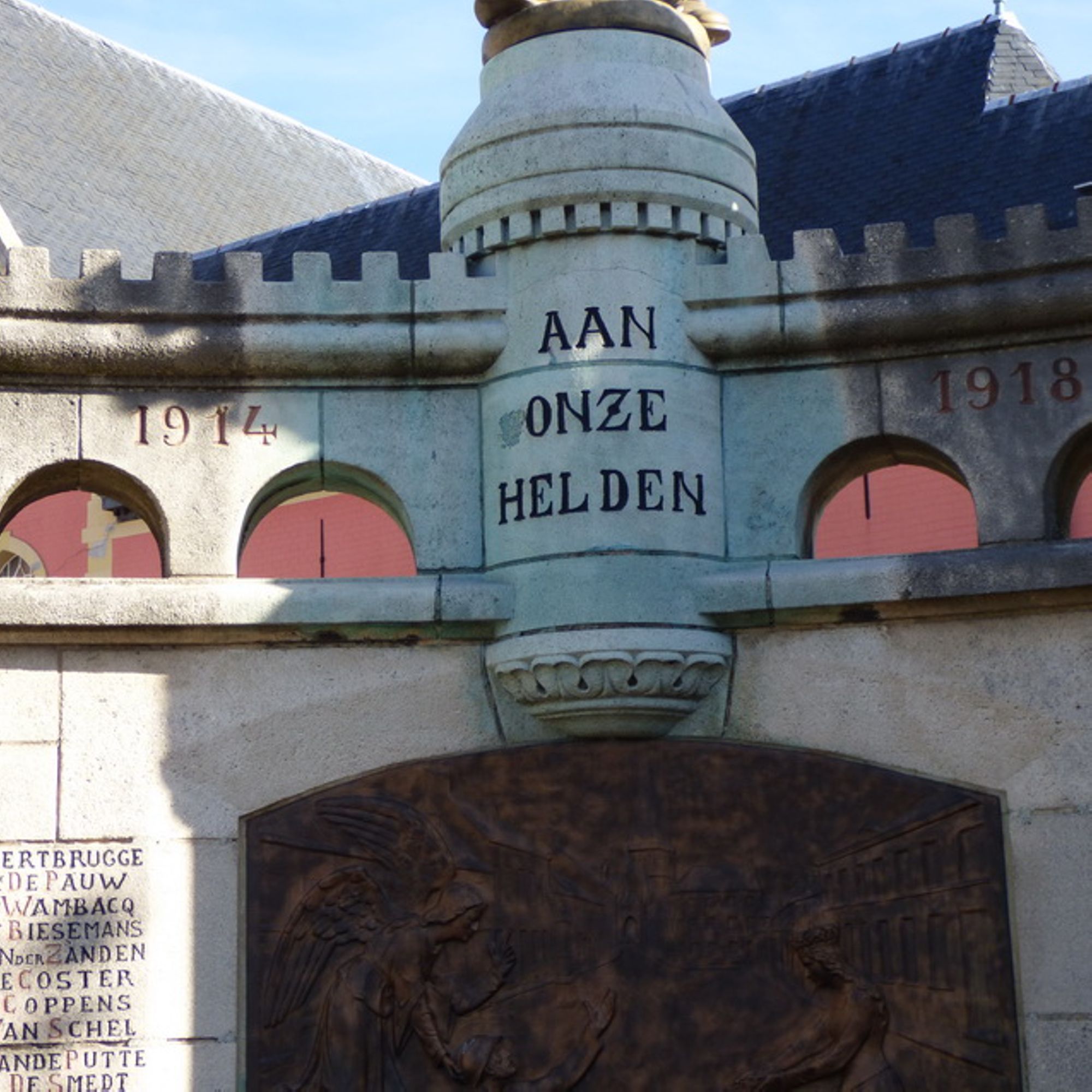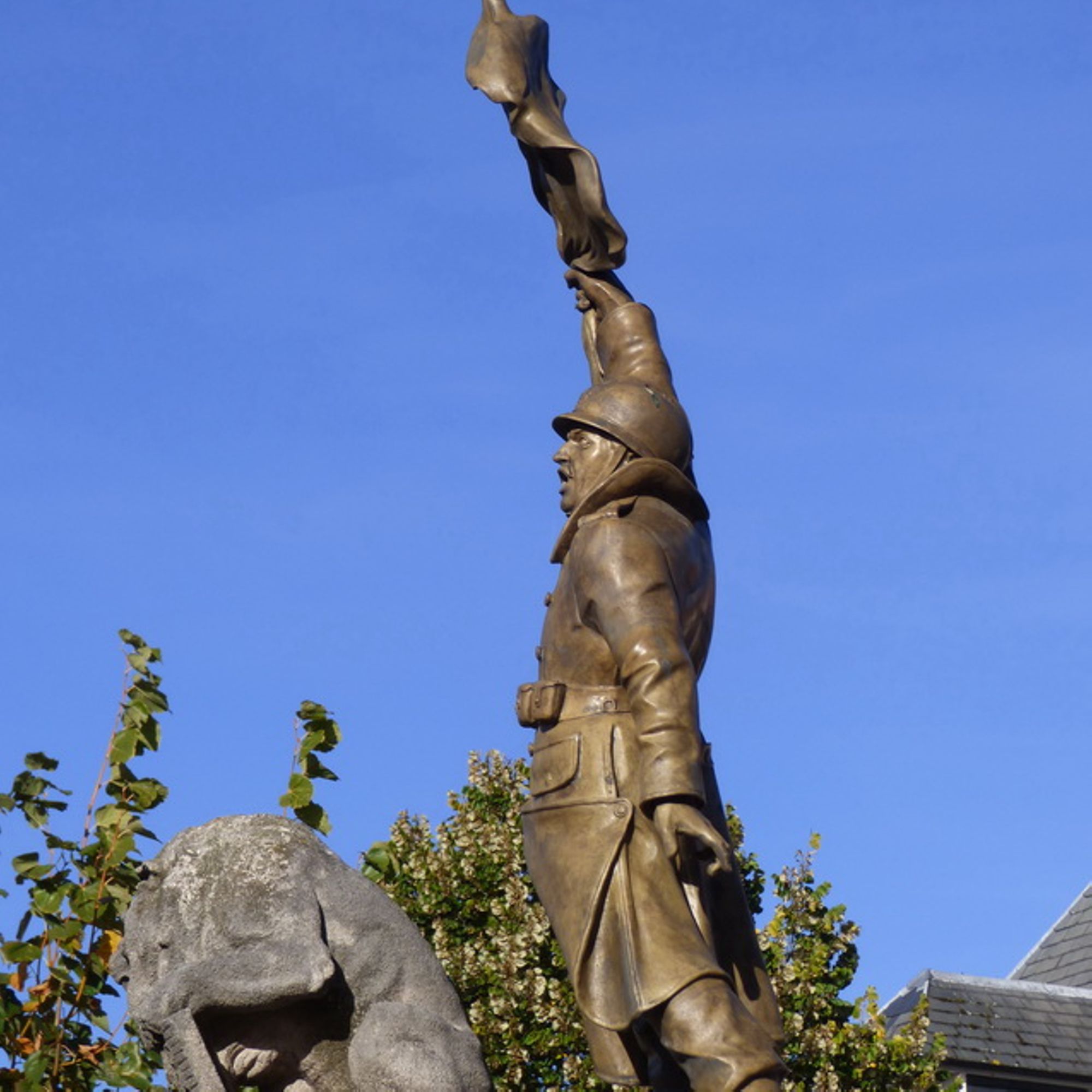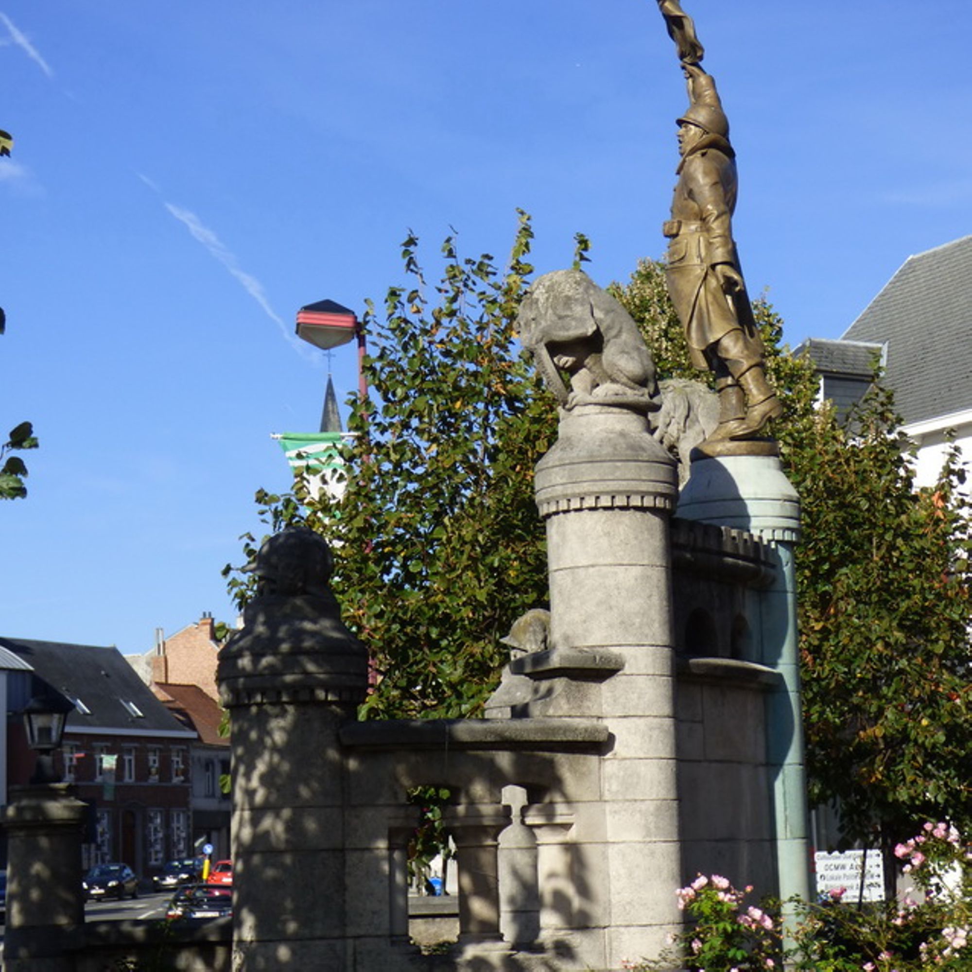 Monument en arc de cercle avec des colonnes, flanqué de deux lions et de casques, construit en pierre bleue avec un piédestal surmonté d'un soldat triomphant en bronze tenant un drapeau.