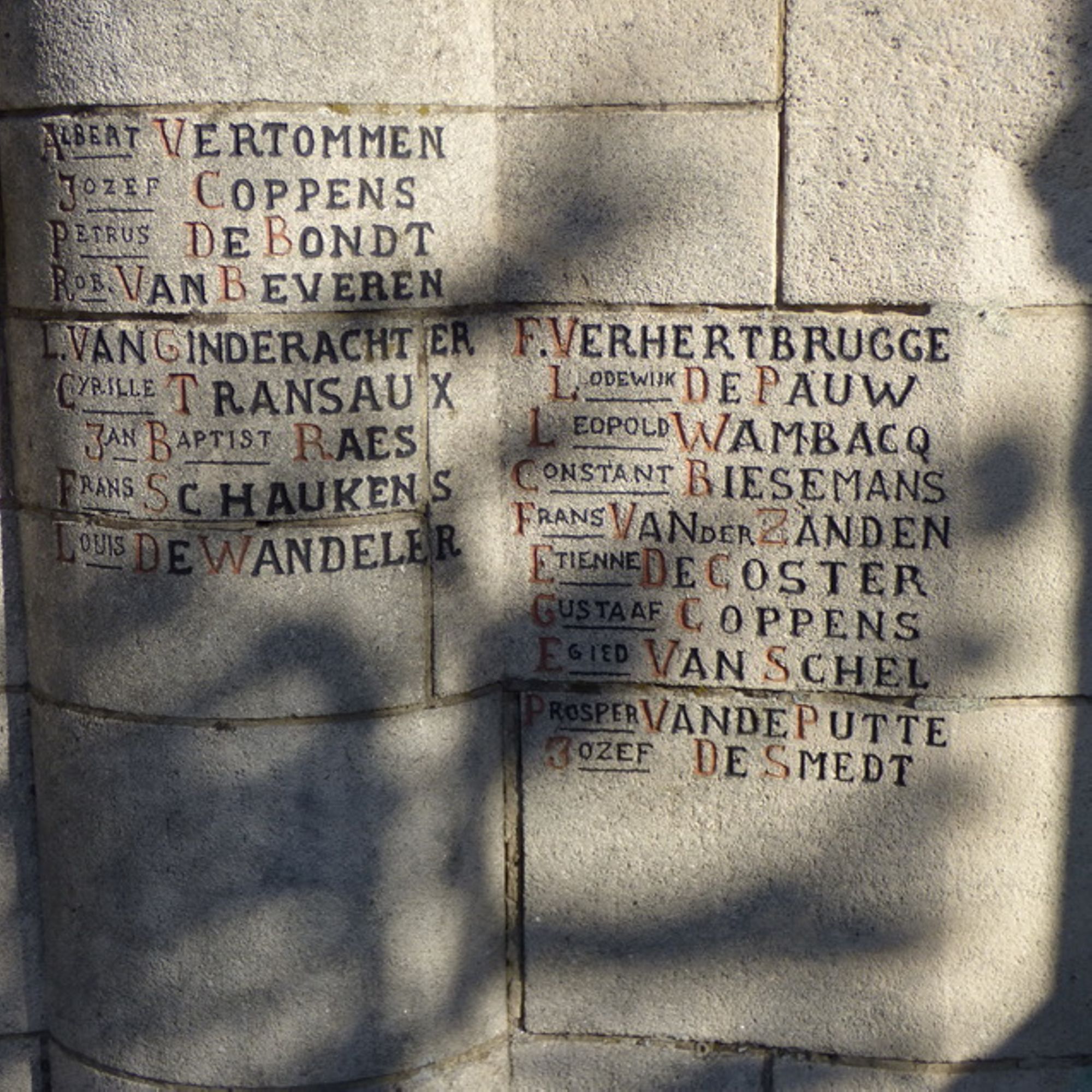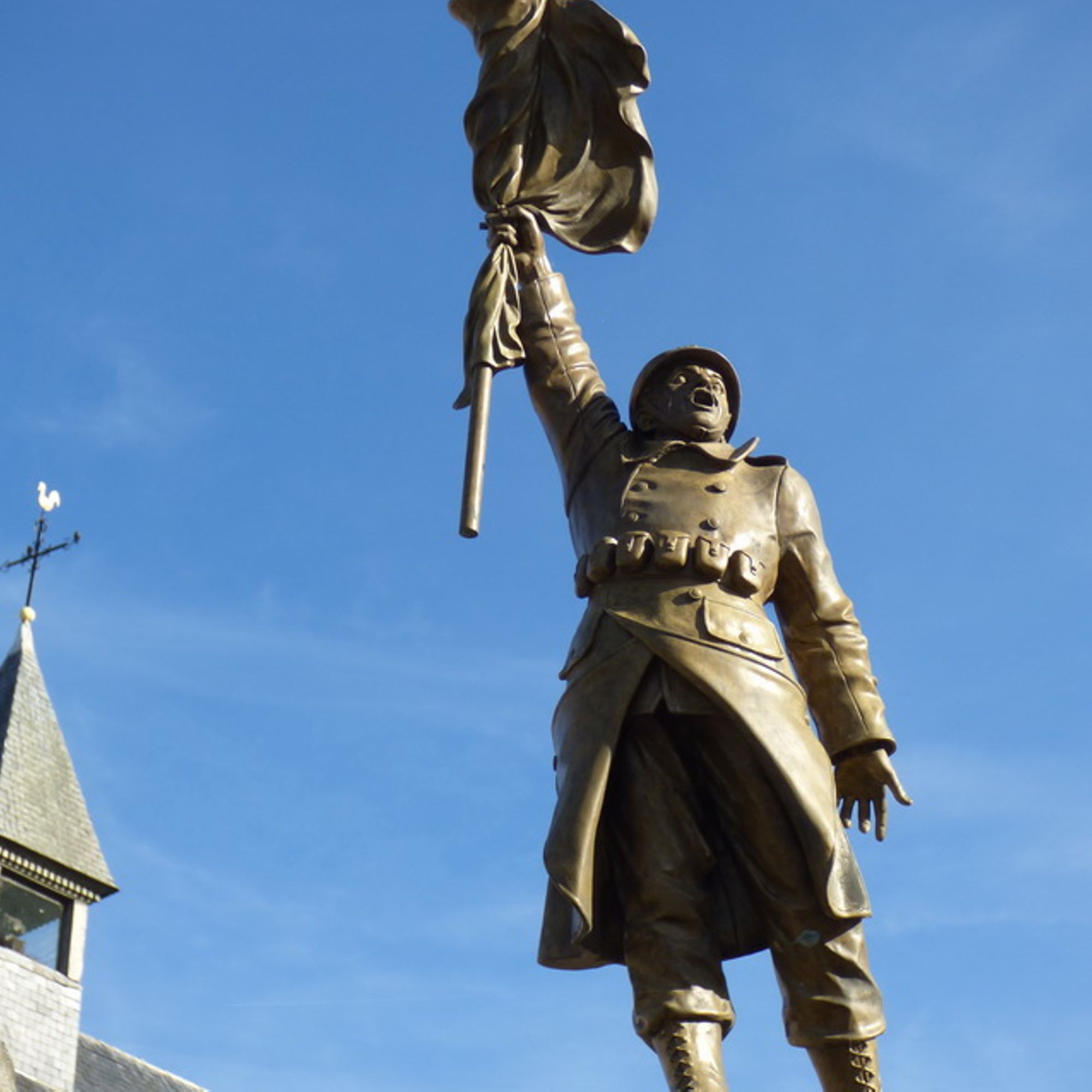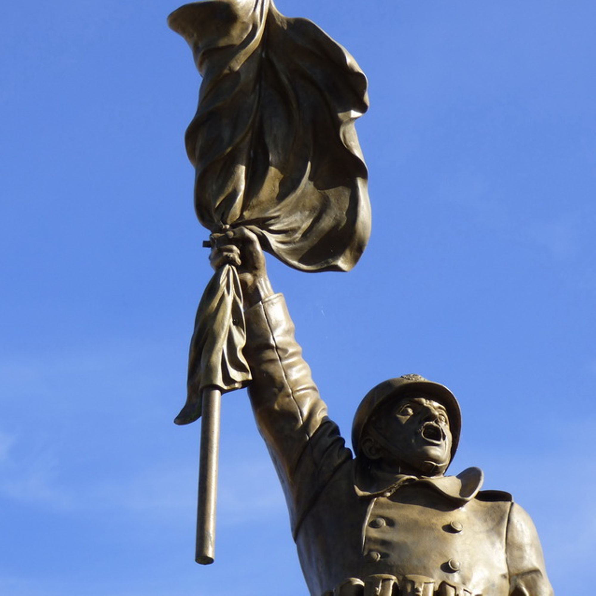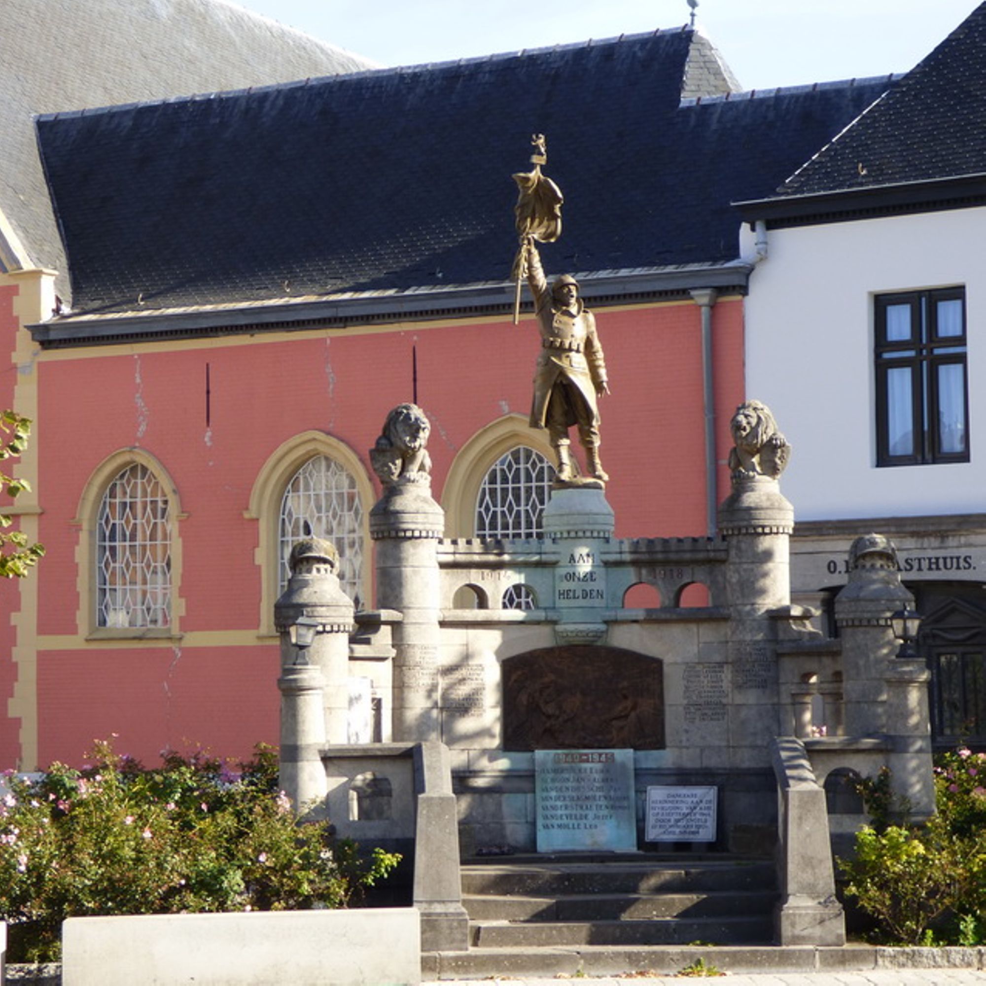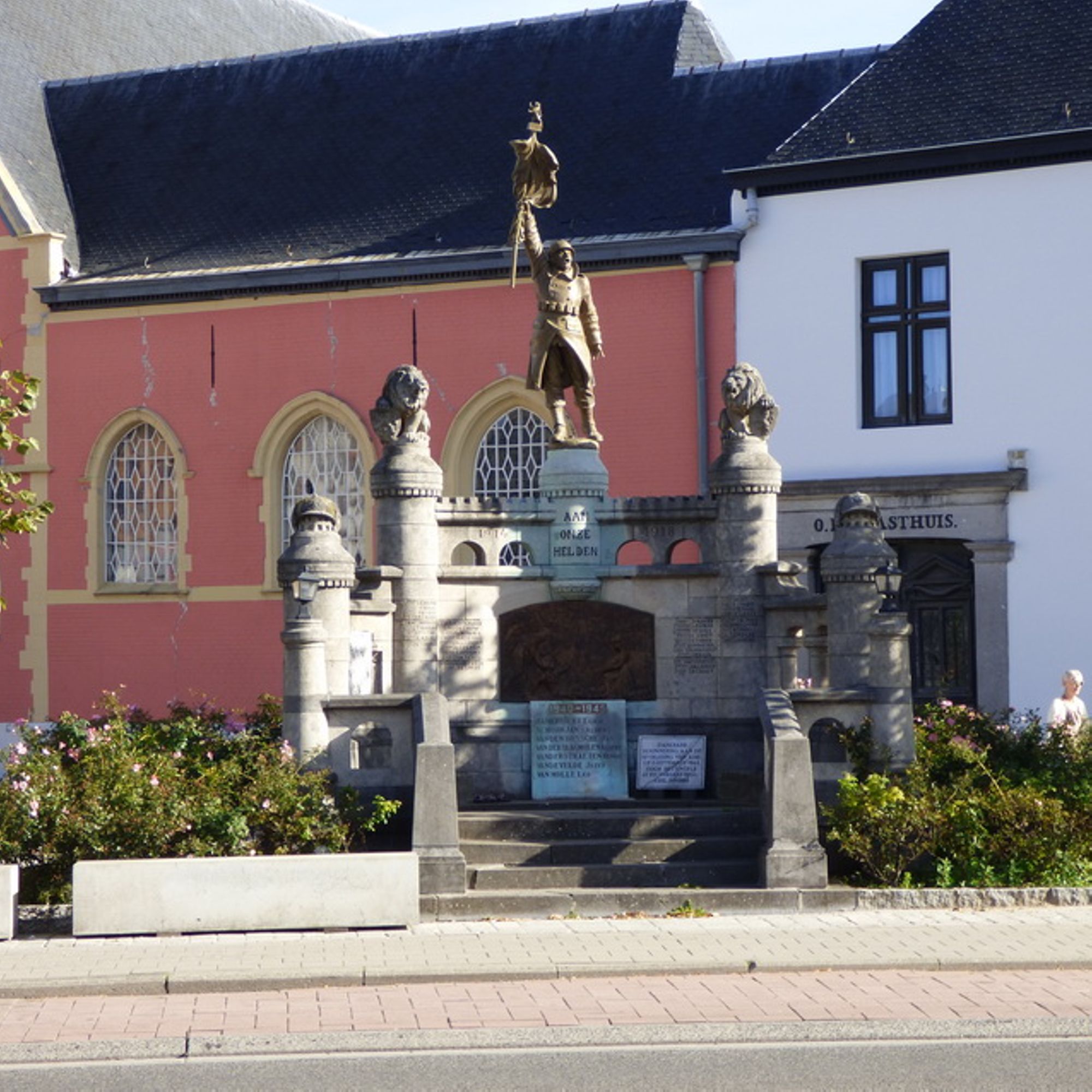 Monument en arc de cercle avec des colonnes, flanqué de deux lions et de casques, construit en pierre bleue avec un piédestal surmonté d'un soldat triomphant en bronze tenant un drapeau.