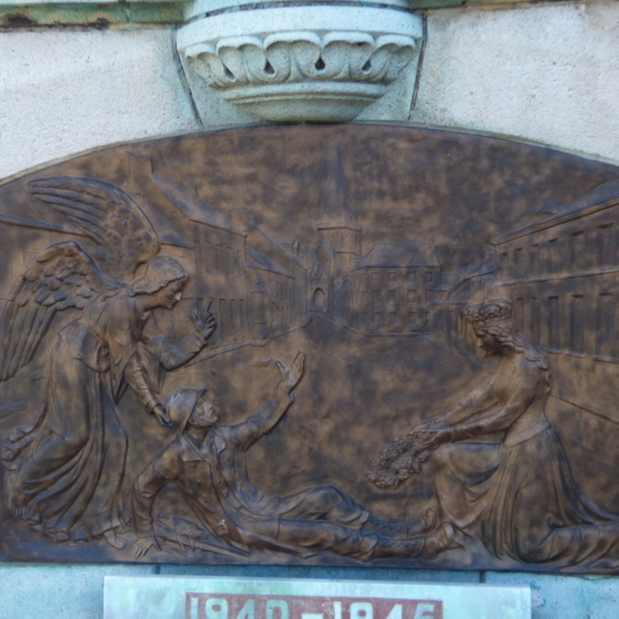 Au centre du monument se trouve un bas-relief en fonte représentant un soldat blessé, soutenu par un ange. Une femme couronnée s'agenouille à ses pieds, offrant au soldat une guirlande de fleurs.