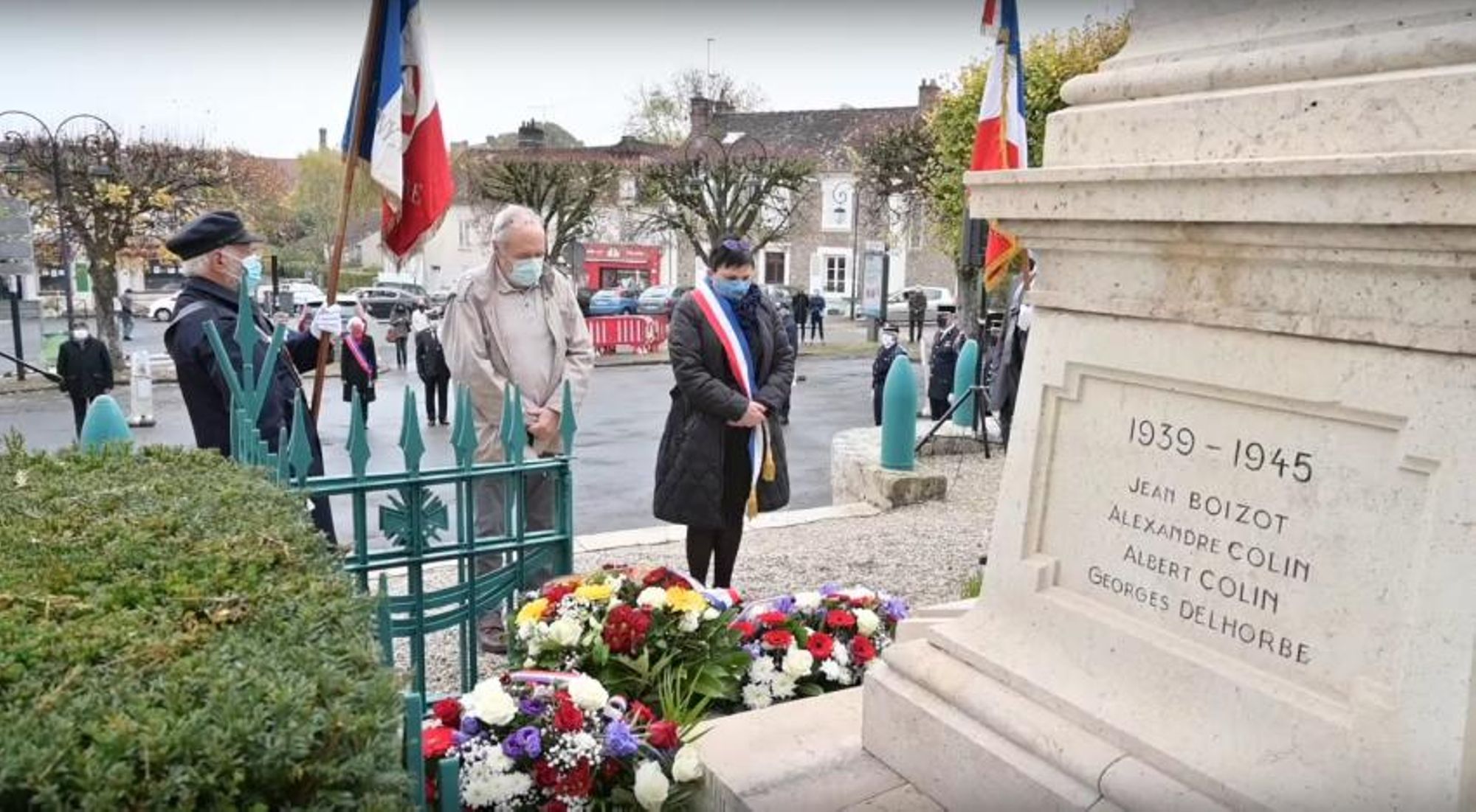 Le 11 novembre dernier, après avoir déposé une gerbe devant les stèles du souvenir de Noisement et de Plessis-le-Roi, MM. Mouton et Trouvé déposent une gerbe au pied du monument aux morts du bourg