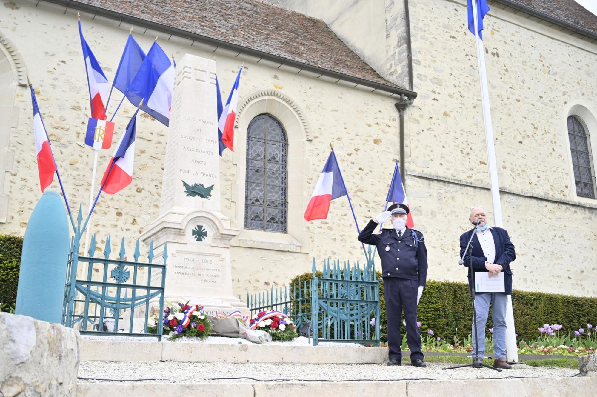 Cérémonie de commémoration de la journée nationale du souvenir des victimes et des héros de la déportation, place de l’église du Bourg, en présence de Marie-Line Pichery, maire de Savigny-le-Temple, Éric Bareille, conseiller départemental du canton, du commissaire de police nationale de Savigny, du commandant des pompiers de Savigny, des élus municipaux, du député de la 11ème circonscription de Seine-et-Marne, ainsi que des deux associations d’anciens combattants que compte la ville