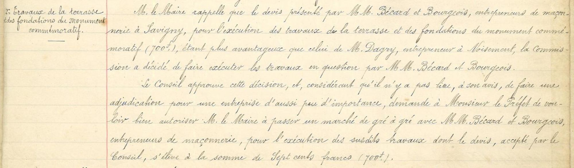 devis de 700 francs de MM. Bécard et Bourgeois, entrepreneurs de maçonnerie à Savigny, pour l'exécution des travaux de la terrasse et des fondations du monument commémoratif