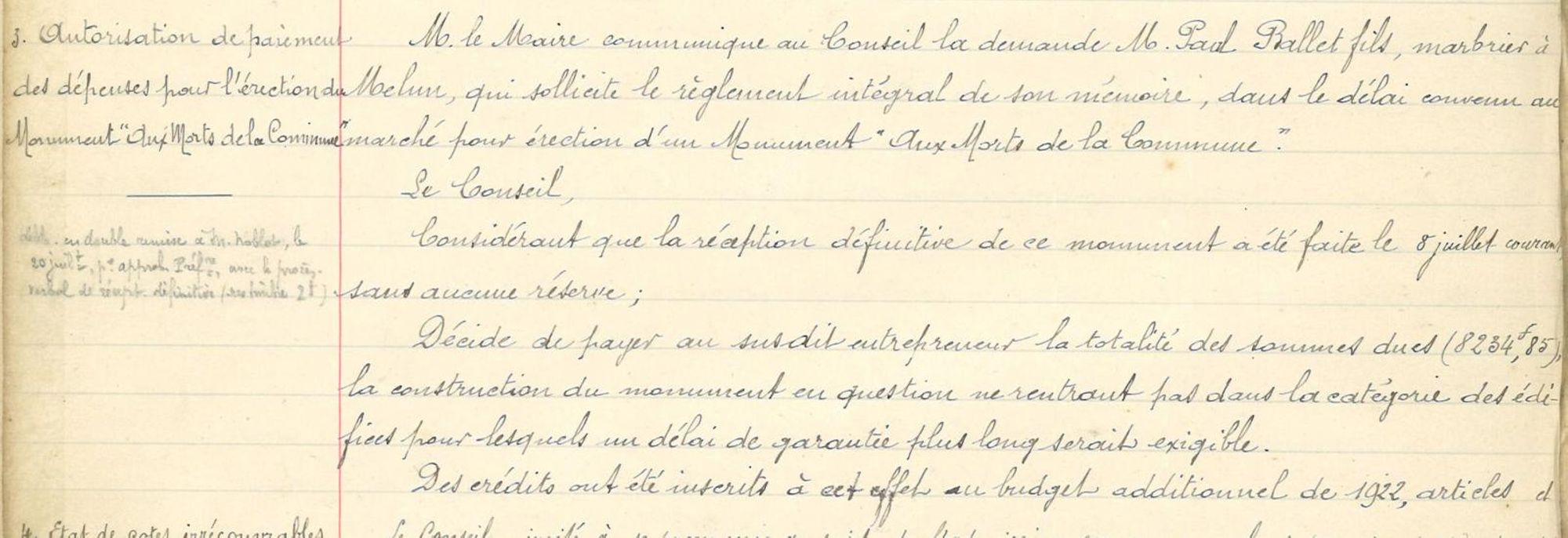 * facture de M. Paul Ballet fils : 8 234,85 francs (mandatée le 20/07/1922)