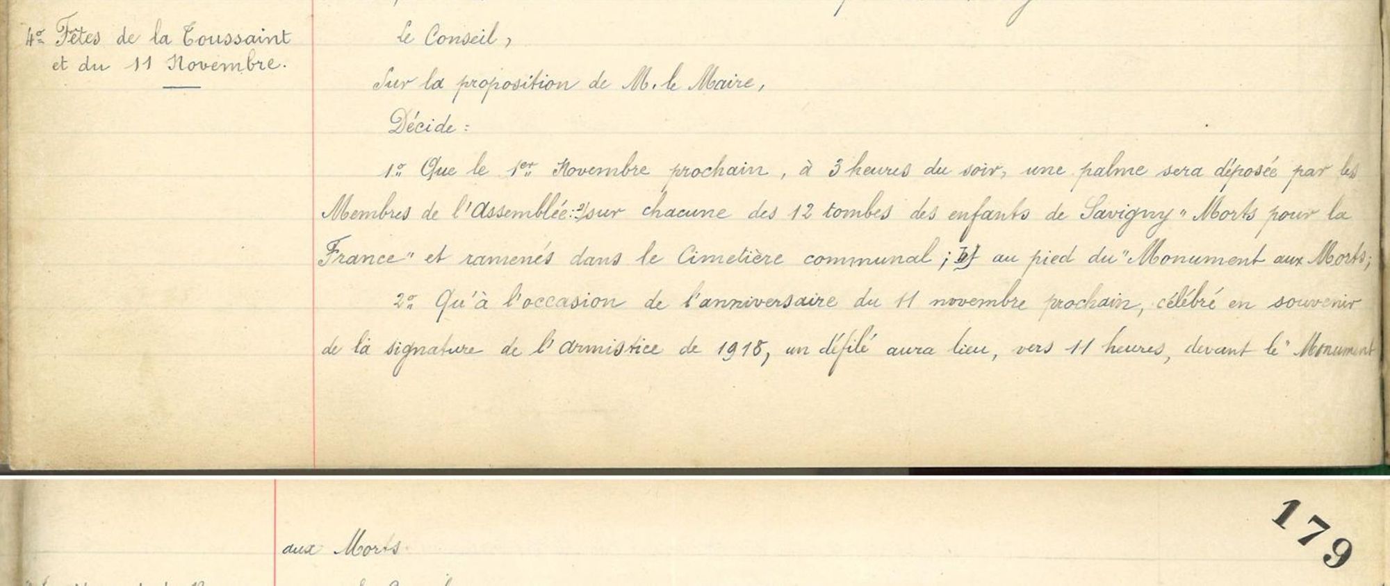 * le 1er novembre, à 3h du soir, une palme sera déposée par les Membres de l'Assemblée sur chacune des 12 tombes des enfants de Savigny "Morts pour la France" et ramenés dans le Cimetière communal et une au pied du "Monument aux Morts"