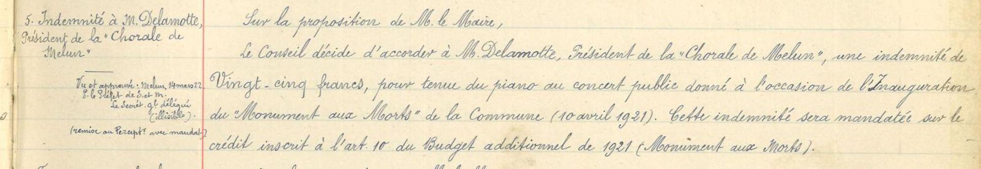Indemnité à M. Delamotte, président de la Chorale de Melun, pour tenu du piano au concert public donné à l'occasion de l'Inauguration du Monument aux Morts de la Commune (10 avril 1921)