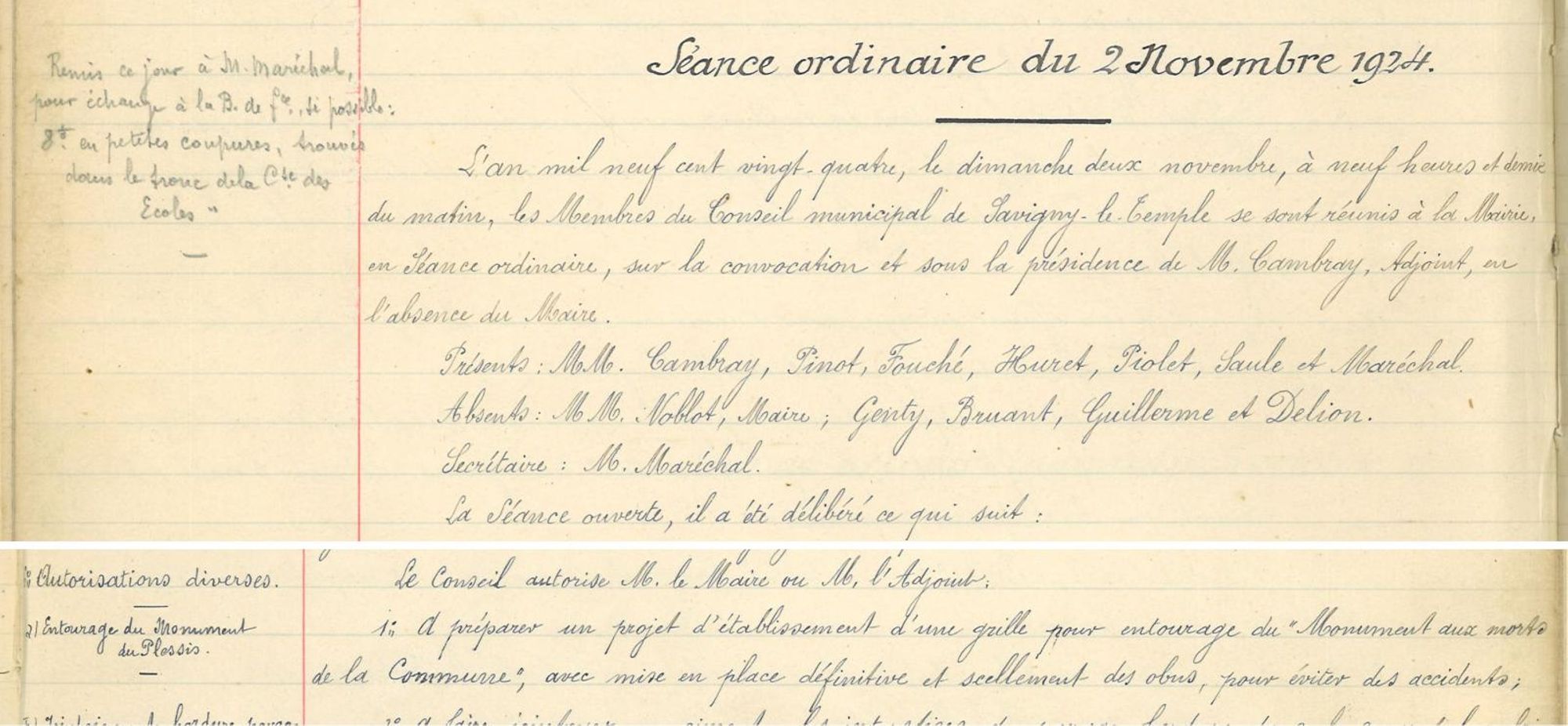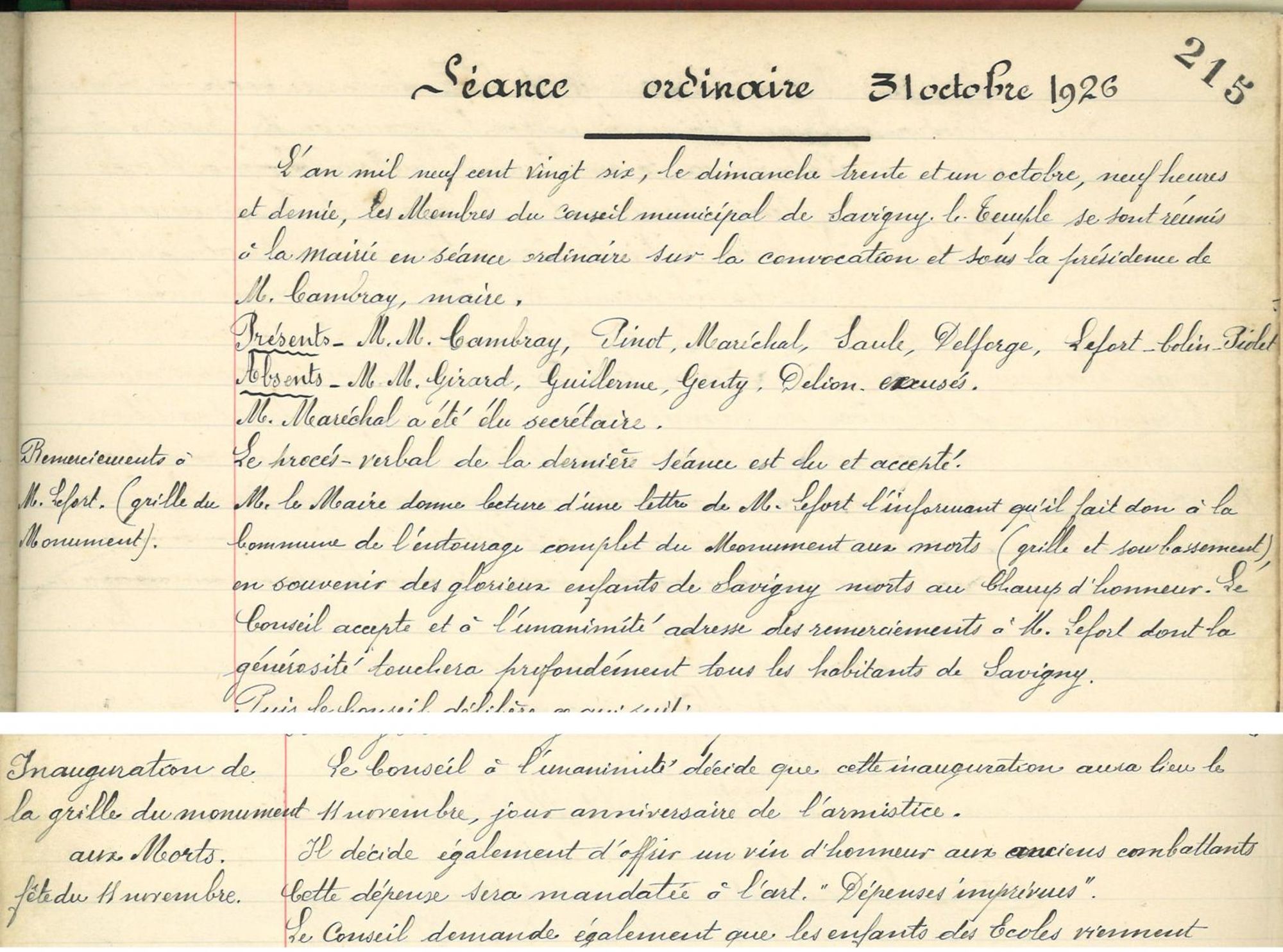 Remerciements adressés à Mr Lefort pour le don de l'entourage complet du Monument aux morts (grille et soubassement) en souvenir des glorieux enfants de Savigny morts au Champ d'honneur