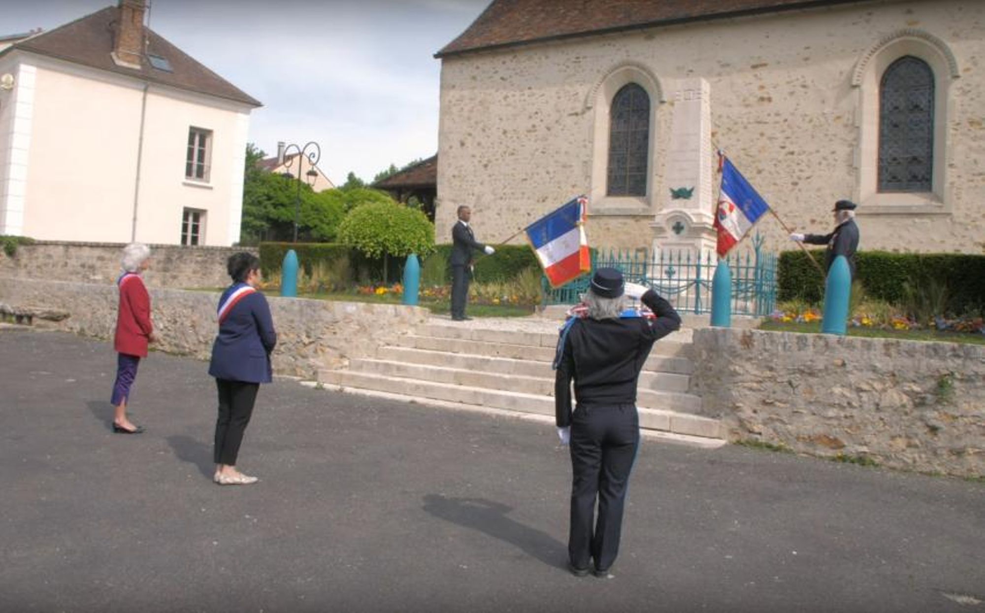 Lors d'une cérémonie restreinte, Mme Le Maire Marie-Line Pichery, Mme La Conseillère Départementale Cathy Bissonnier, Mme la responsable de la police municipale Martine Queinnec et les représentants des associations des anciens combattants commémorent le 8 mai 2020, avec un dépôt de gerbe