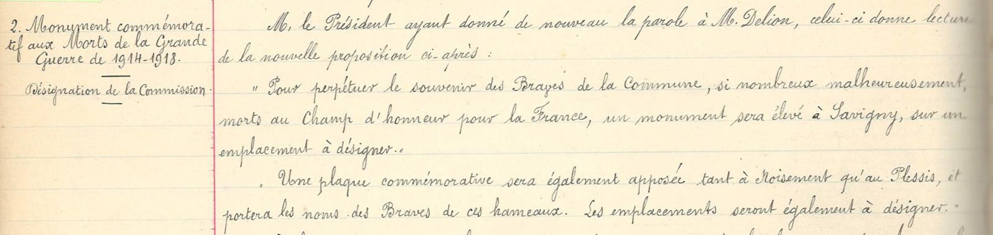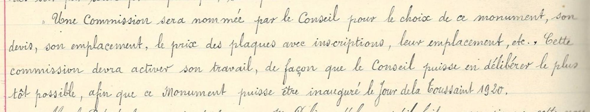 Une Commission sera nommée par le Conseil pour le choix de ce monument, son devis, son emplacement, le prix des plaques avec inscription, leur emplacement, etc. Cette commission devra activer son travail, de façon que le Conseil puisse en délibérer le plus tôt possible, afin que ce Monument puisse être inauguré le jour de la Toussaint 1920