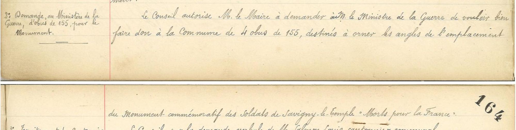 Lors de la séance extraordinaire du 14 octobre 1920, le Conseil autorise M. le Maire a demandé à M. le Ministre de la Guerre de vouloir bien faire don à la Commune de 4 obus de 155, destinés à orner les angles de l'emplacement du Monument commémoratif des soldats de Savigny-le-Temple "Mort pour la France"
