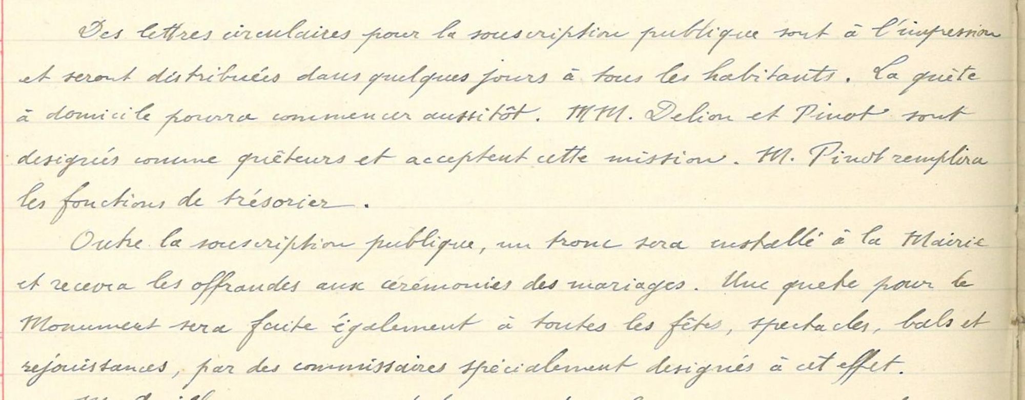 "Des lettres circulaires pour la souscription publique sont à l'impression et seront distribuées dans quelques jours à tous les habitans. La quête à domicile pourra commencer aussitôt. MM. Delion et Pinot sont désignés comme quêteurs et acceptent cette mission. M. Pinot remplira les fonctions de trésorier", "Outre la souscription publique, un tronc sera installé à la Mairie et recevra les offrandes aux cérémonies des mariages. Une quête pour le Monument sera faite également à toutes les fêtes, spectacles, bals et réjouissances, par des commissaires spécialement désignés à cet effet."