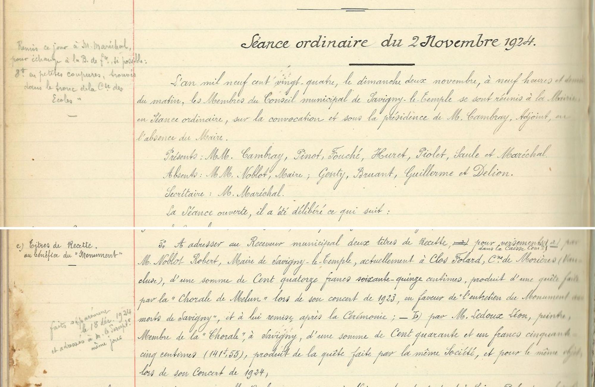 * par M. Noblot Robert, Maire de Savigny-le-Temple, actuellement à Clos Folard, commune de Morières (Vaucluse), d'une somme de cent quatorze francs soixante-quinze centimes, produit d'une quête faite par la "Chorale de Melun" lors de son concert de 1923, en faveur de "l'entretien du Monument aux morts de Savigny", et à lui remise après la Cérémonie